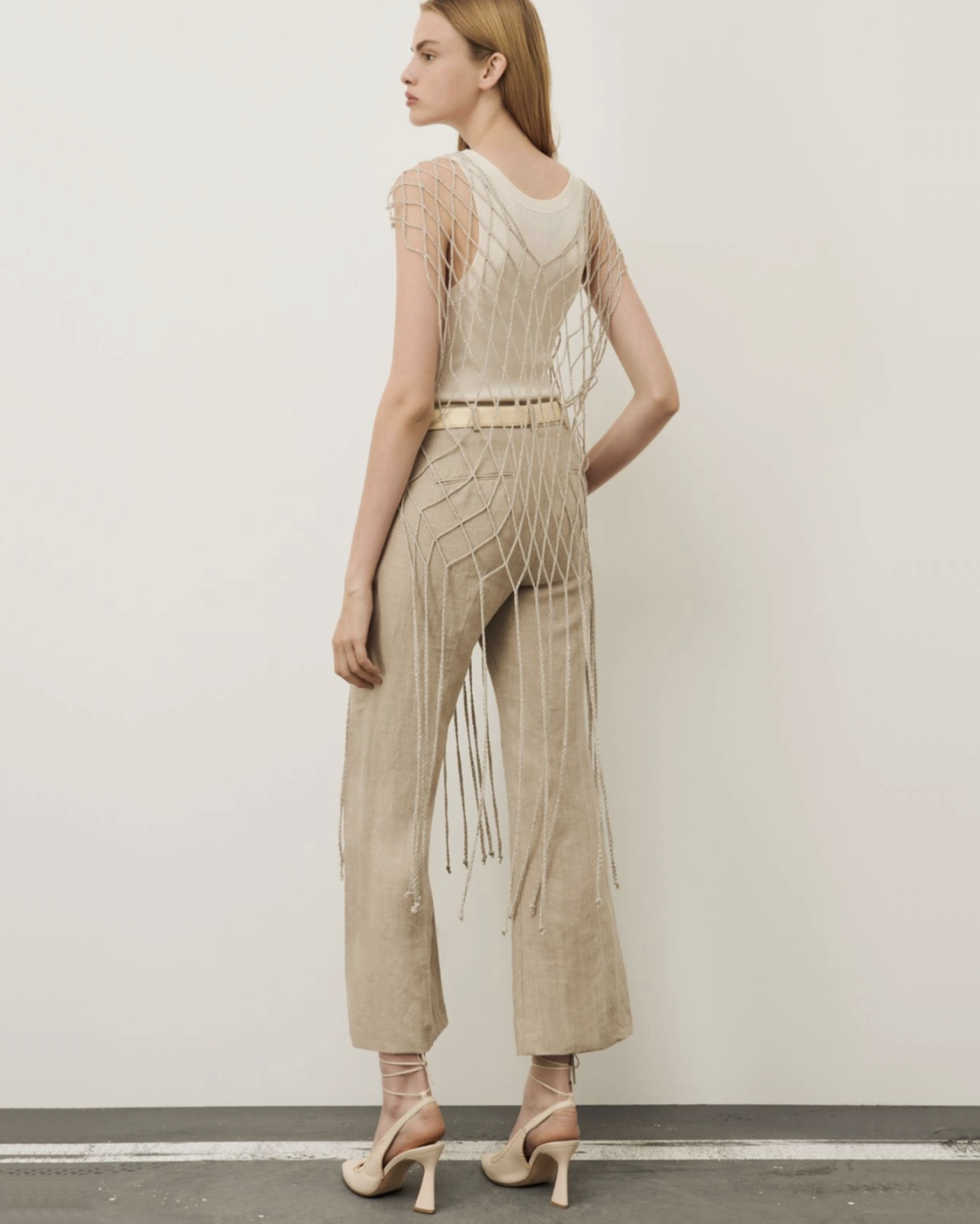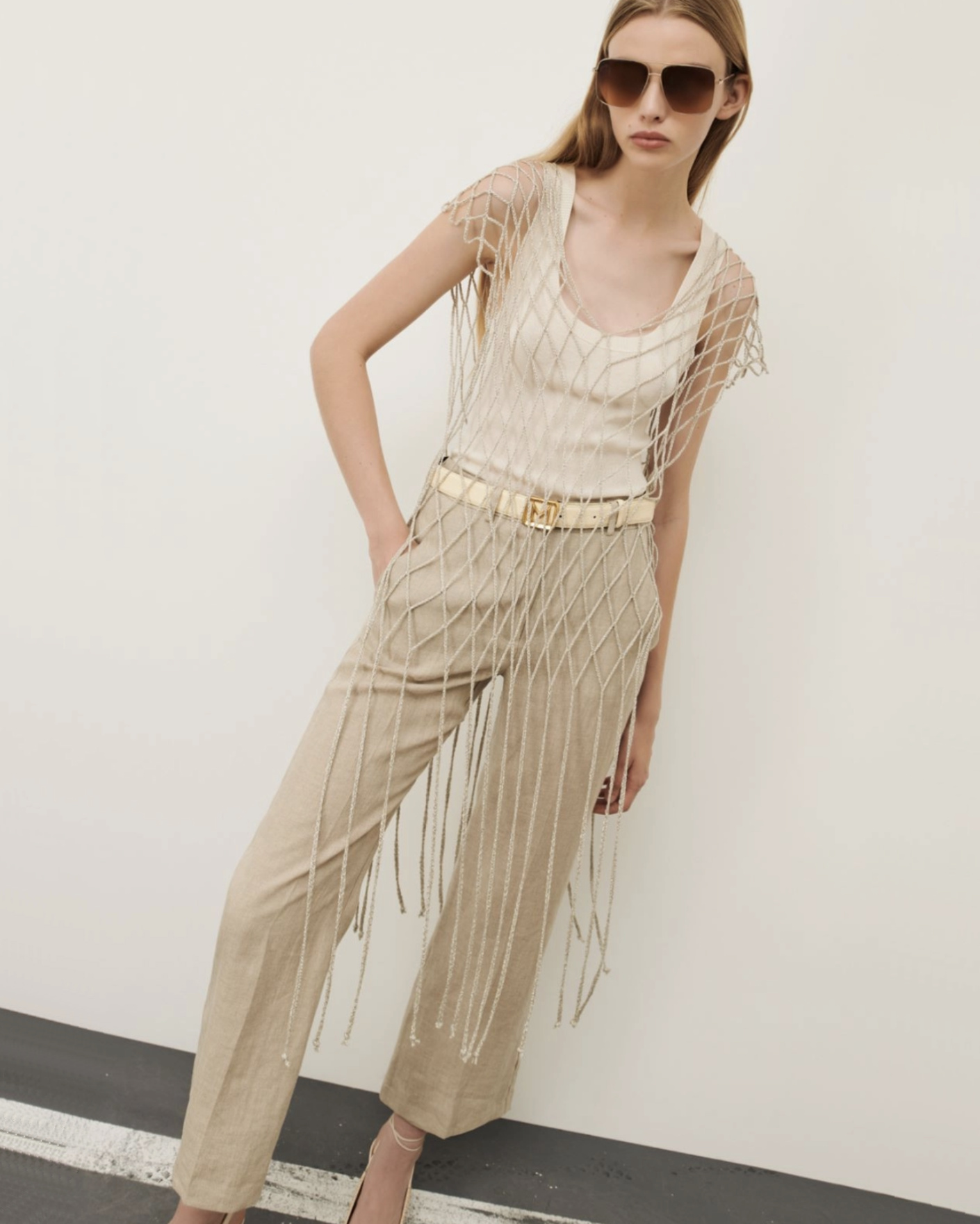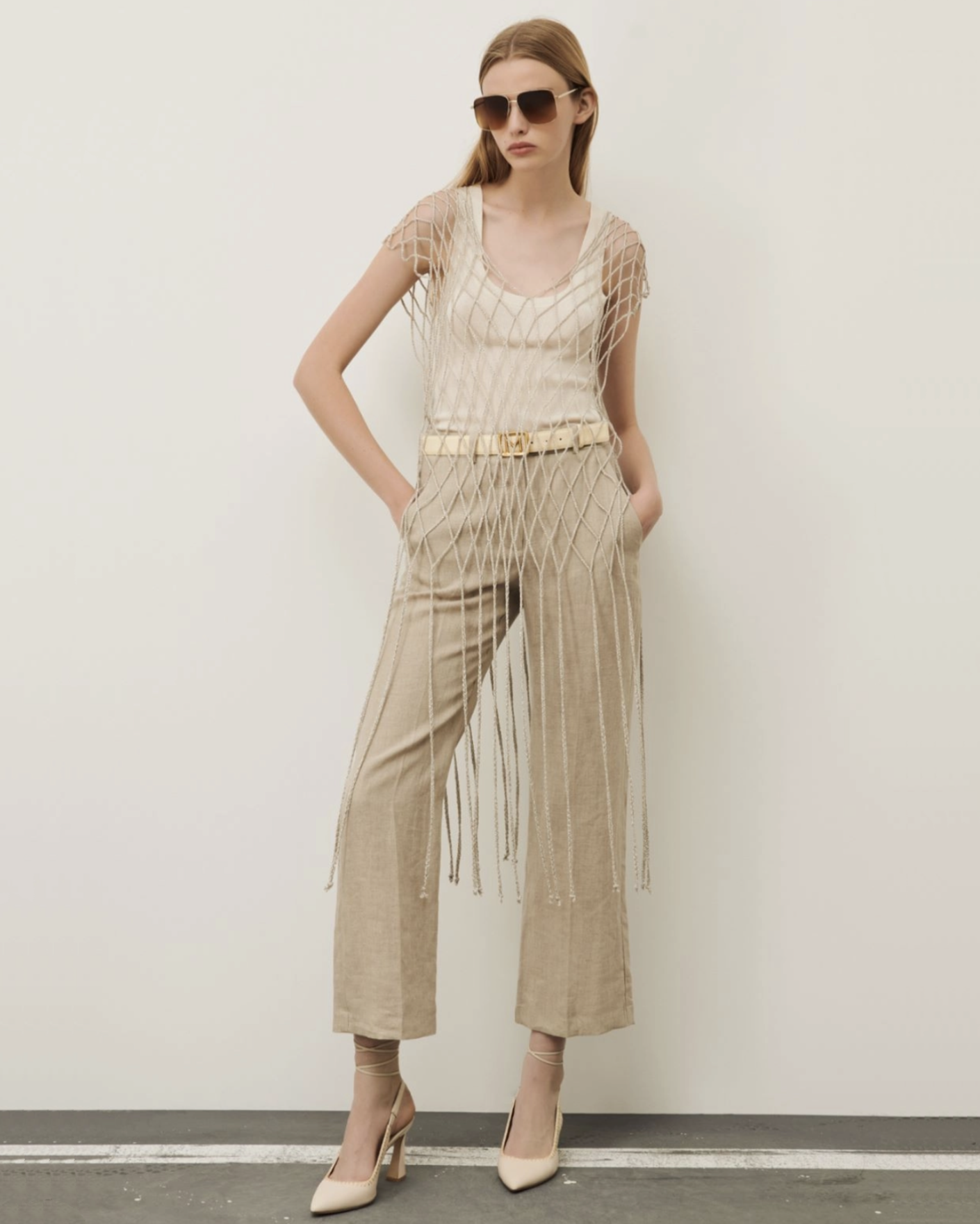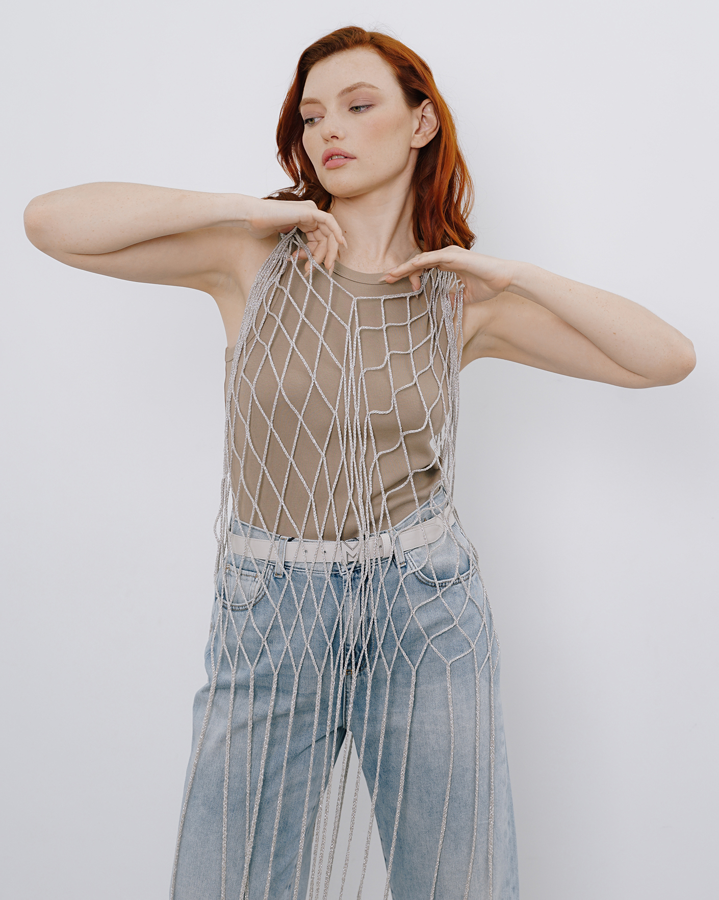 Топ-туника Marella серебристого цвета с люрексом. Модель с V-образным вырезом и бахромой по низу. Топ можно надеть на майку, рубашку, джемпер, юбку и брюки.