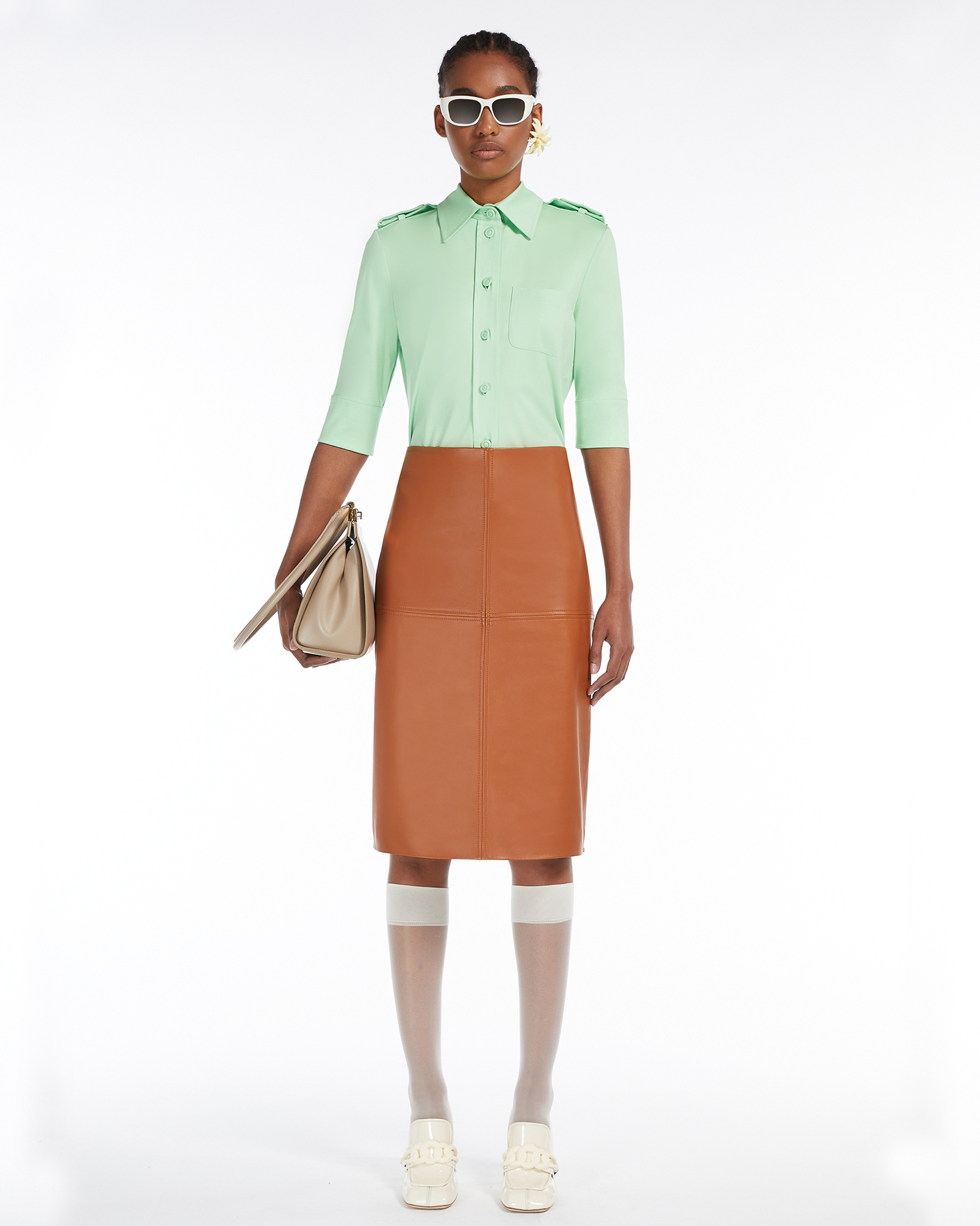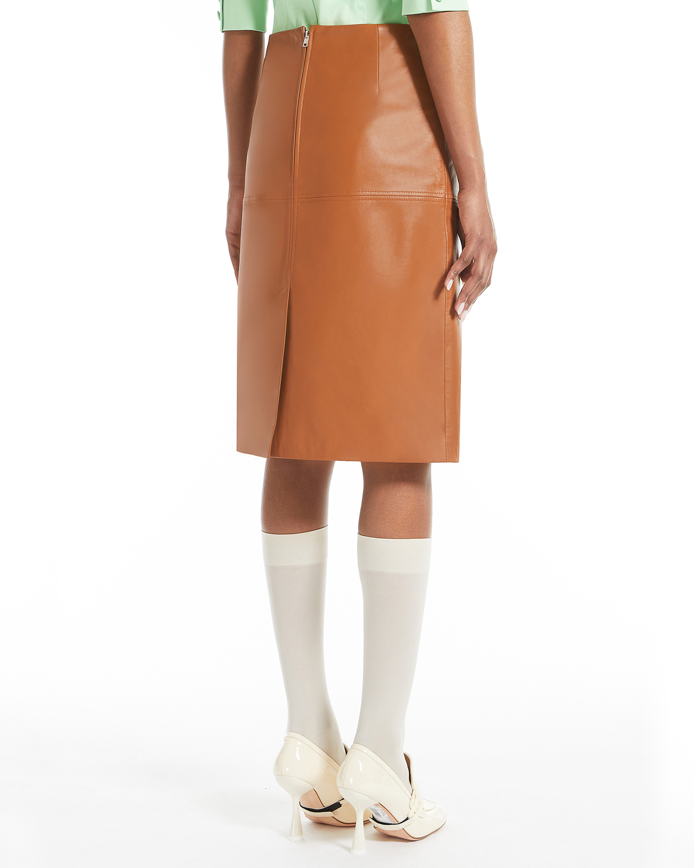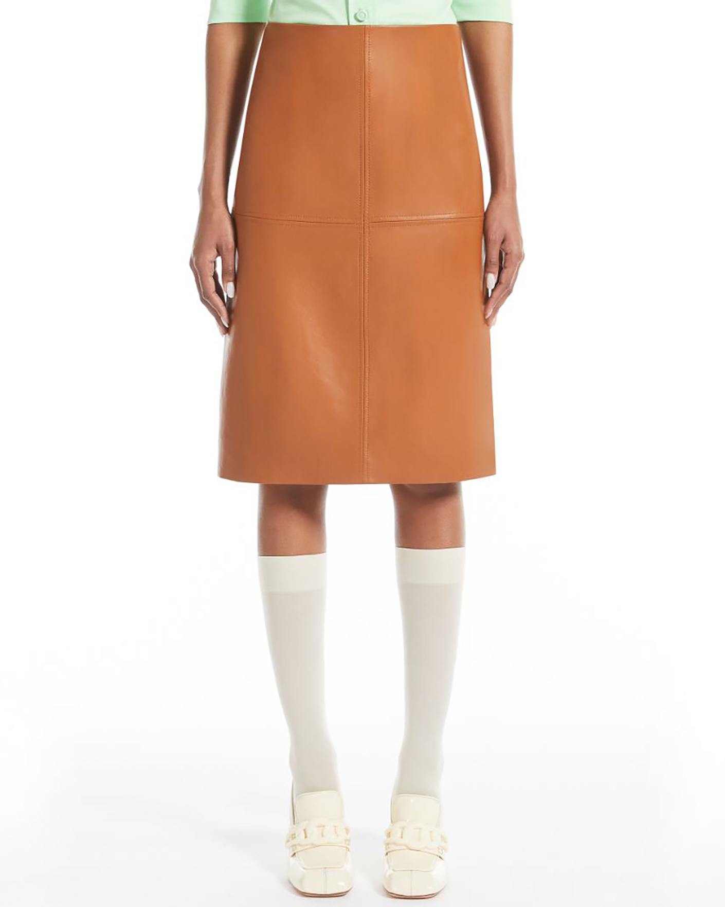 Юбка-карандаш Sportmax орехового цвета выполнена из 100% кожи. Классическая модель идеально подчеркивает фигуру. Юбку-карандаш можно сочетать с футболкой, рубашкой, блузой, джемпером, свитером, кардиганом и жакетом.
