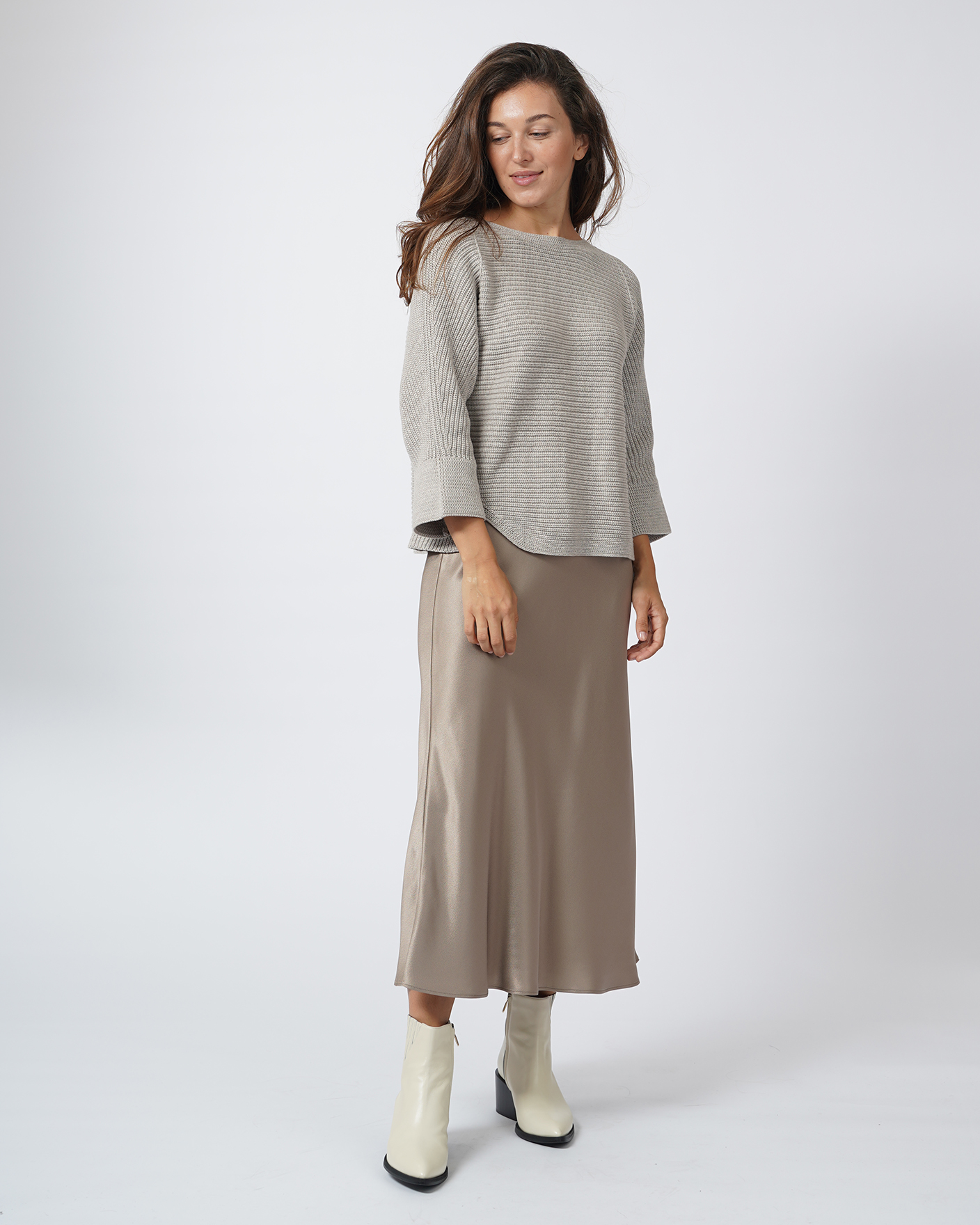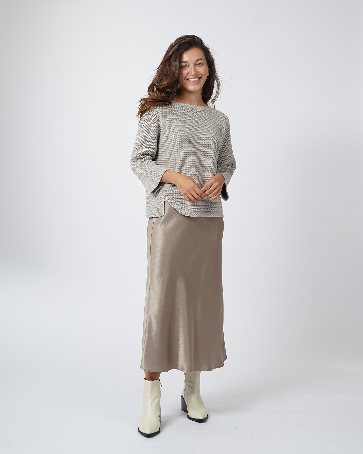 Сатиновая юбка-трапеция серо-бежевого цвета длины миди. Юбку можно сочетать с футболкой, топом, джемпером, свитером, кардиганом и жакетом. Модель сделает любой ваш образ женственным и нежным.