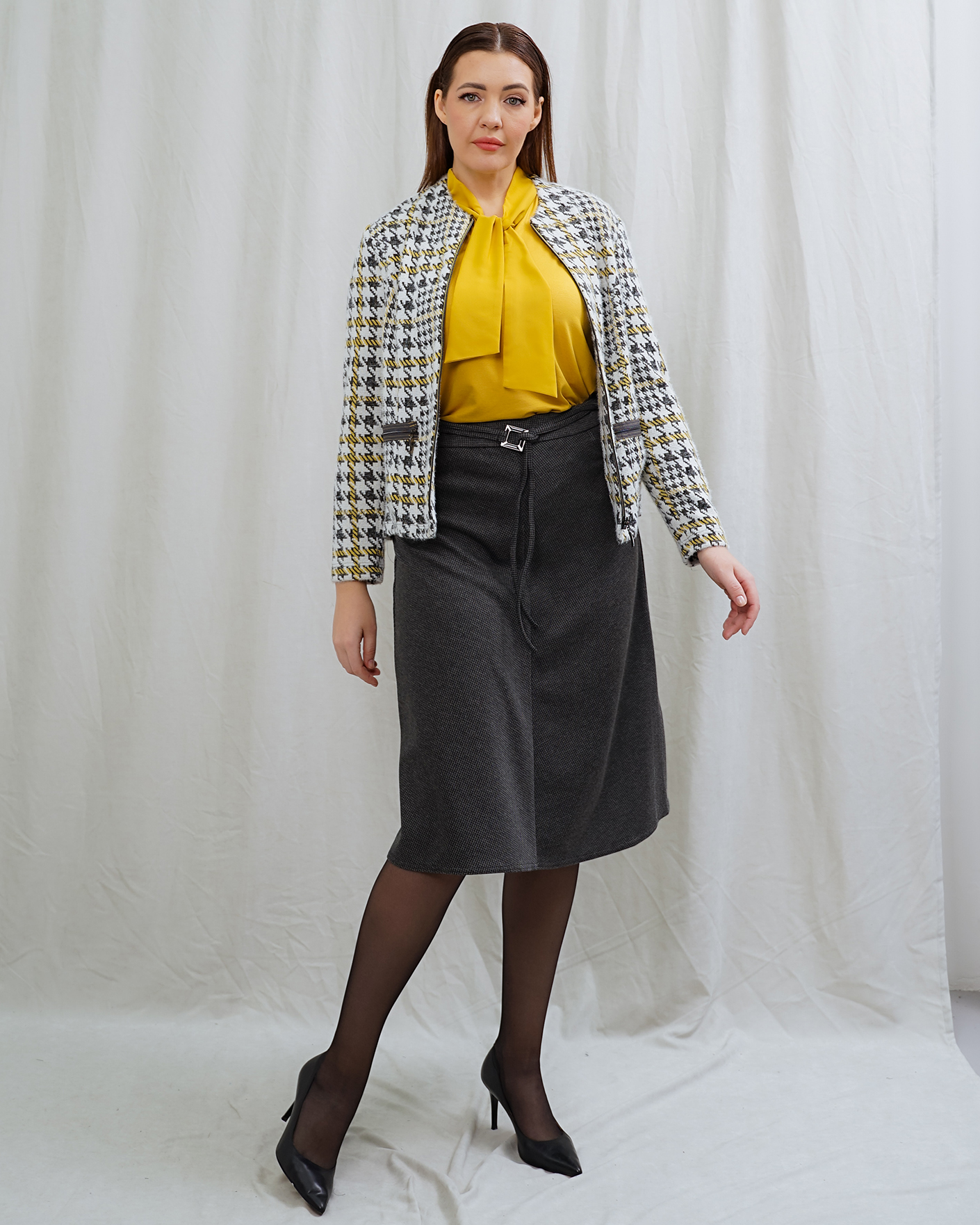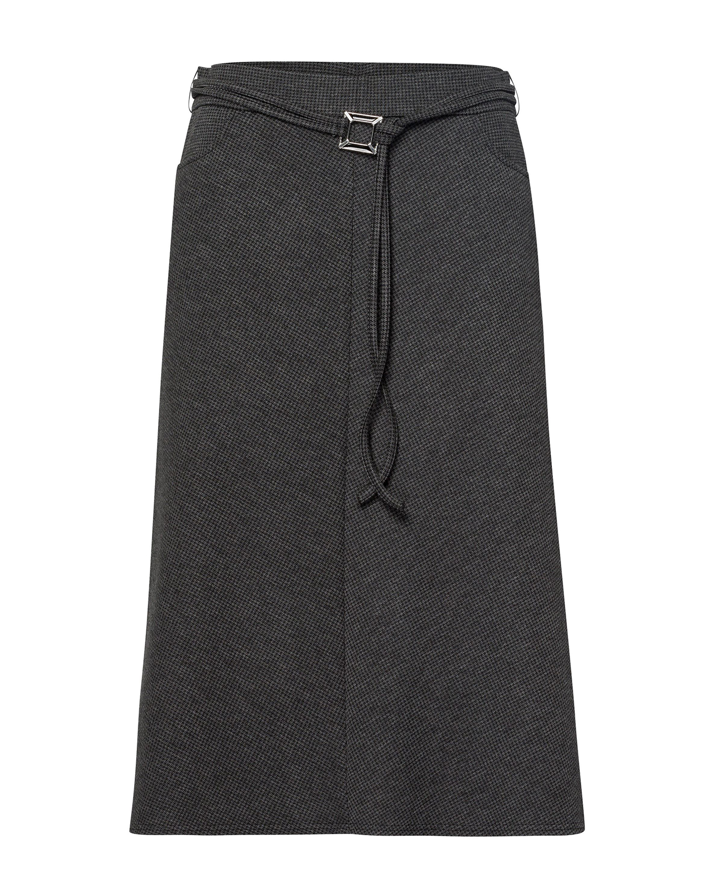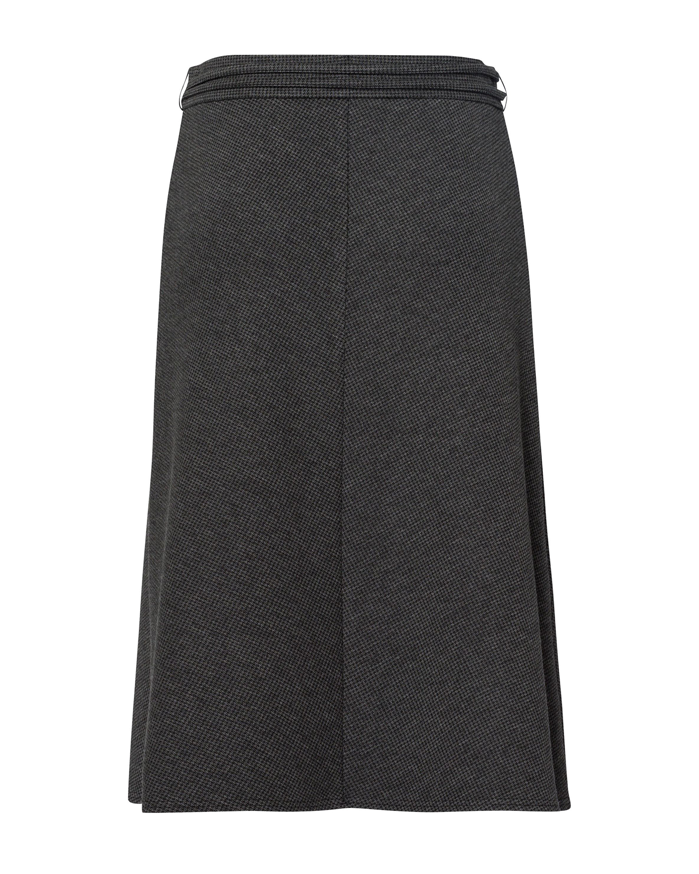 Юбка четырехклинка Frank Walder темно-серого цвета в мелкий рисунок гусиные лапки. Модель А-силуэта с эластичным поясом и втсавным ремешком. Имеются карманы по бокам. Юбку можно сочетать с футболкой, рубашкой, блузой, джемпером, кардиганом, жакетом и жилетом.