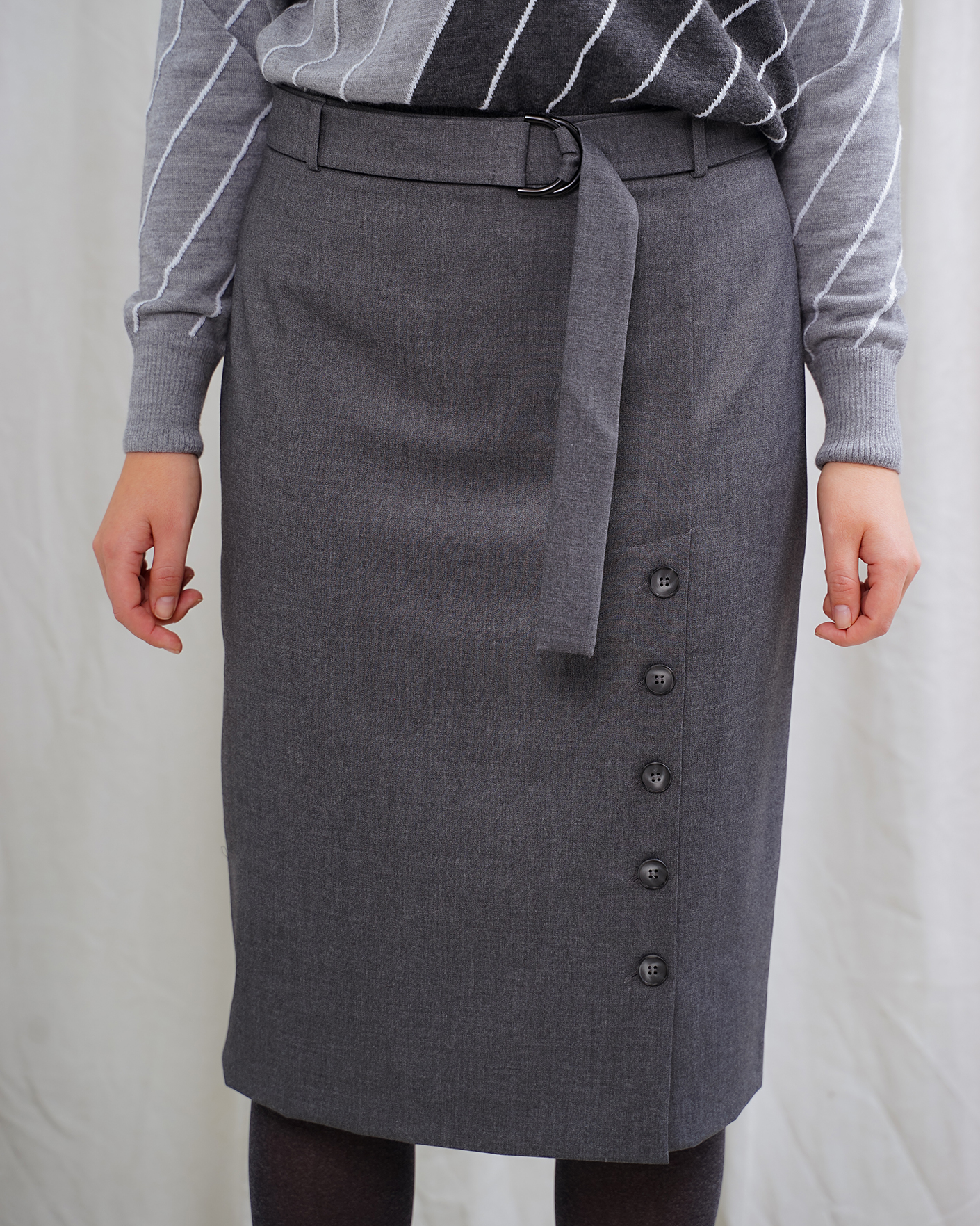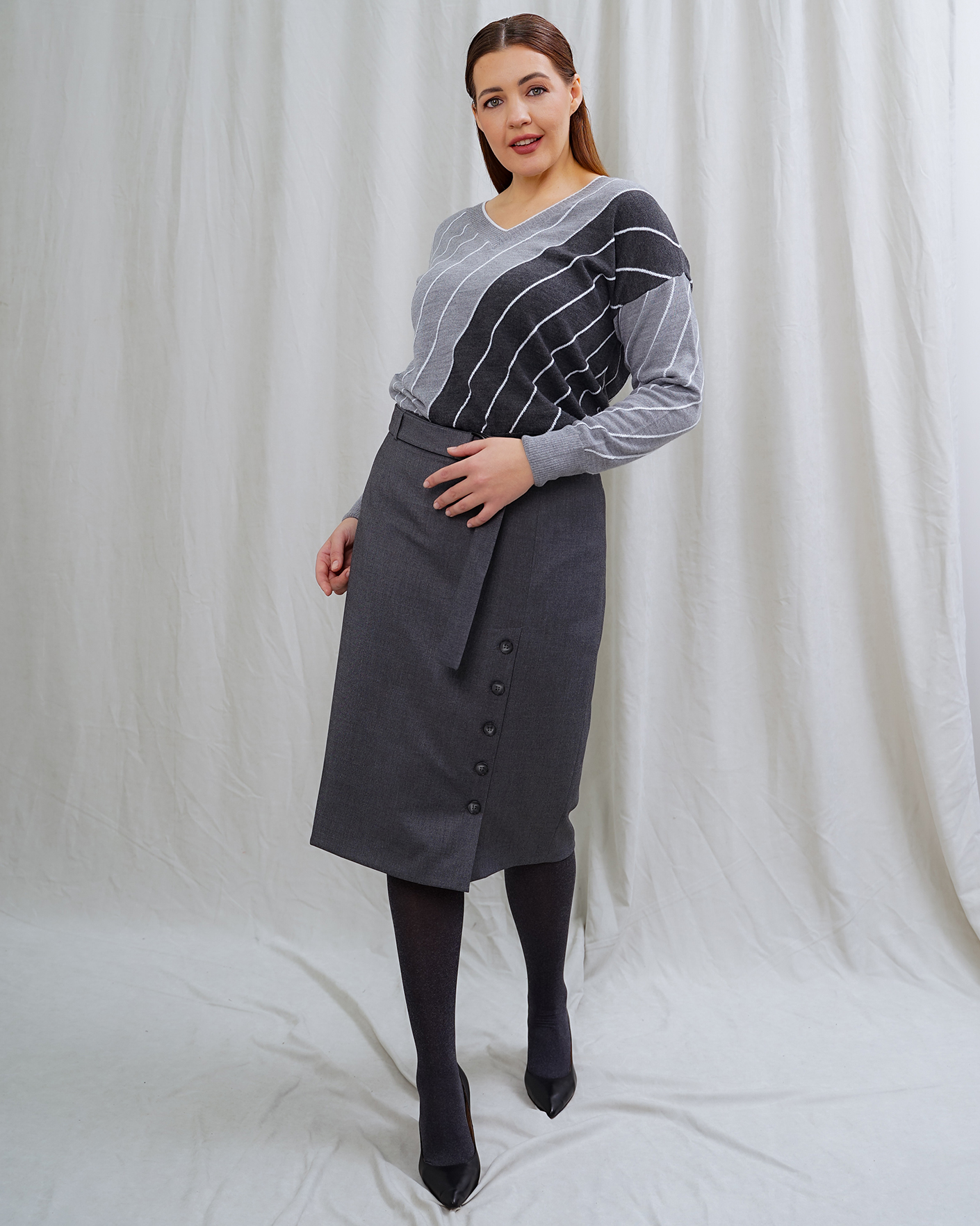 Юбка-карандаш Nelva серого цвета в строчный рисунок. Модель с завышенной талией на вставном поясе в тон, застежк на молнию сзади. Имеется боковой разрез на пуговицах. Юбку-карандаш можно сочетать с любым гардеробом.