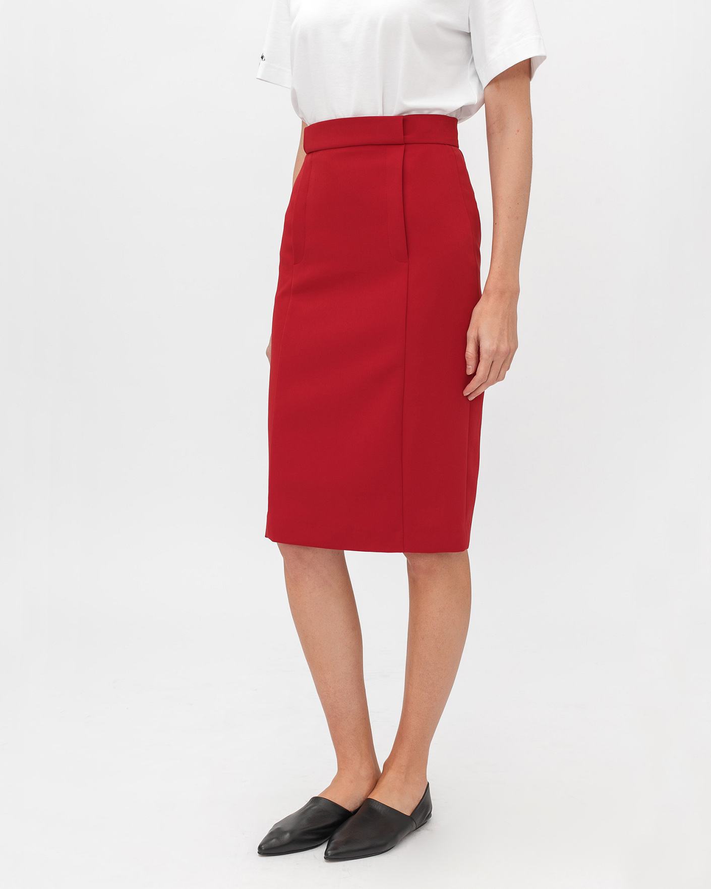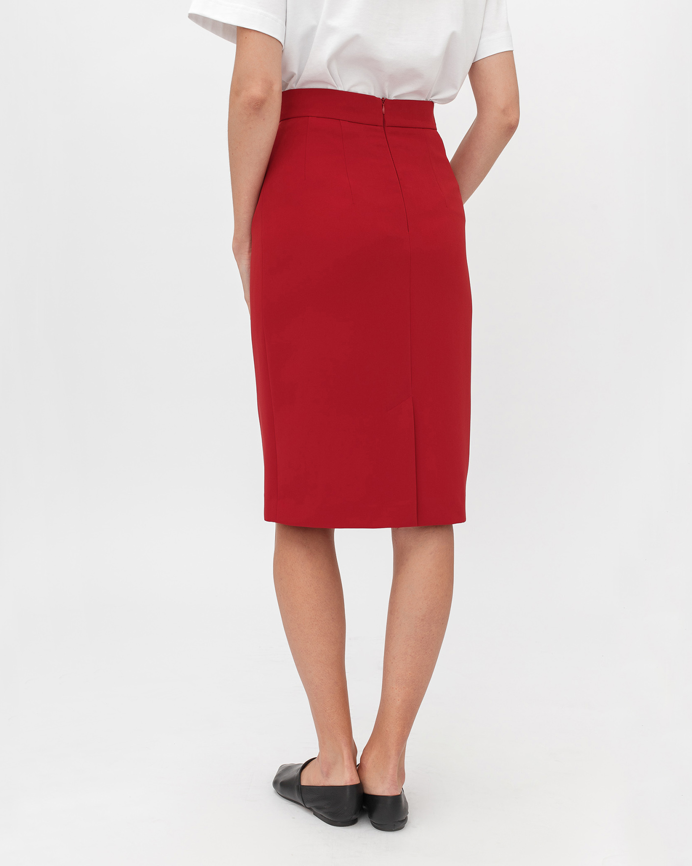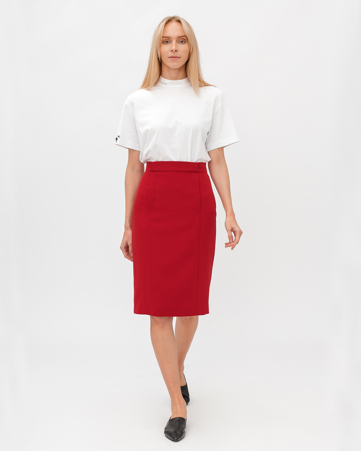 Юбка-карандаш Cuvee красного цвета в мелкий строчный рисунок. Модель с завышенной талией, которая подчеркивает фигуру. Застежка на потайную молнию сзади. Юбку-карандаш можно сочетать с футболкой, рубашкой, блузой, джемпером, жакетом, жилетом и кардиганом.