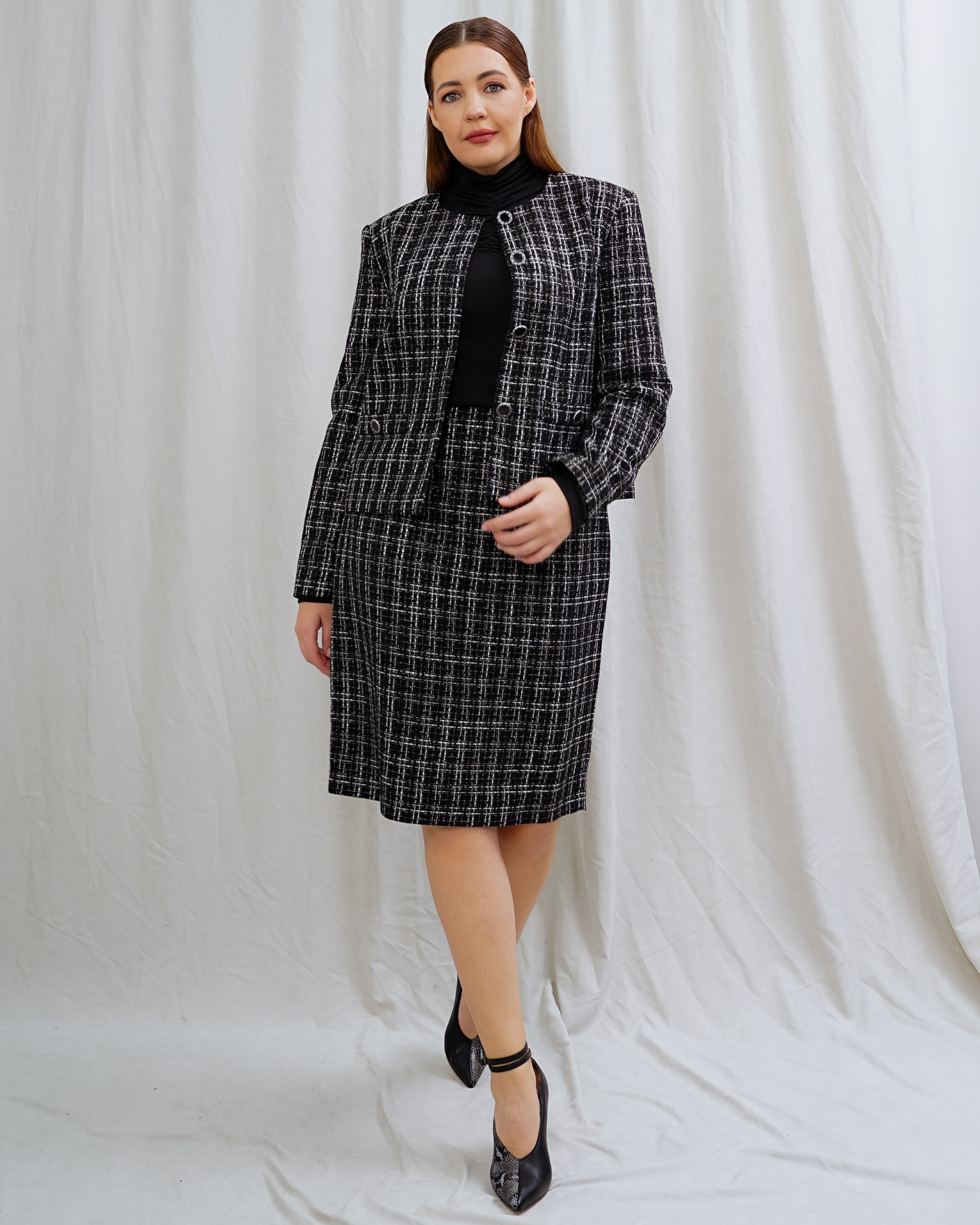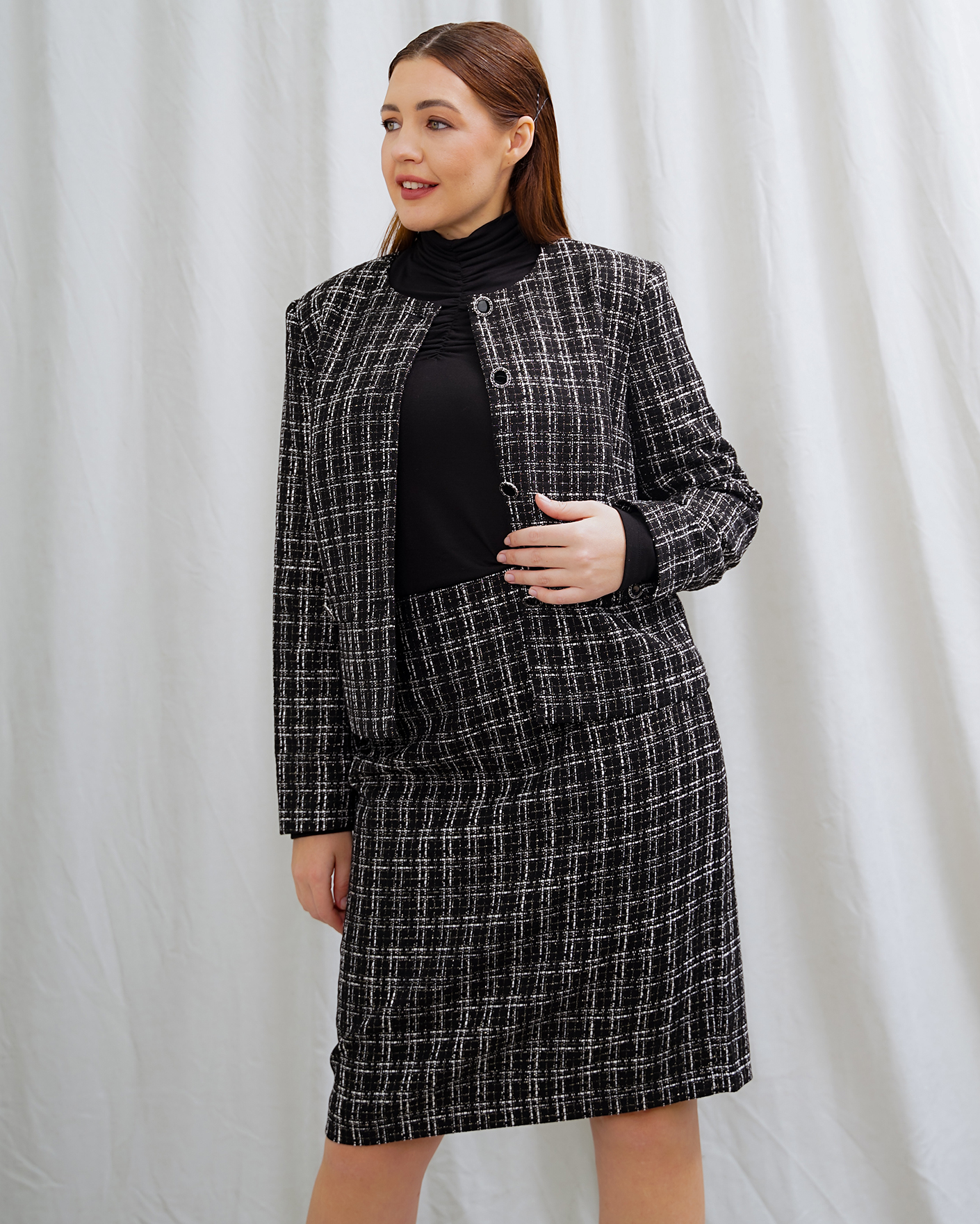 Твидовая юбка-карандаш Nelva бело-черного цвета в клетчатый рисунок. Модель идеально сочетается с рубашкой, водолазкой, блузой, джемпером, жилетом, жакетом и кардиганом.