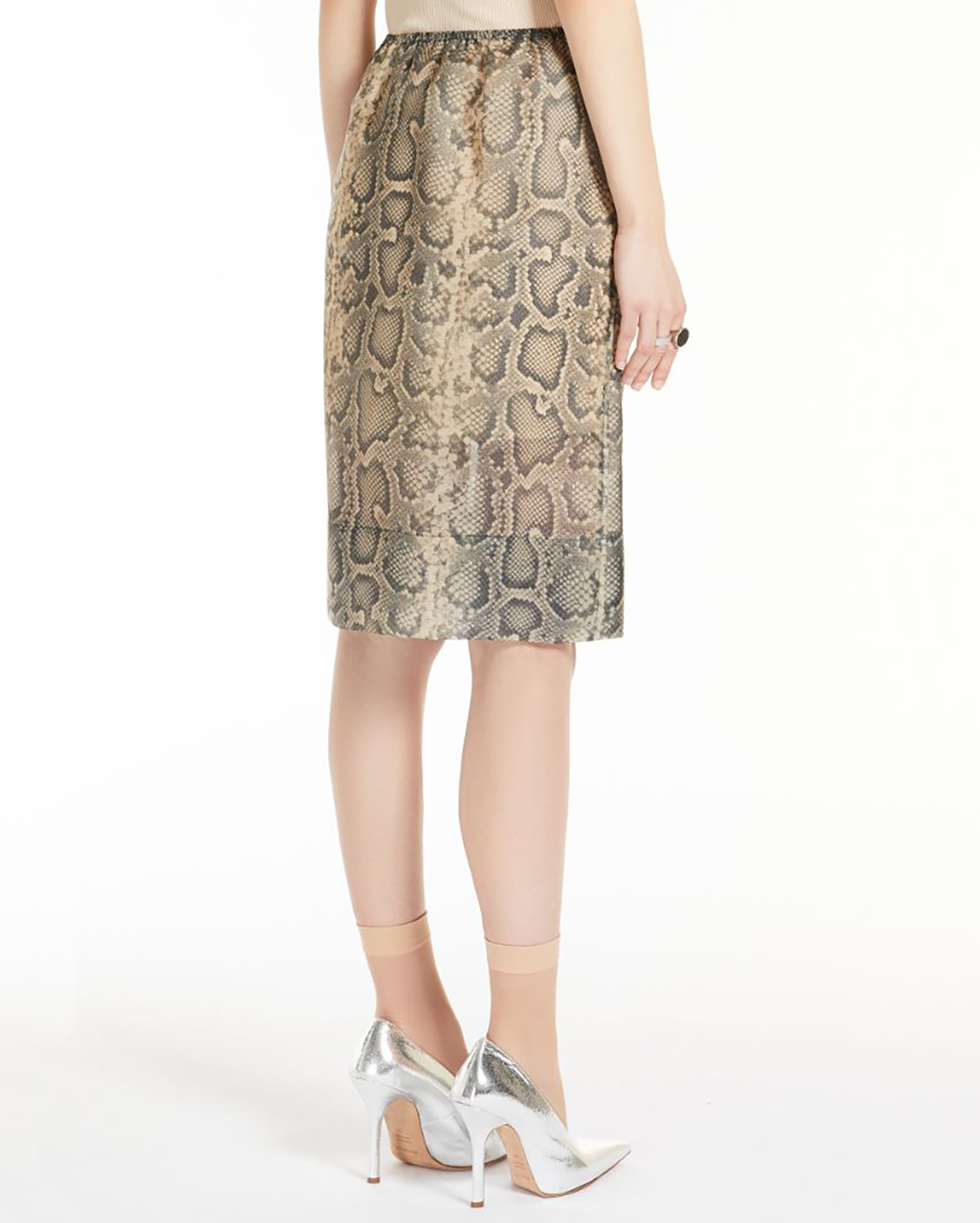 Стильная юбка-карандаш Sportmax серо-бежевого цвета в принт змеиной кожи. Полупрозрачная модель с подкладом, узкий эластичный пояс обеспечивает комфортную посадку. Юбку можно сочетать с топом, футболкой, водолазкой, рубашкой, джемпером, жакетом, кардиганом.