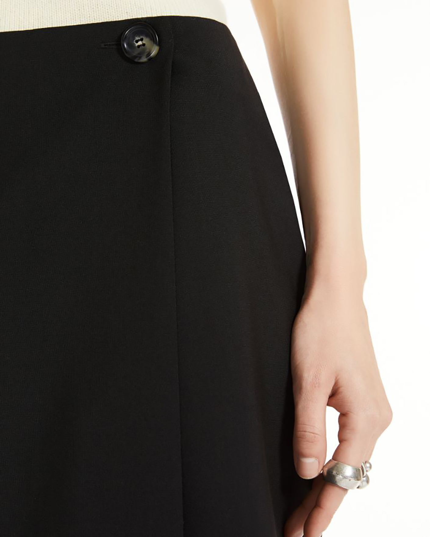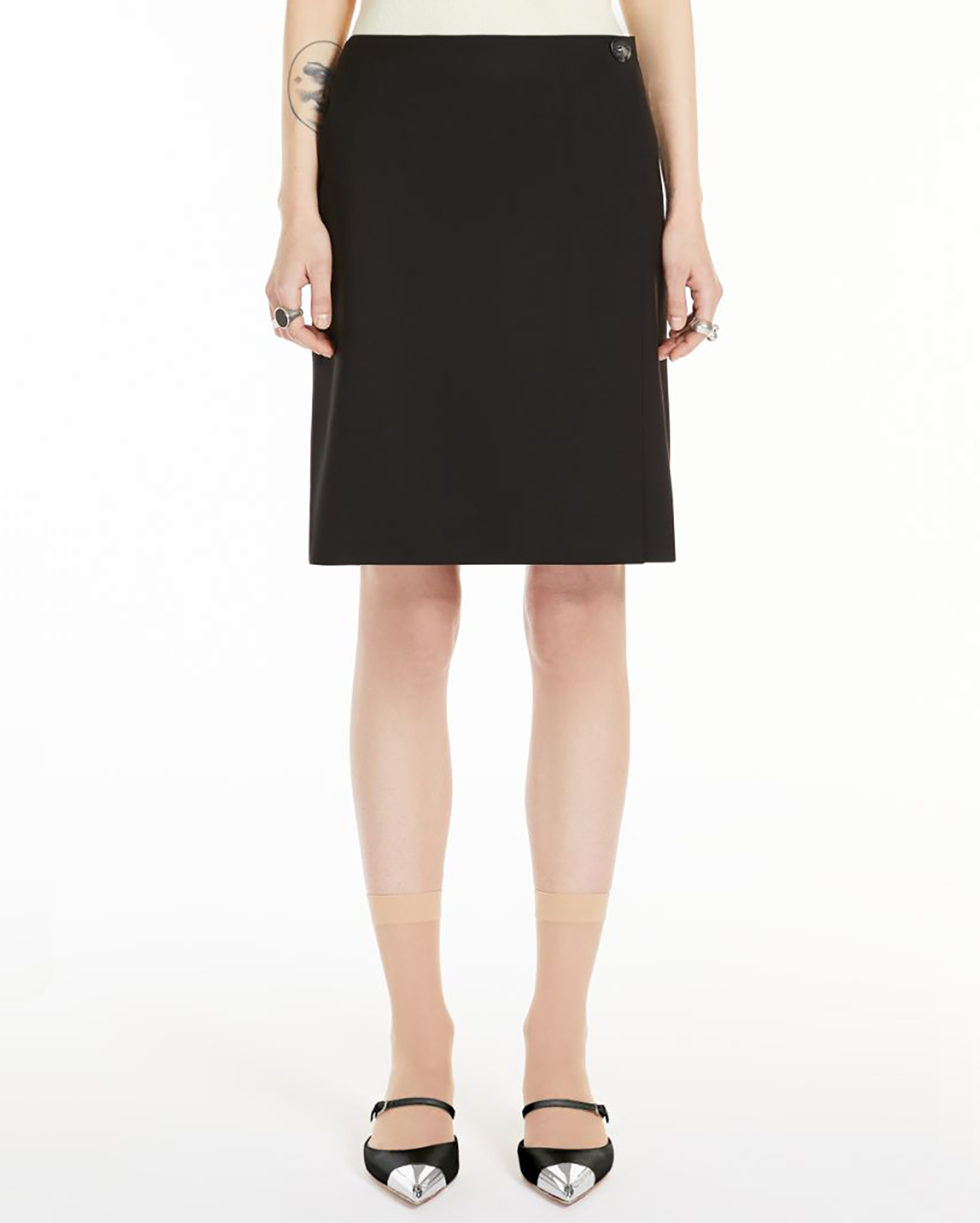 Стильная юбка-трапеция Sportmax черного цвета выполнена из 100% шерсти. Модель на запахе с застежкой на пуговицу, имеются обманные клапаны сзади. Юбку можно сочетать с топом, футболкой, рубашкой, блузой, джемпером, кардиганом и жакетом.