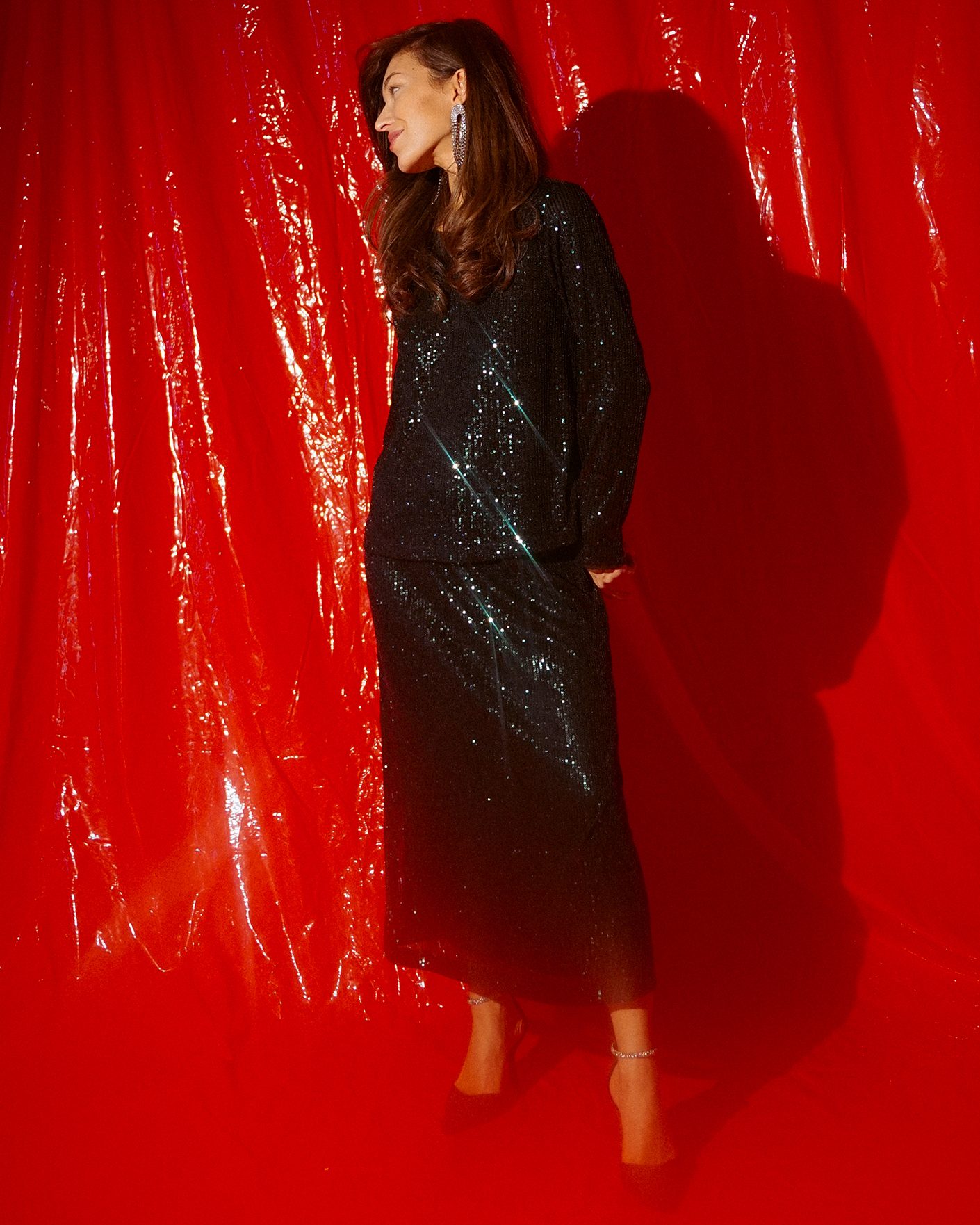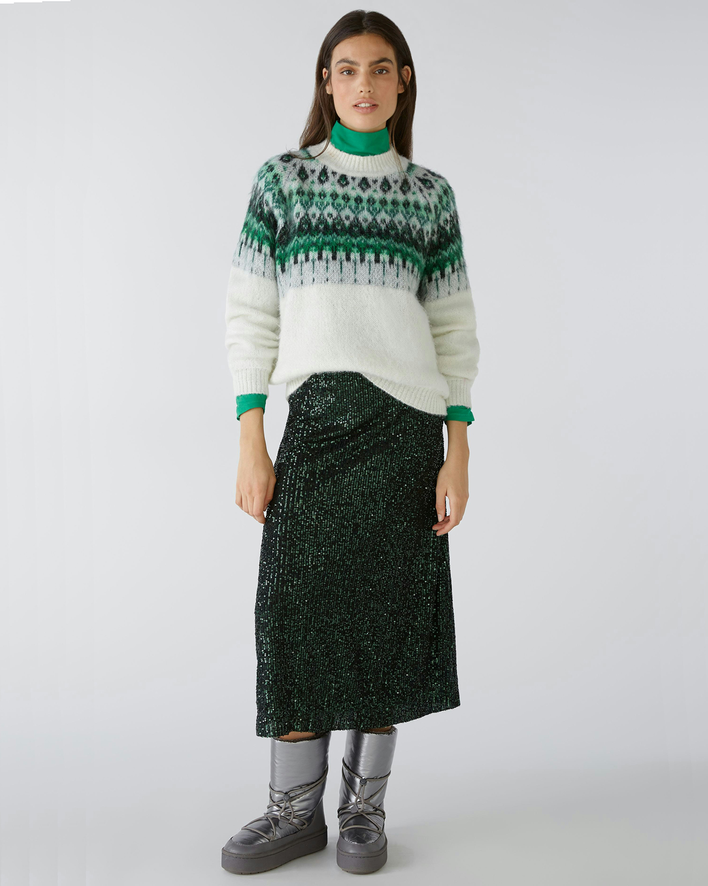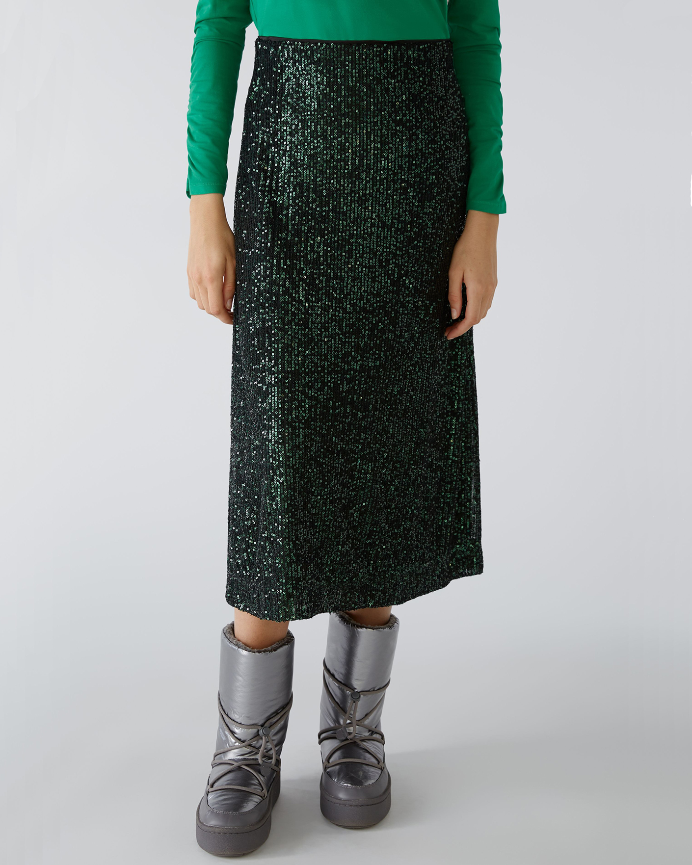 Тренд сезона - юбка OUI в пайетках. Модель зеленого цвета, на эластичном поясе, длина миди. Современная юбка станет фаворитом вашего гардероба.