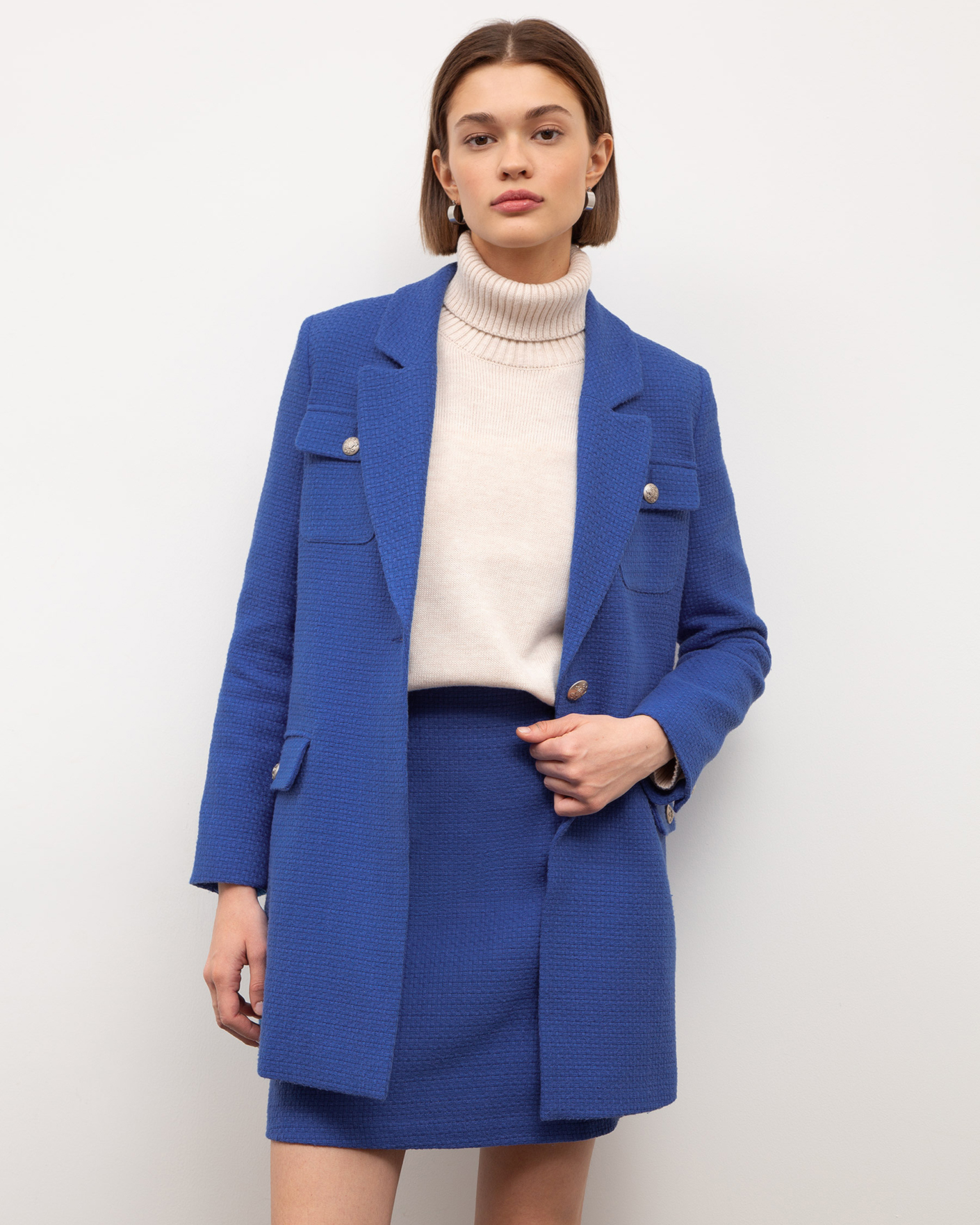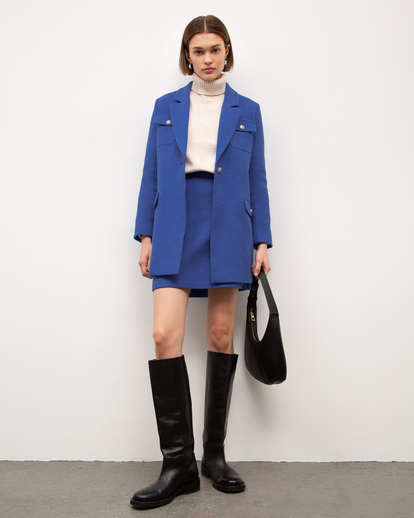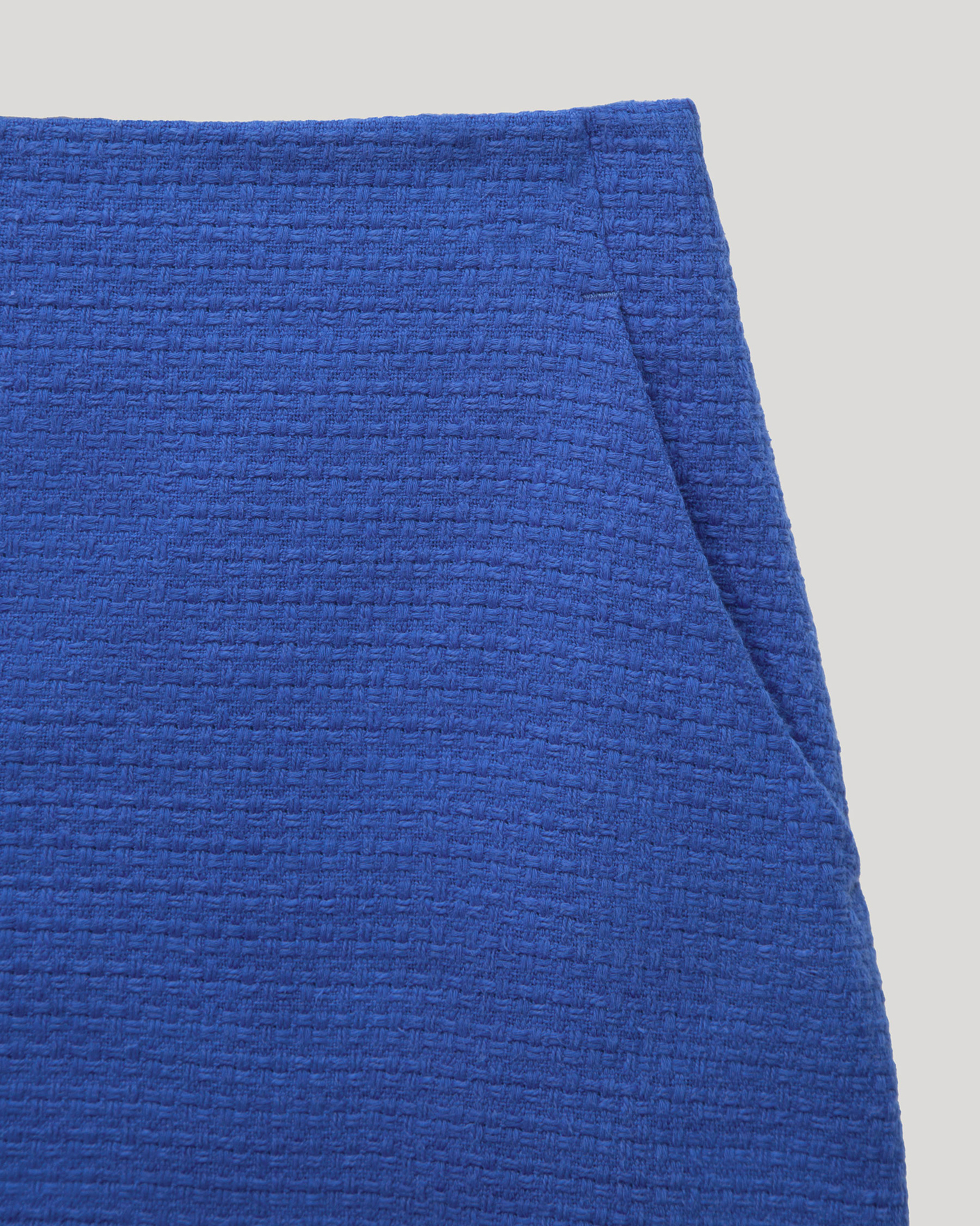 Юбка-трапеция Emka синего цвета выполнена из фактурного 100% хлопка. Модель с высокой посадкой, застежка на потайную молнию сзади, имеются врезные карманы по бокам. Юбка-трапеция станет фаворитом вашего гардероба.