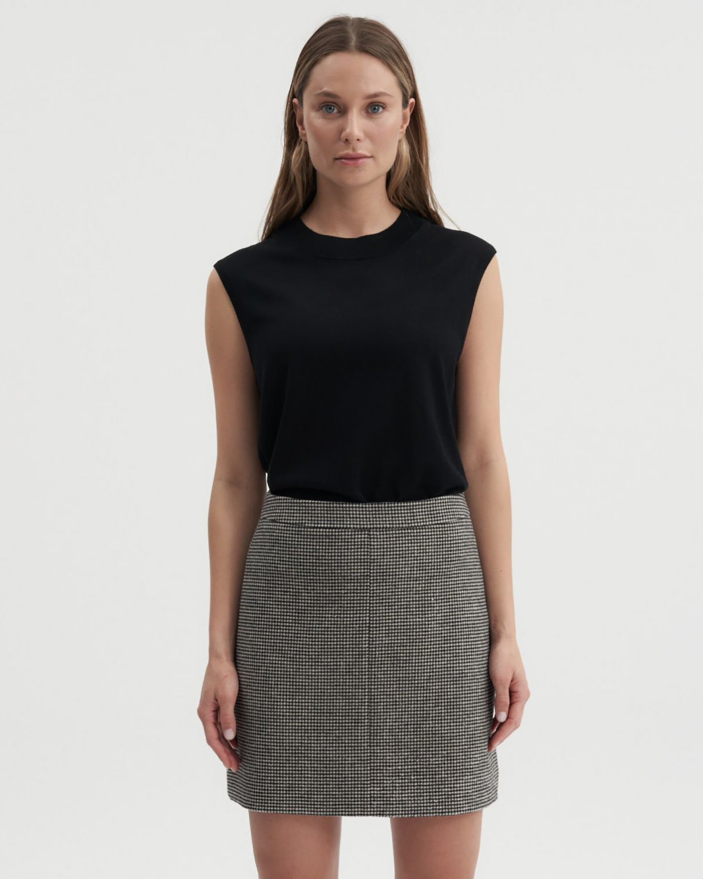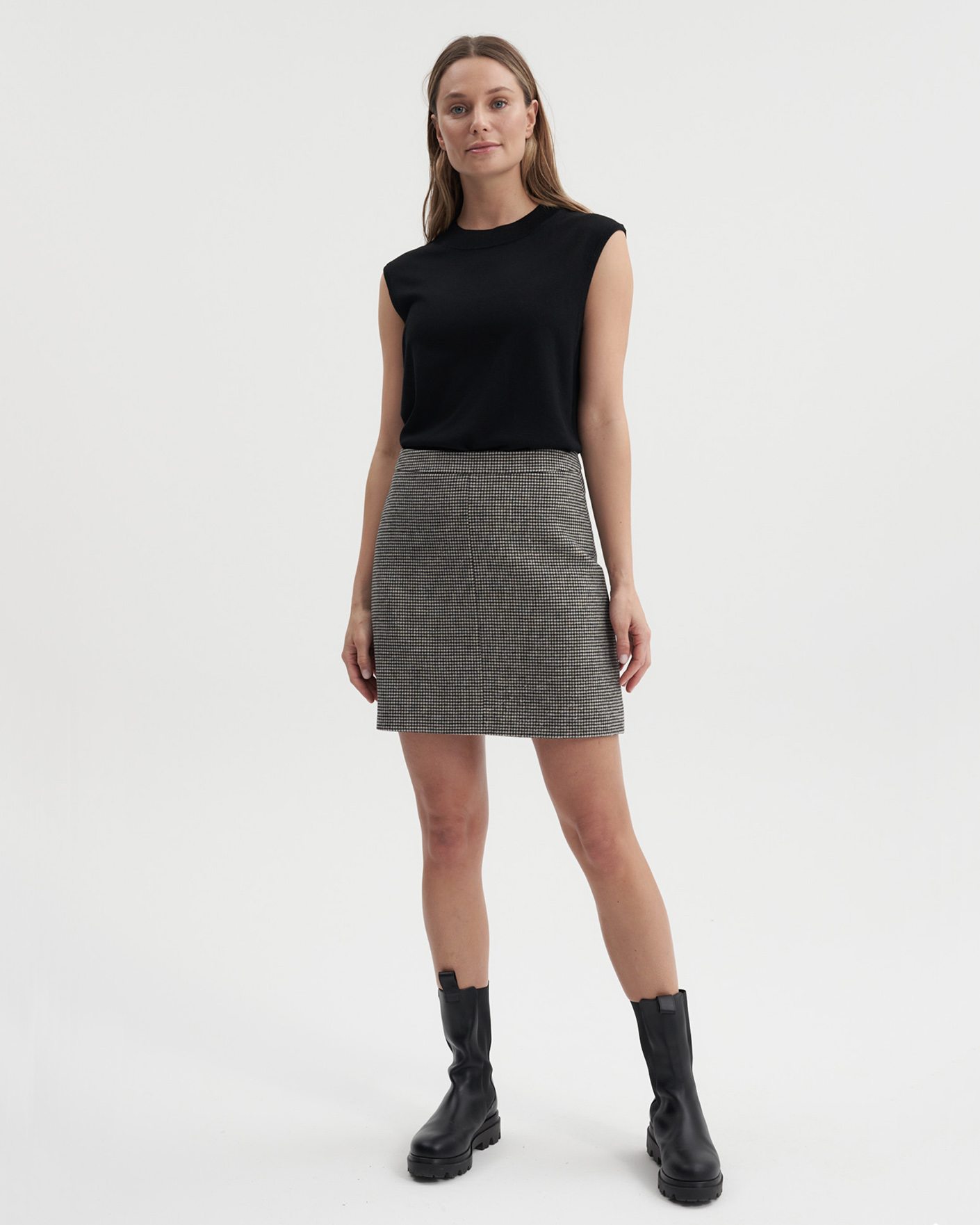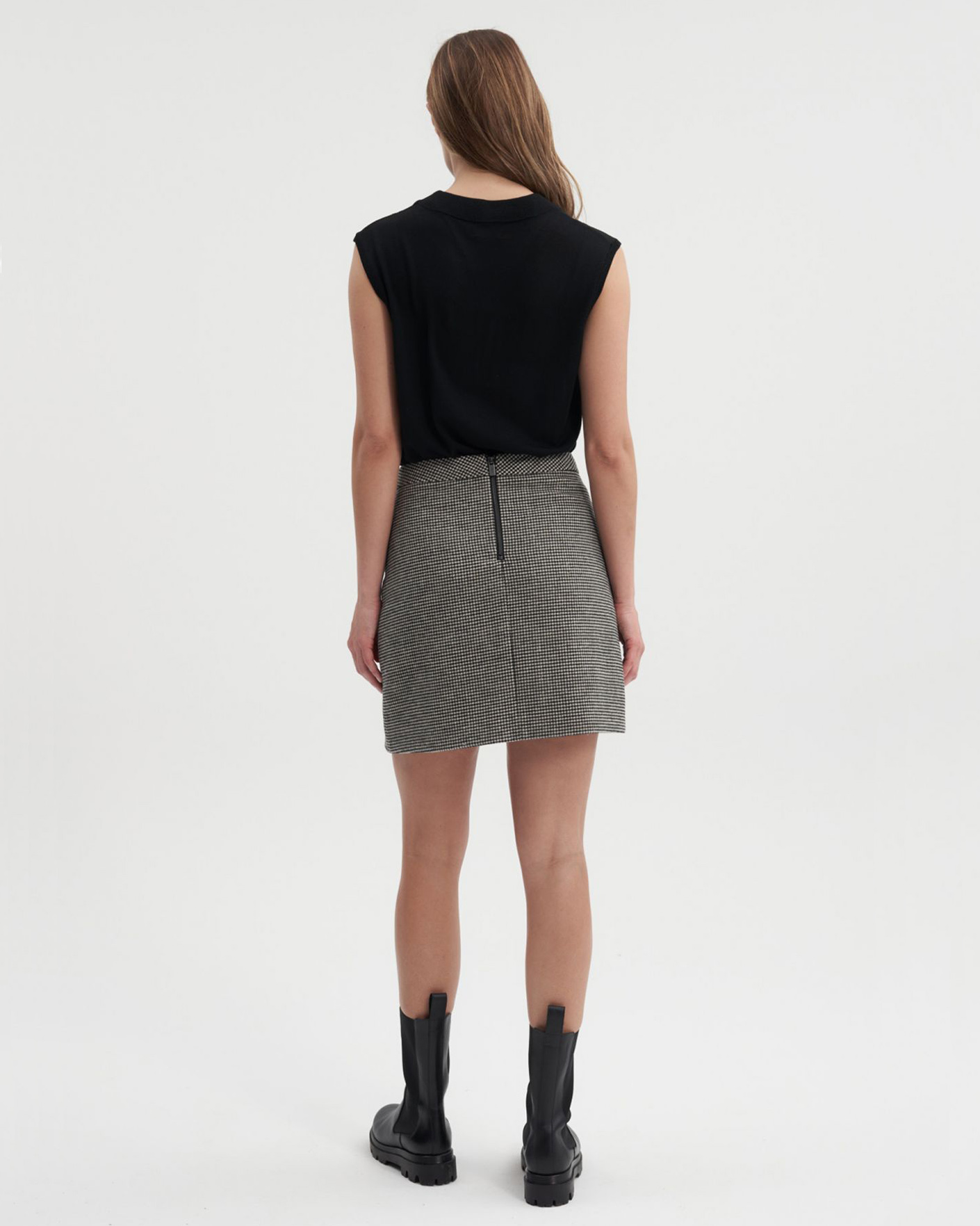 Мини юбка-трапеция UNQ бело-черного цвета в мелкий рисунок-гусиные лапки. Модель высокой посадки с застежкой на молнию сзади. Юбку-трапецию можно сочетать с футболкой, рубашкой, блузой, джемпером, кардиганом и жакетом.