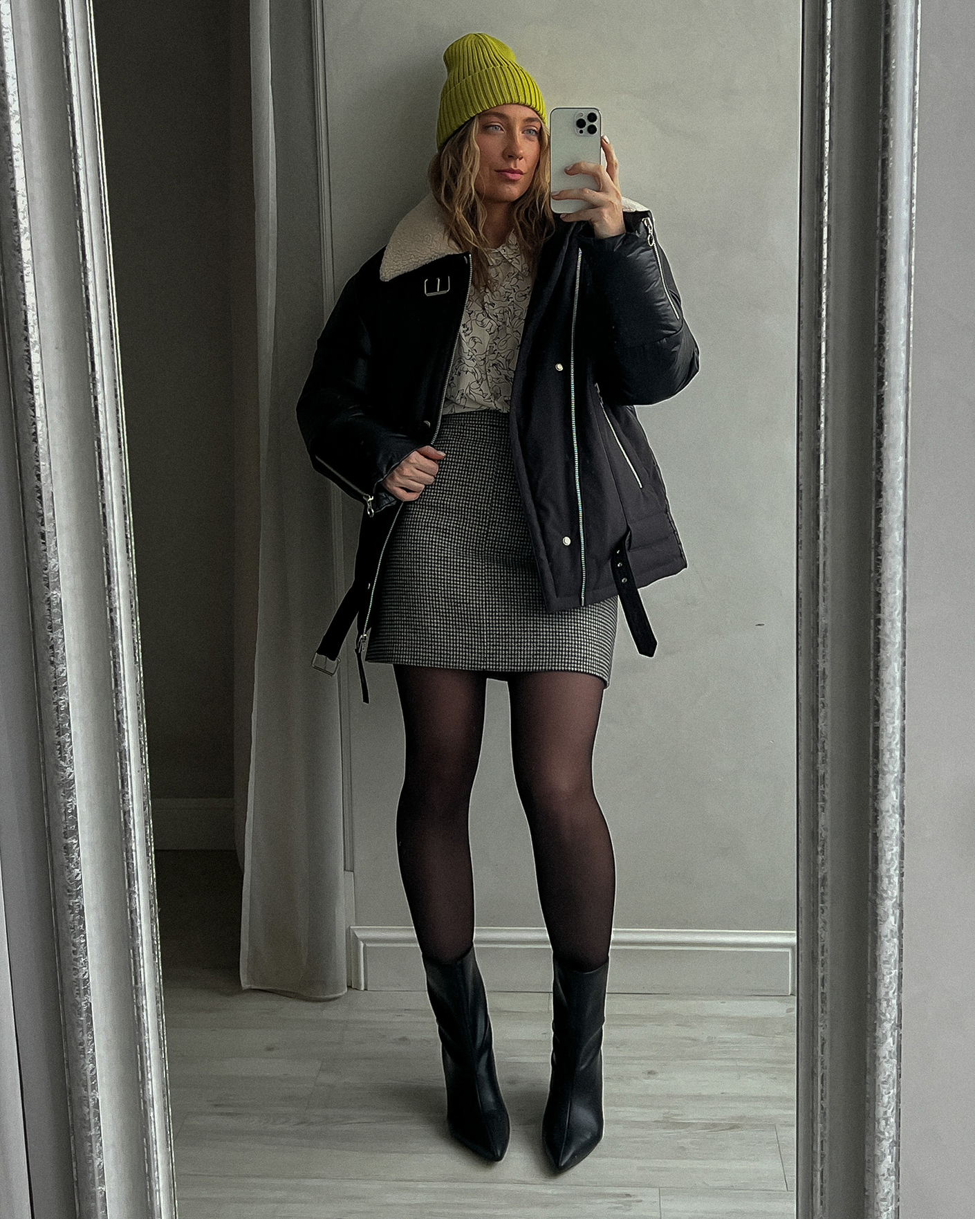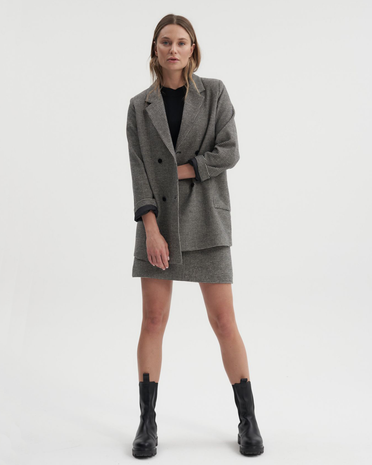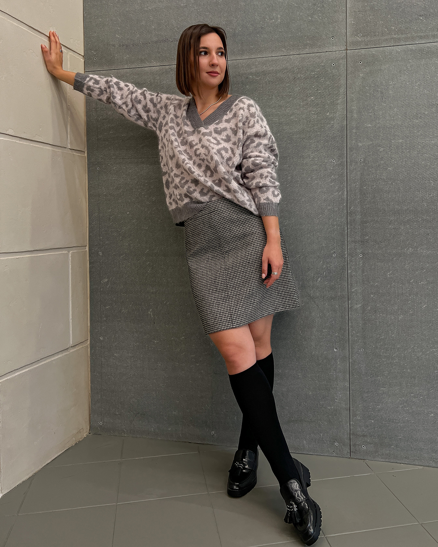 Мини юбка-трапеция UNQ бело-черного цвета в мелкий рисунок-гусиные лапки. Модель высокой посадки с застежкой на молнию сзади. Юбку-трапецию можно сочетать с футболкой, рубашкой, блузой, джемпером, кардиганом и жакетом.