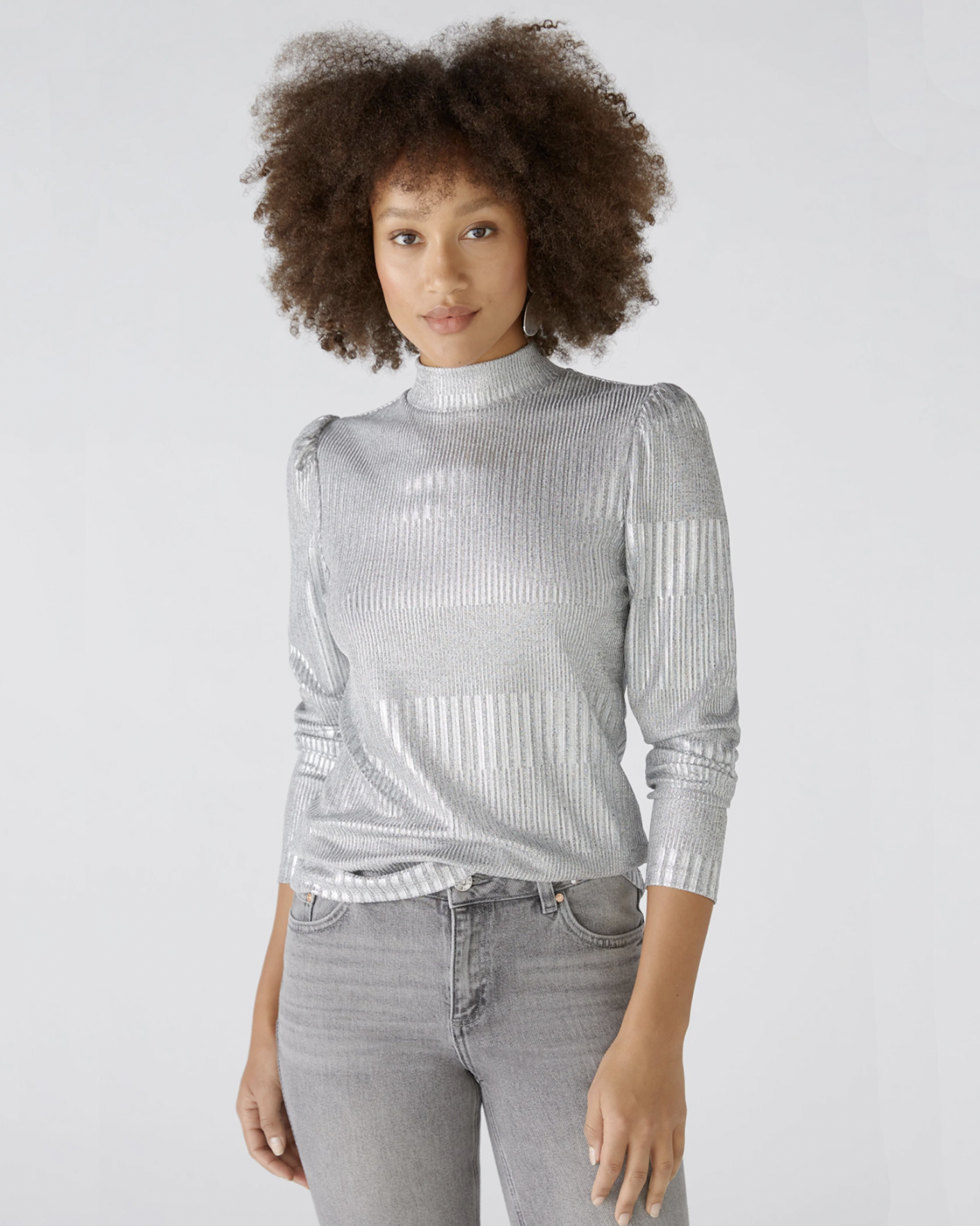 Приталенная водолазка OUI серебристого цвета в вертикальную строчную полосу. Модель с воротником-стойка, длинные рукава с небольшим объемом у плеч. Стильная водолазка станет фаворитом вашего гардероба.