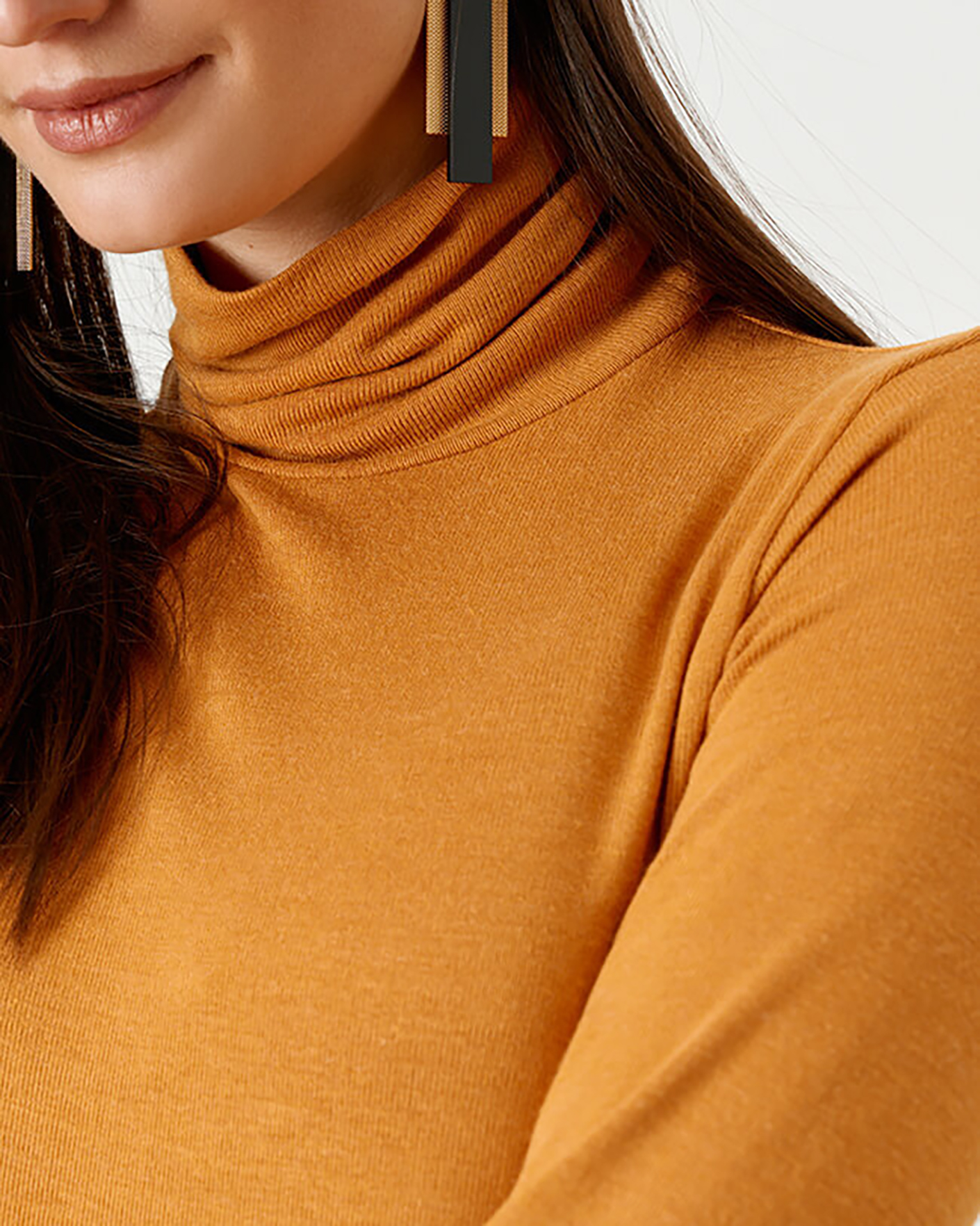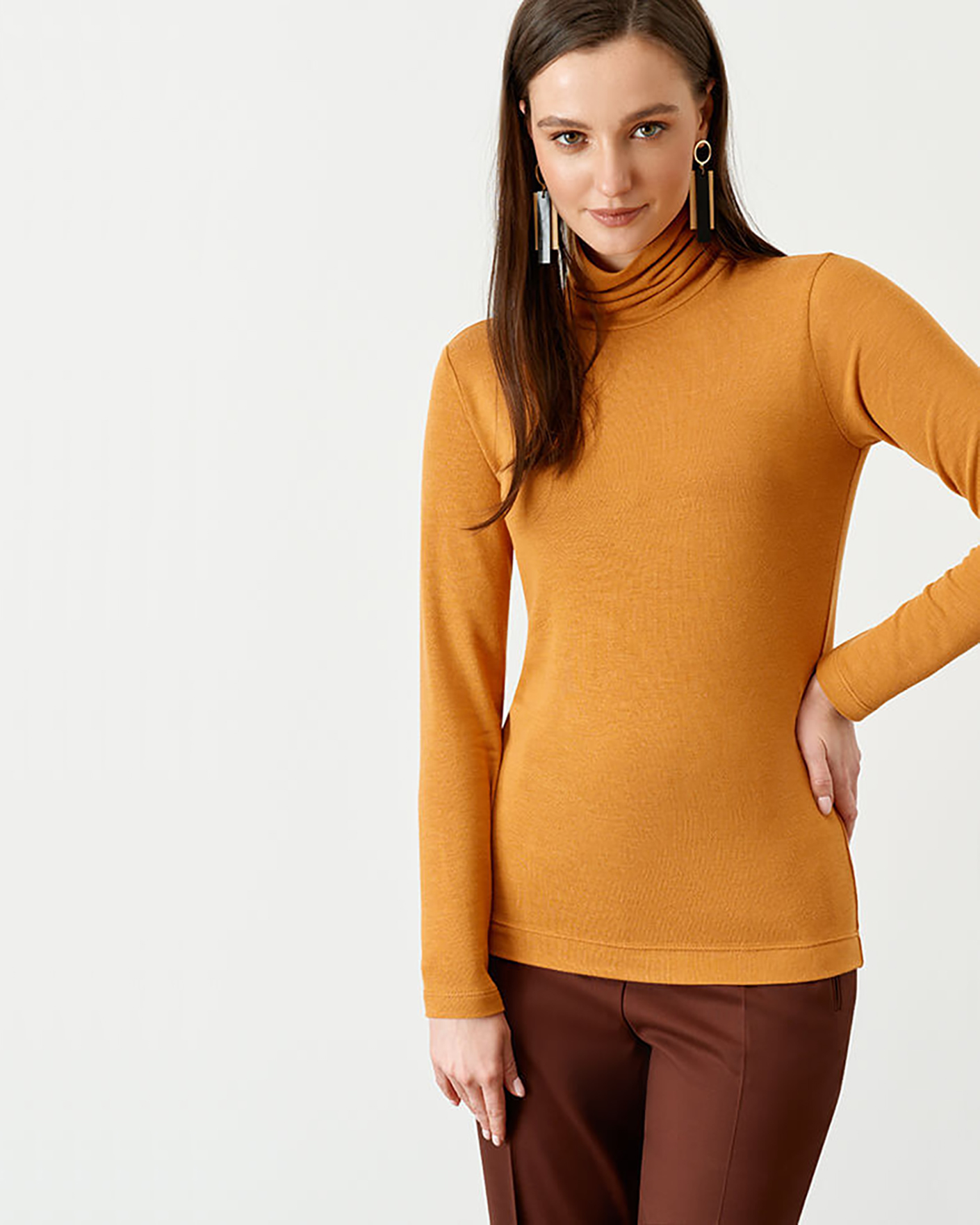 Приталенная водолазка Nelva горчичного цвета. Модель с удлиненным воротником-стойка. Водолазку можно сочетать с жилетом, жакетом, джемпером ,пуловером, юбкой и брюками.