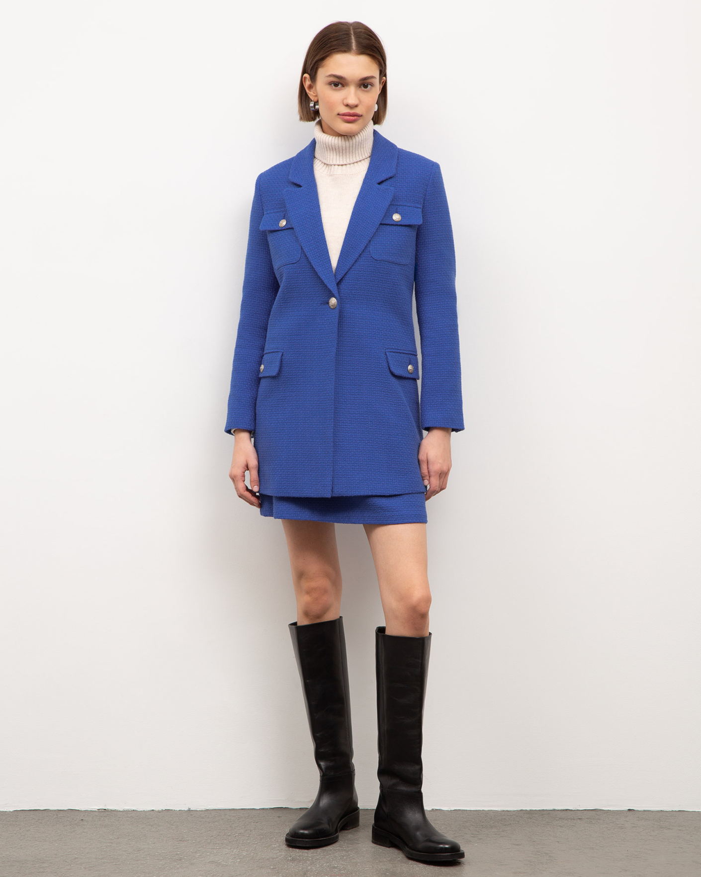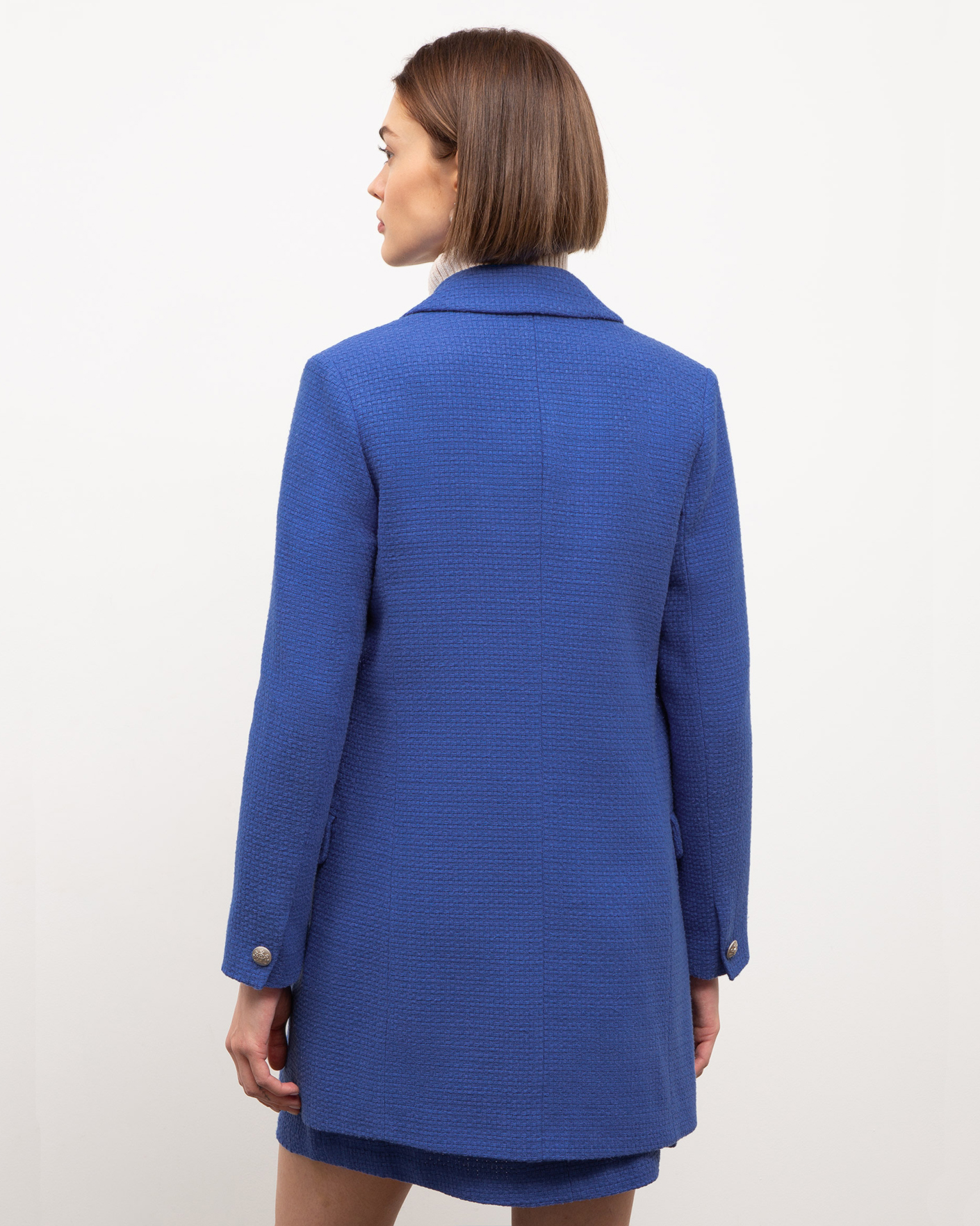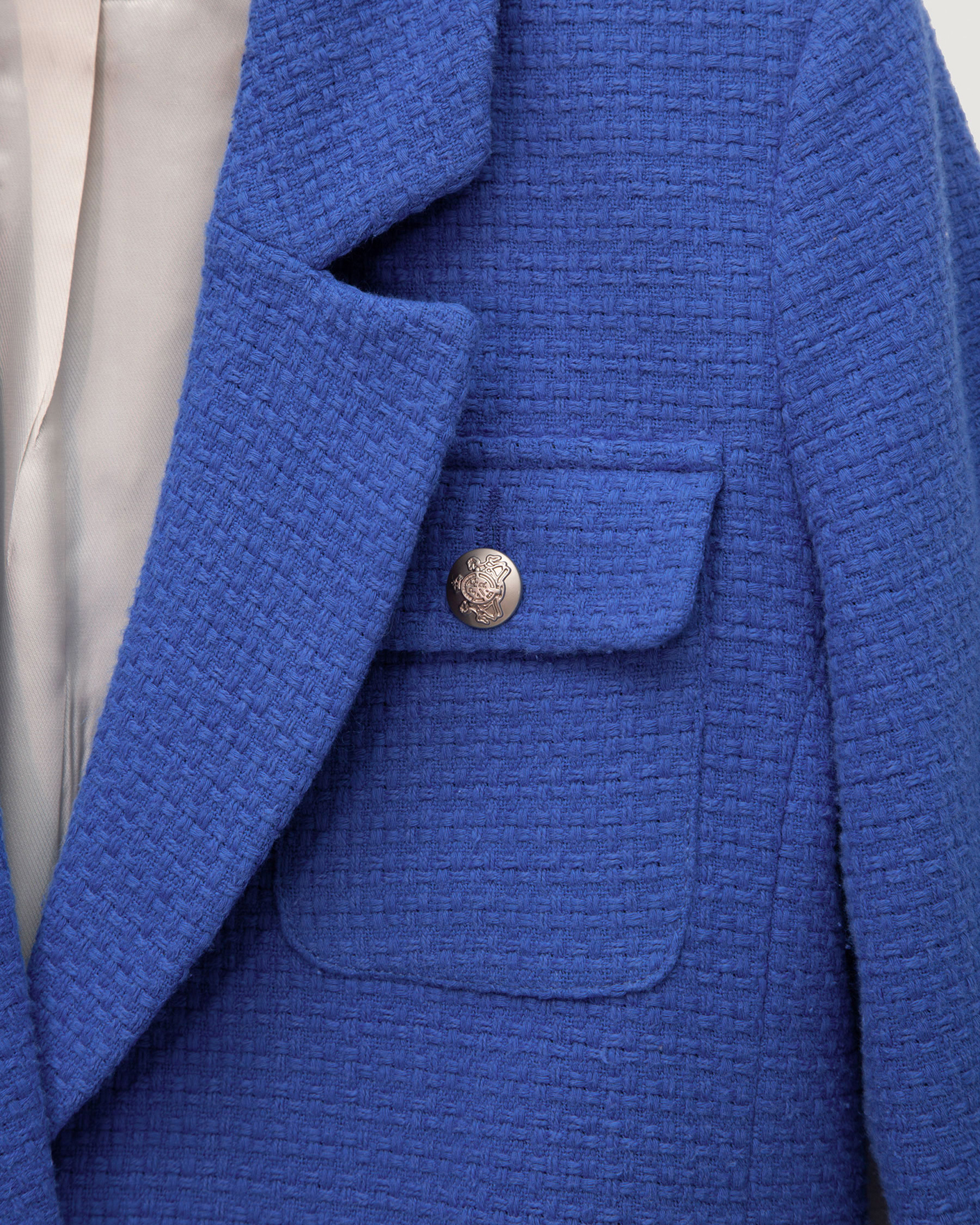 Удлиненный жакет Emka синего цвета выполнен из фактурного 100% хлопка. Модель прямого кроя с английским воротником и застежкой на одну пуговицу. Имеются два накладных кармана с клапанами на груди и два врезных кармана с клапанами по бокам. Стильный жакет отлично сочетается с рубашкой, водолазкой, джемпером, свитером, юбкой и брюками.
