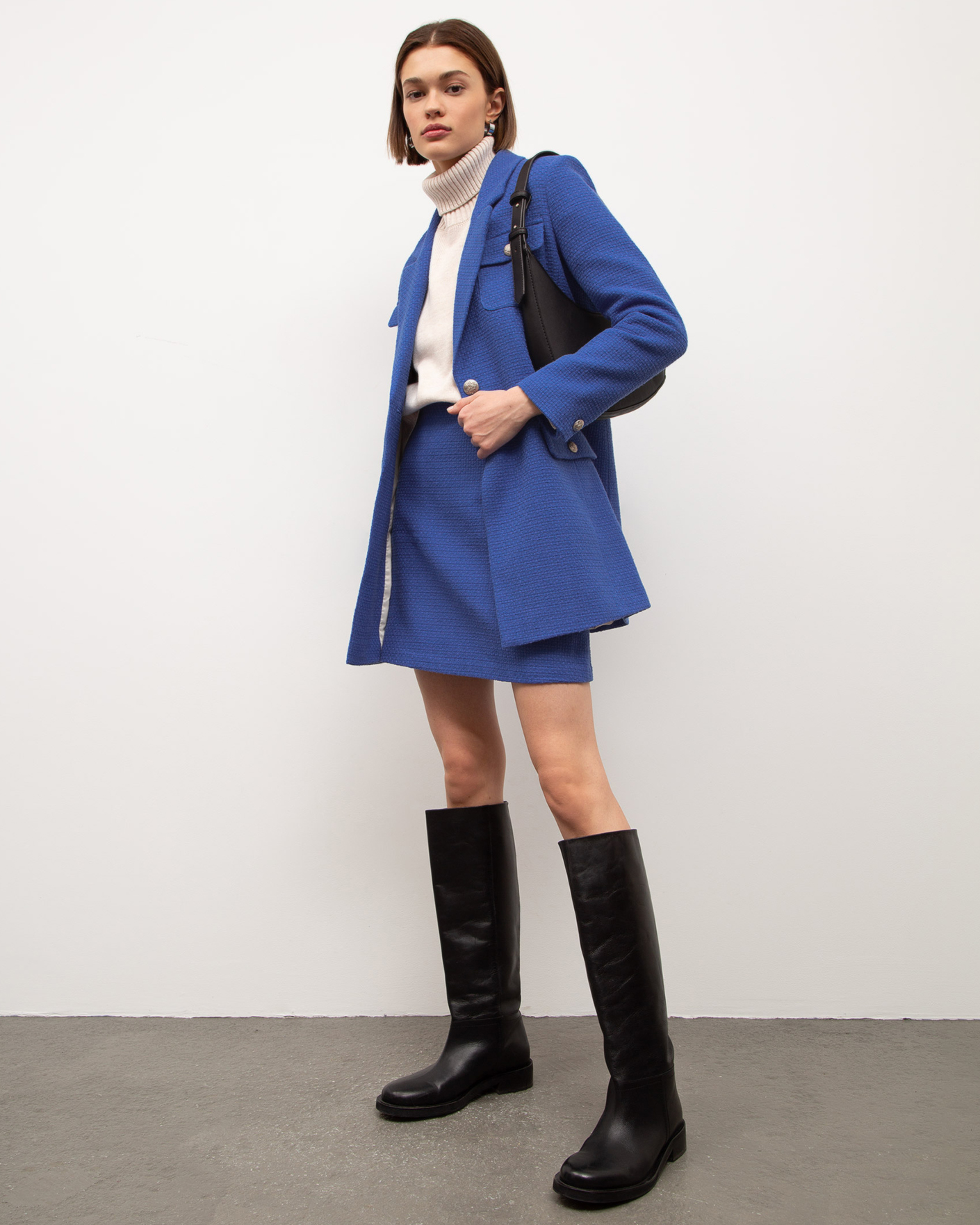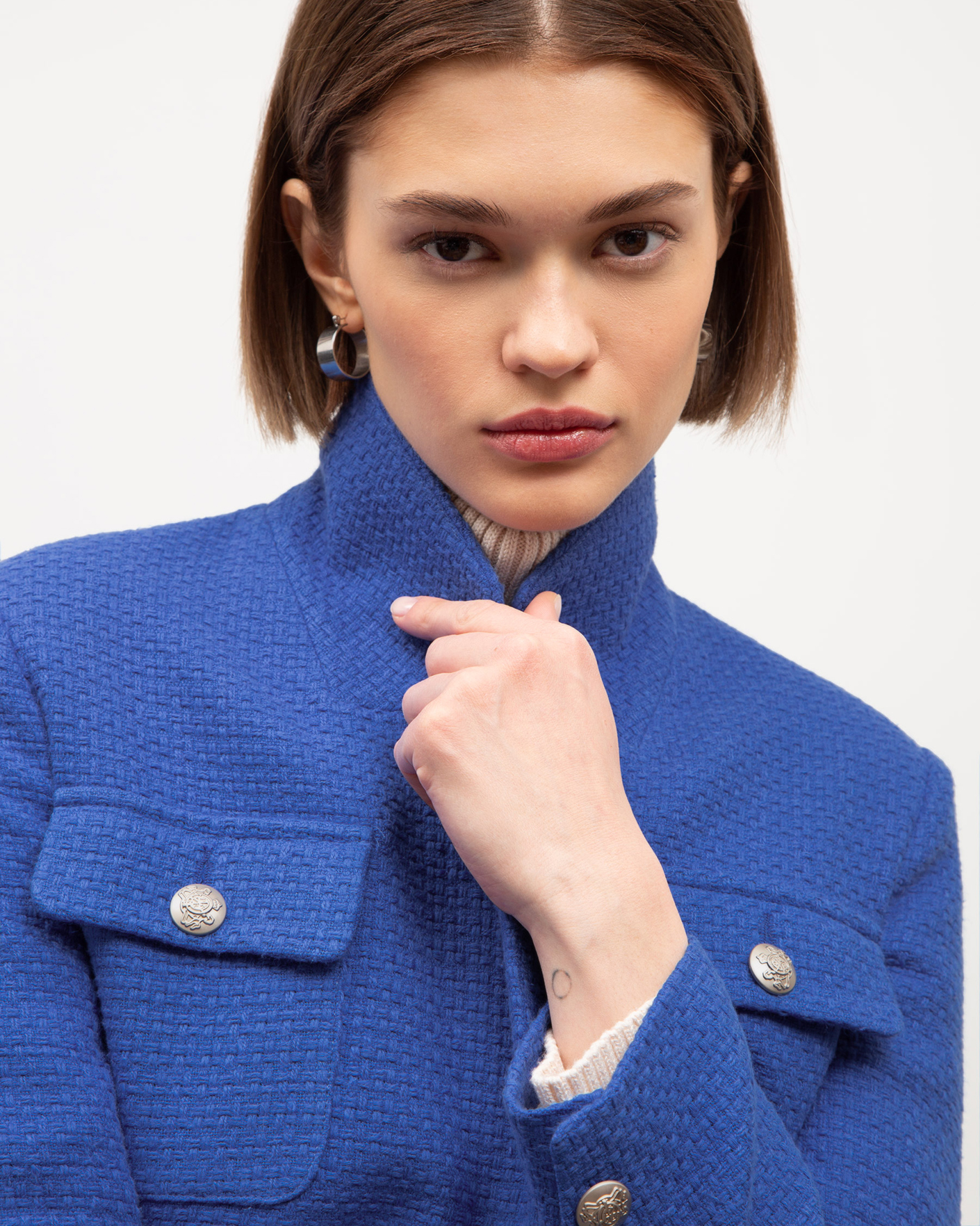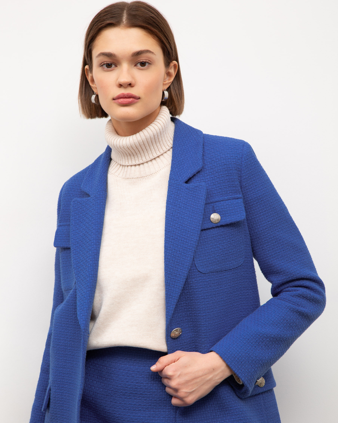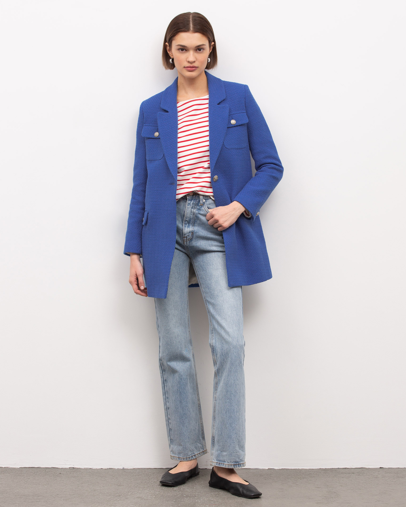 Удлиненный жакет Emka синего цвета выполнен из фактурного 100% хлопка. Модель прямого кроя с английским воротником и застежкой на одну пуговицу. Имеются два накладных кармана с клапанами на груди и два врезных кармана с клапанами по бокам. Стильный жакет отлично сочетается с рубашкой, водолазкой, джемпером, свитером, юбкой и брюками.