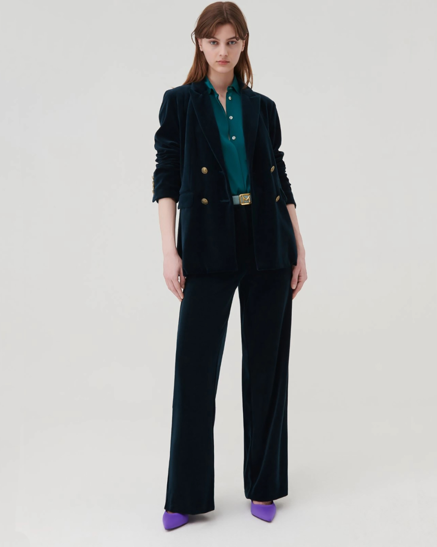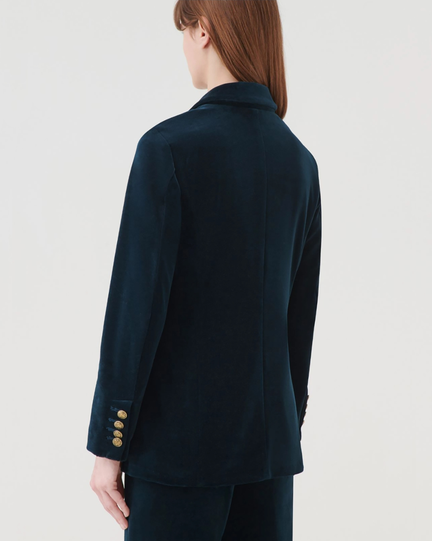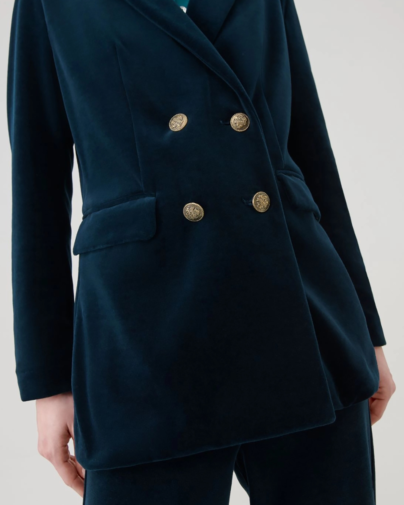 Двубортный блайзер Marella темно-зеленого цвета. Хлопковая модель с заостренными лацканами, застежак на четре пуговицы, имеются врезные карманы с клапанами по бокам. Блайзер можно сочетать с топом, футболкой, рубашкой, блузой, водолазкой, юбкой и брюками.