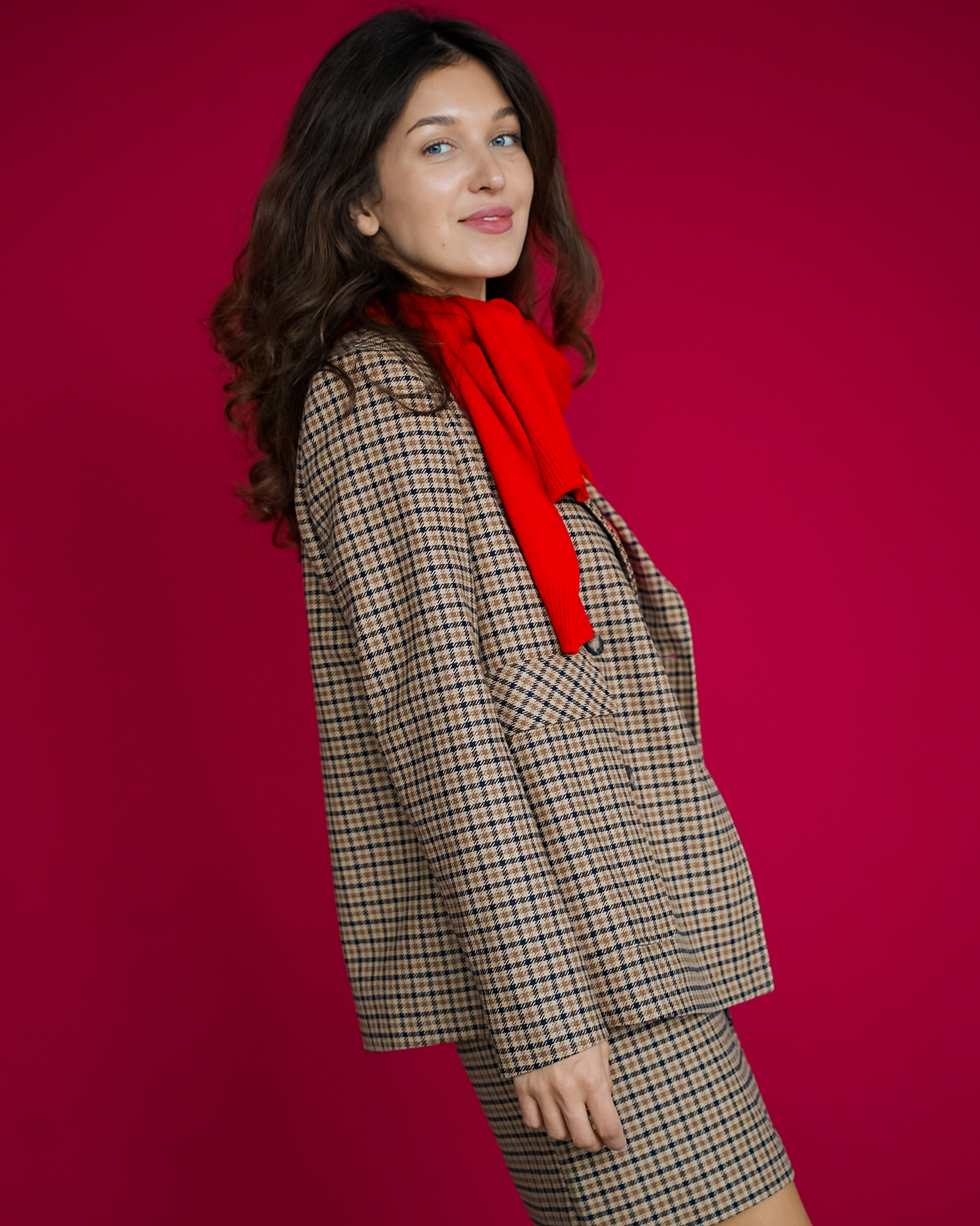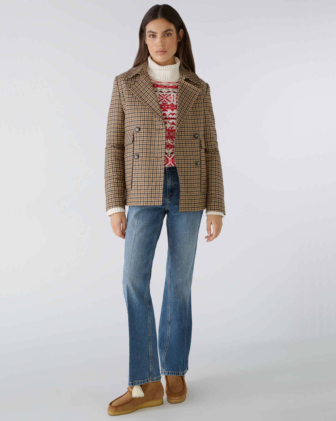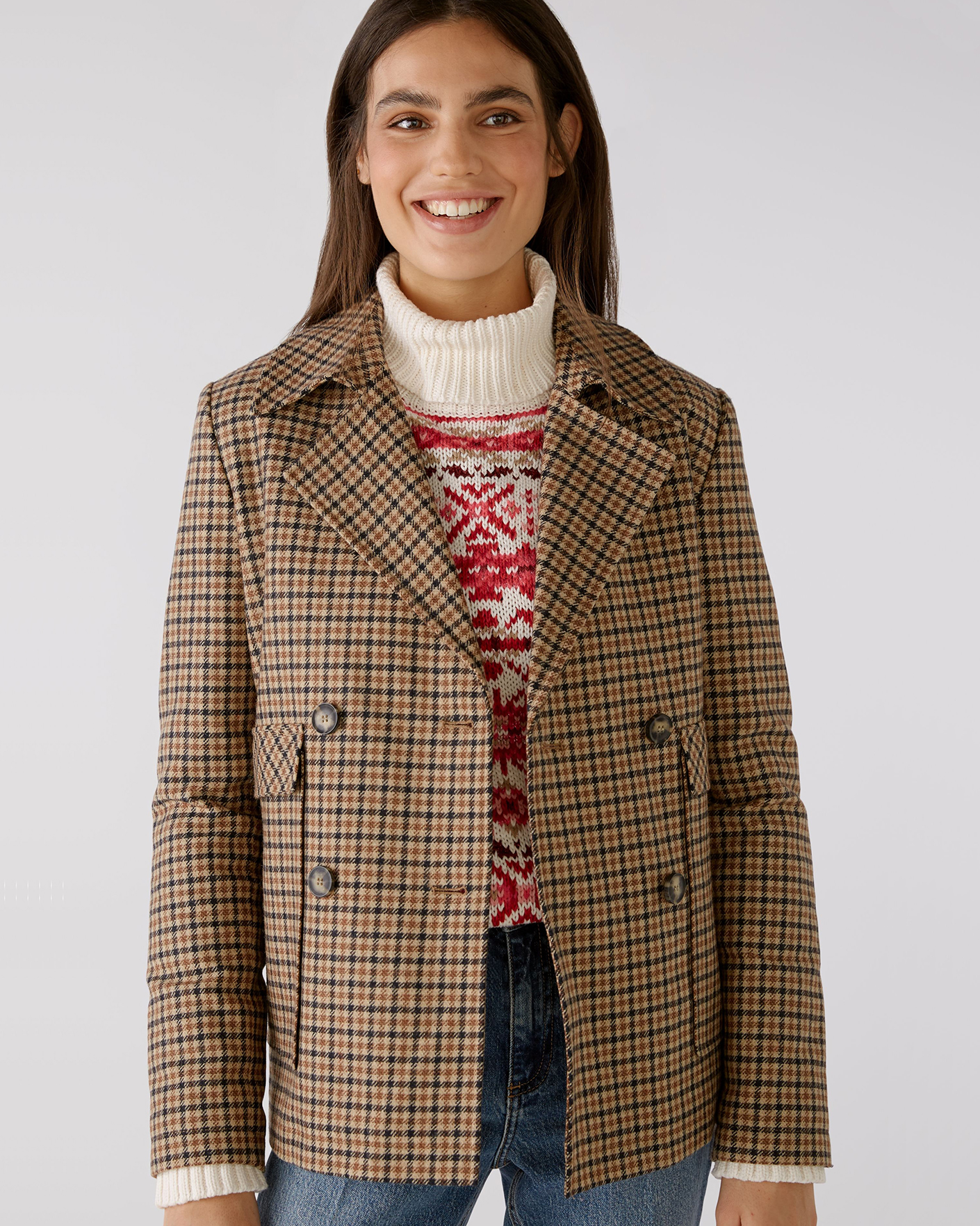 Двубортный жакет-бушлат OUI серо-бежевого цвета в мелкий рисунок гусиные лапки. Модель полуприталенного кроя, широкие лацканы, застежка на четыре пуговицы. Имеются врезные карманы с клапанами по бокам. Стильный жакет-бушлат станет фаворитом вашего гардероба.