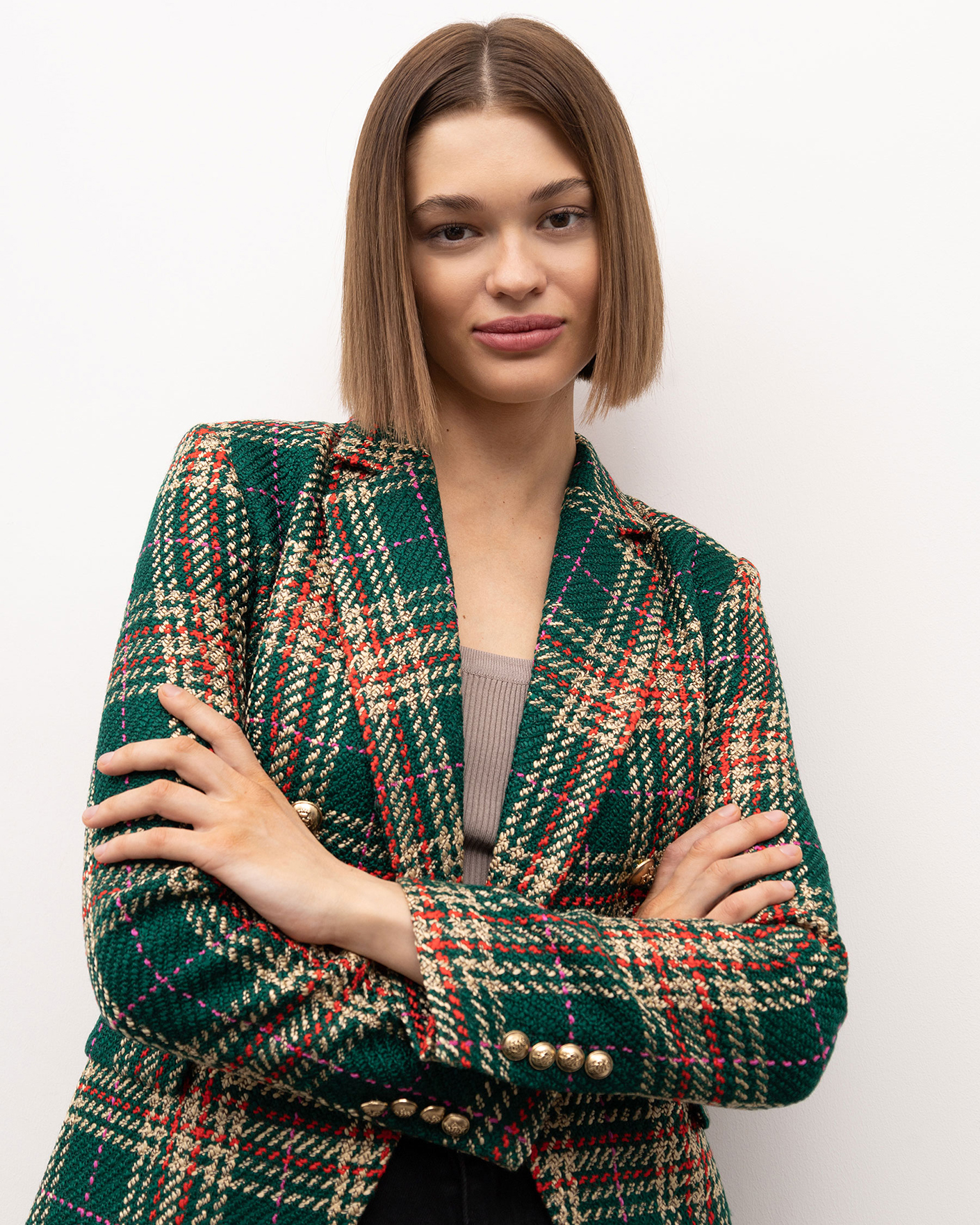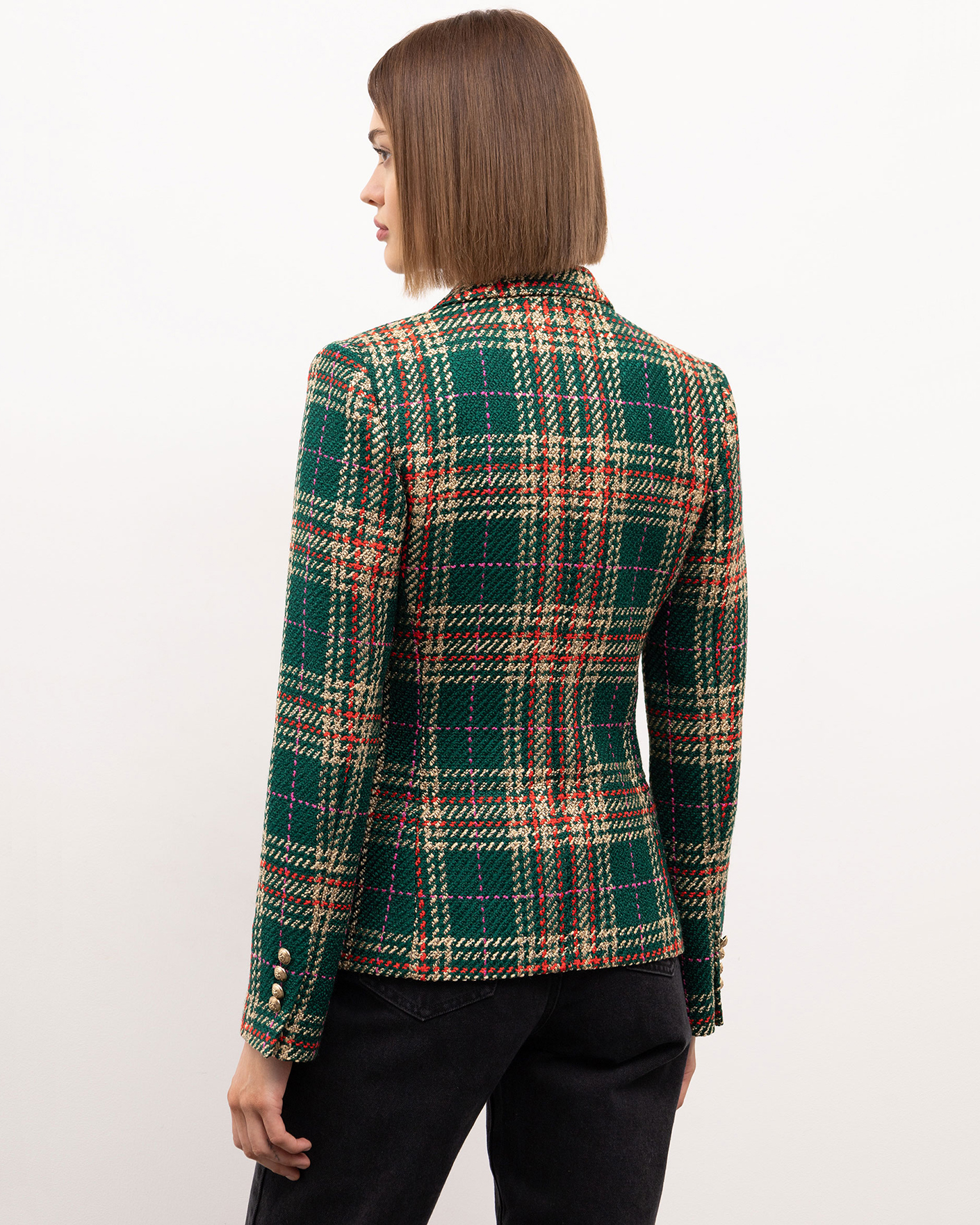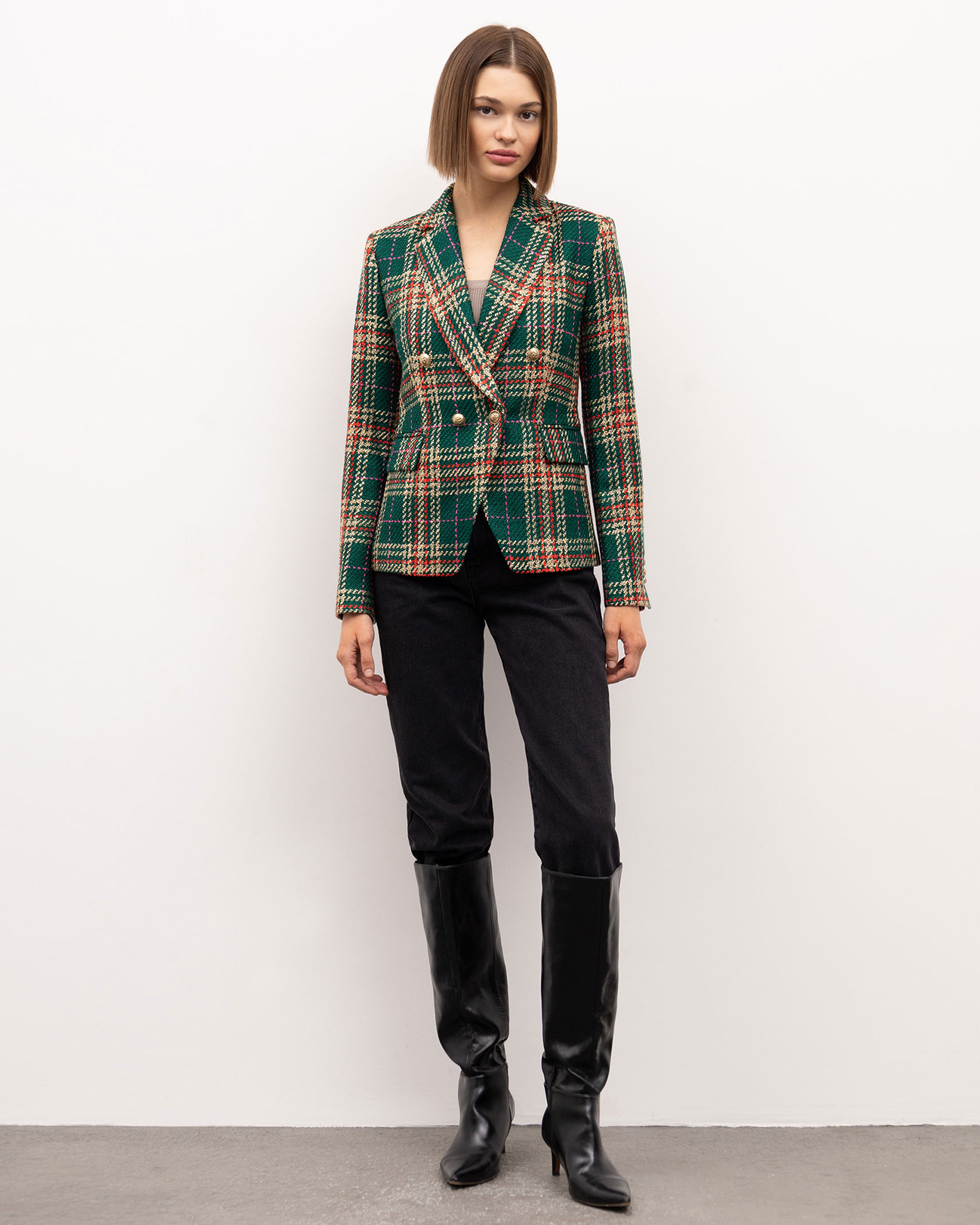Приталенный двубортный жакет Emka зеленого цвета в крупную текстурную клетку. Модель с английским воротником, узкими лацканами и акцентными пуговицами.Имеются врезные карманы с клапанами по бокам. Яркий жакет отлично сочетается с рубашкой, водолазкой, джемпером, свитером, юбкой и брюками.