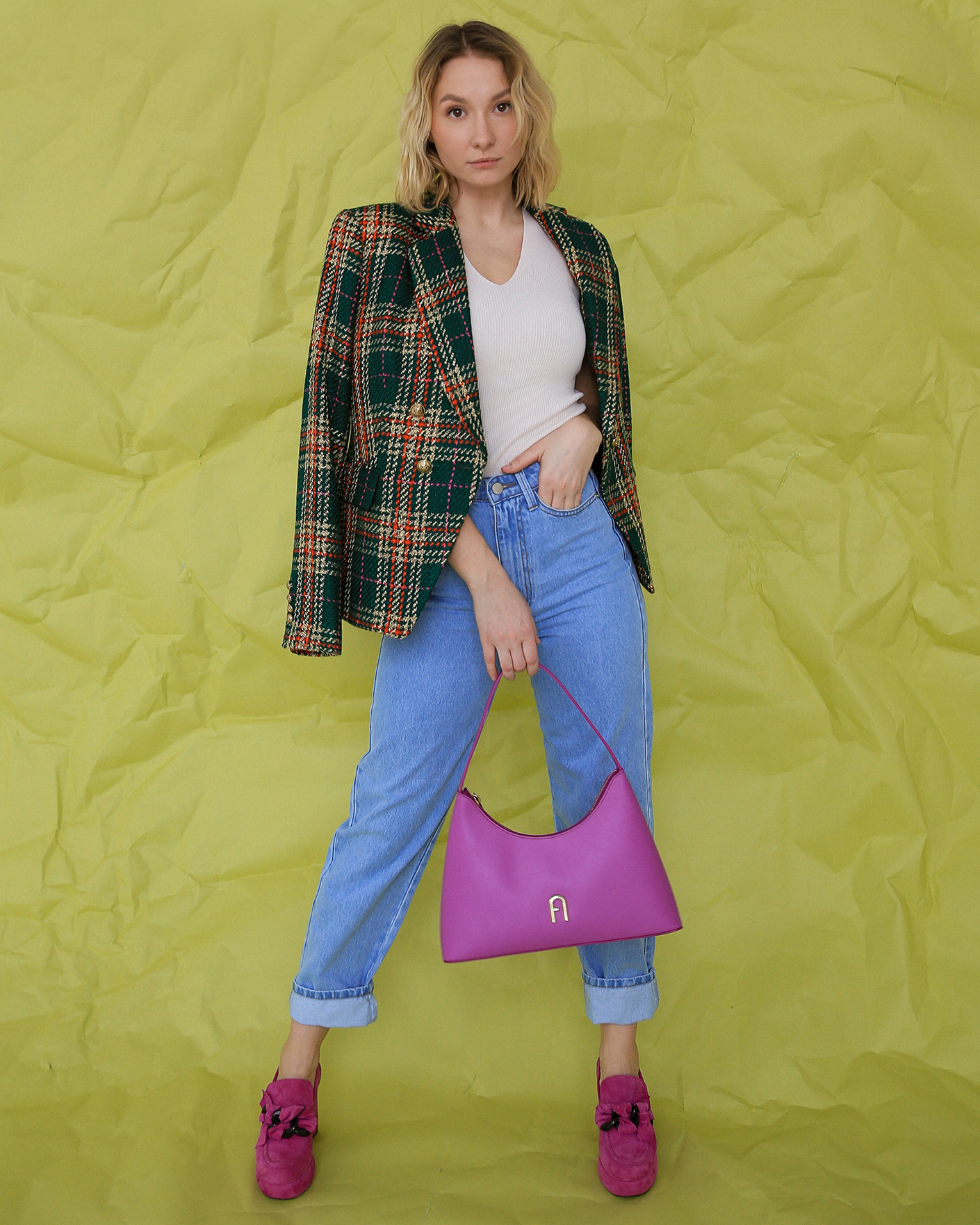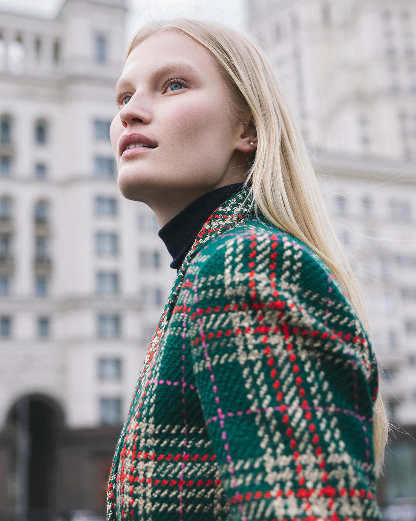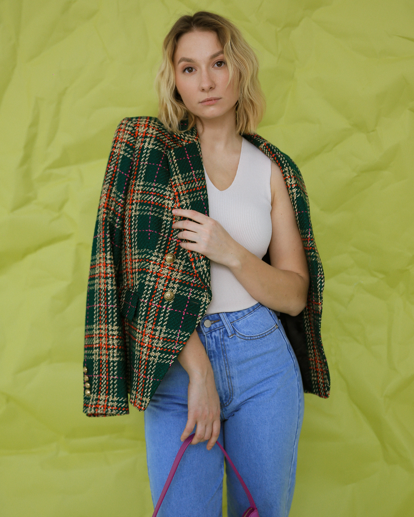 Приталенный двубортный жакет Emka зеленого цвета в крупную текстурную клетку. Модель с английским воротником, узкими лацканами и акцентными пуговицами.Имеются врезные карманы с клапанами по бокам. Яркий жакет отлично сочетается с рубашкой, водолазкой, джемпером, свитером, юбкой и брюками.