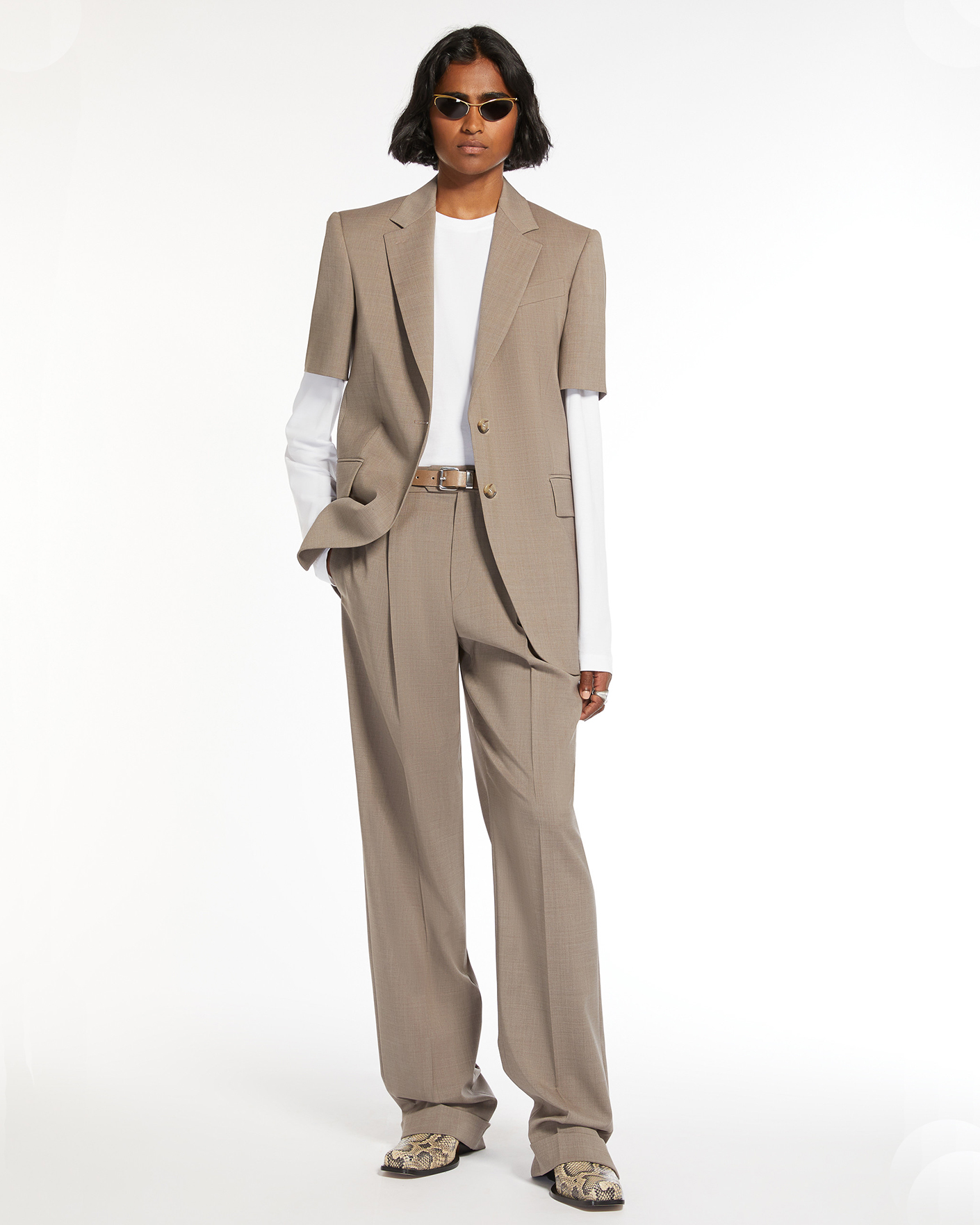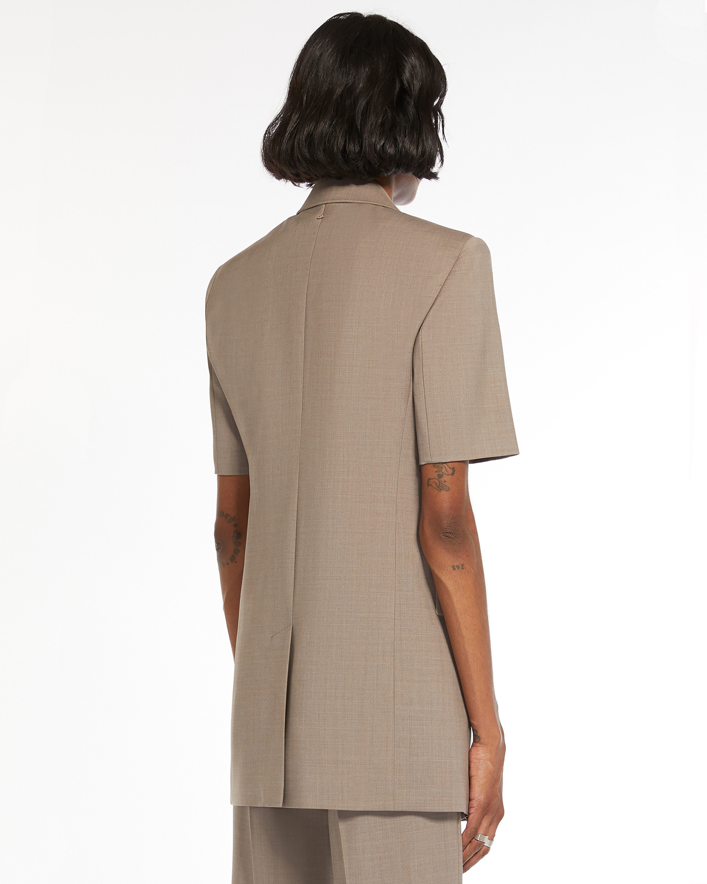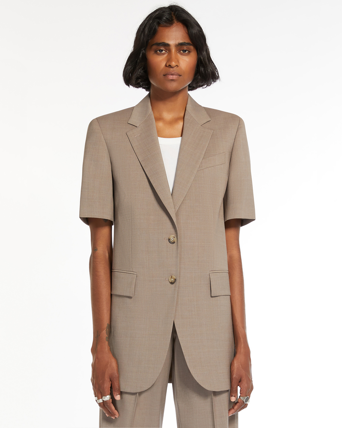 Приталенный жакет Sportmax серо-коричневого цвета в строчный рисунок. Модель из 100% шерсти с короткими рукавами, с лацканами, застежка на пуговицы, закругленные края, врезные карманы с клапанами по бокам. Жакет отлично впишется в ваш деловой гардероб.