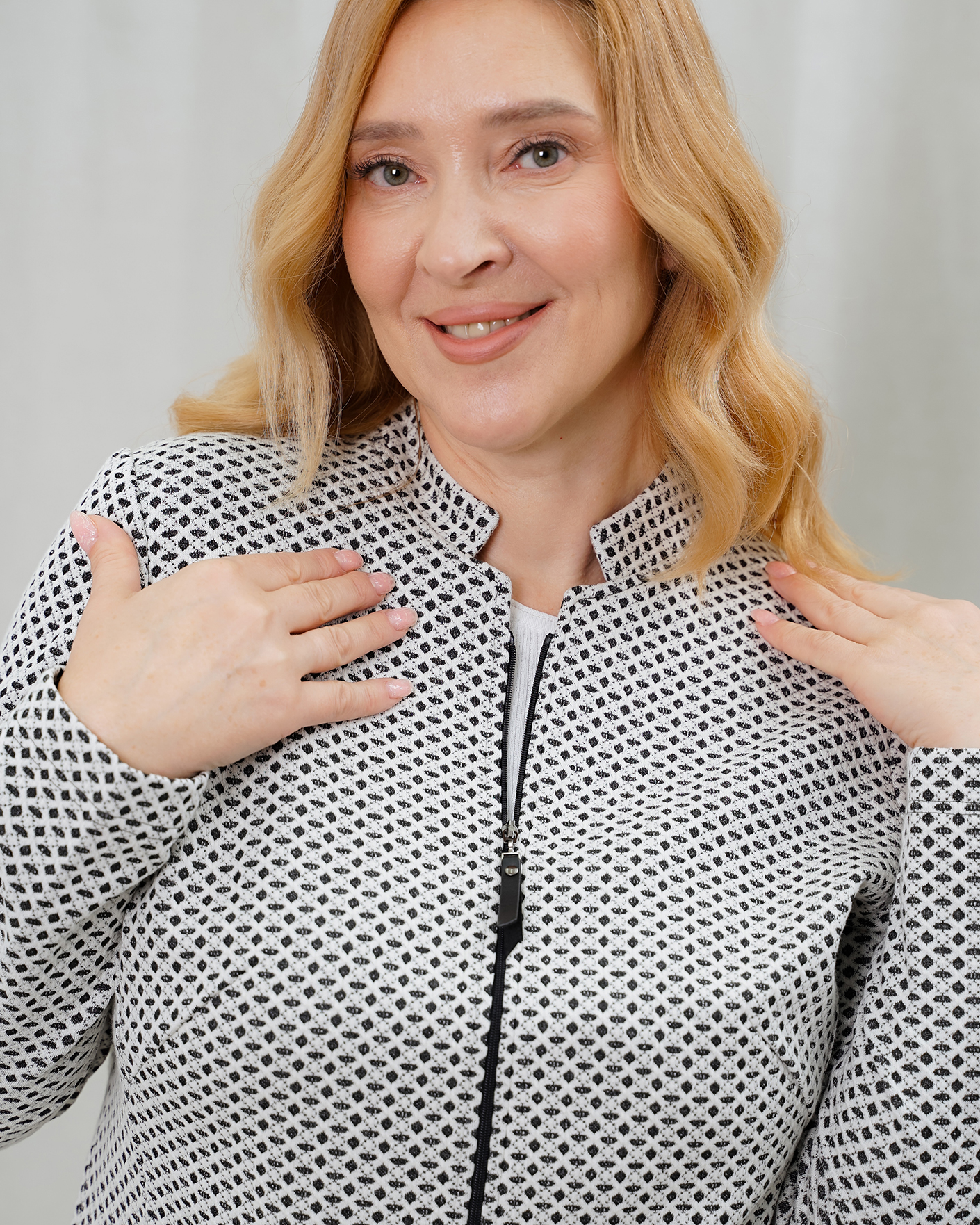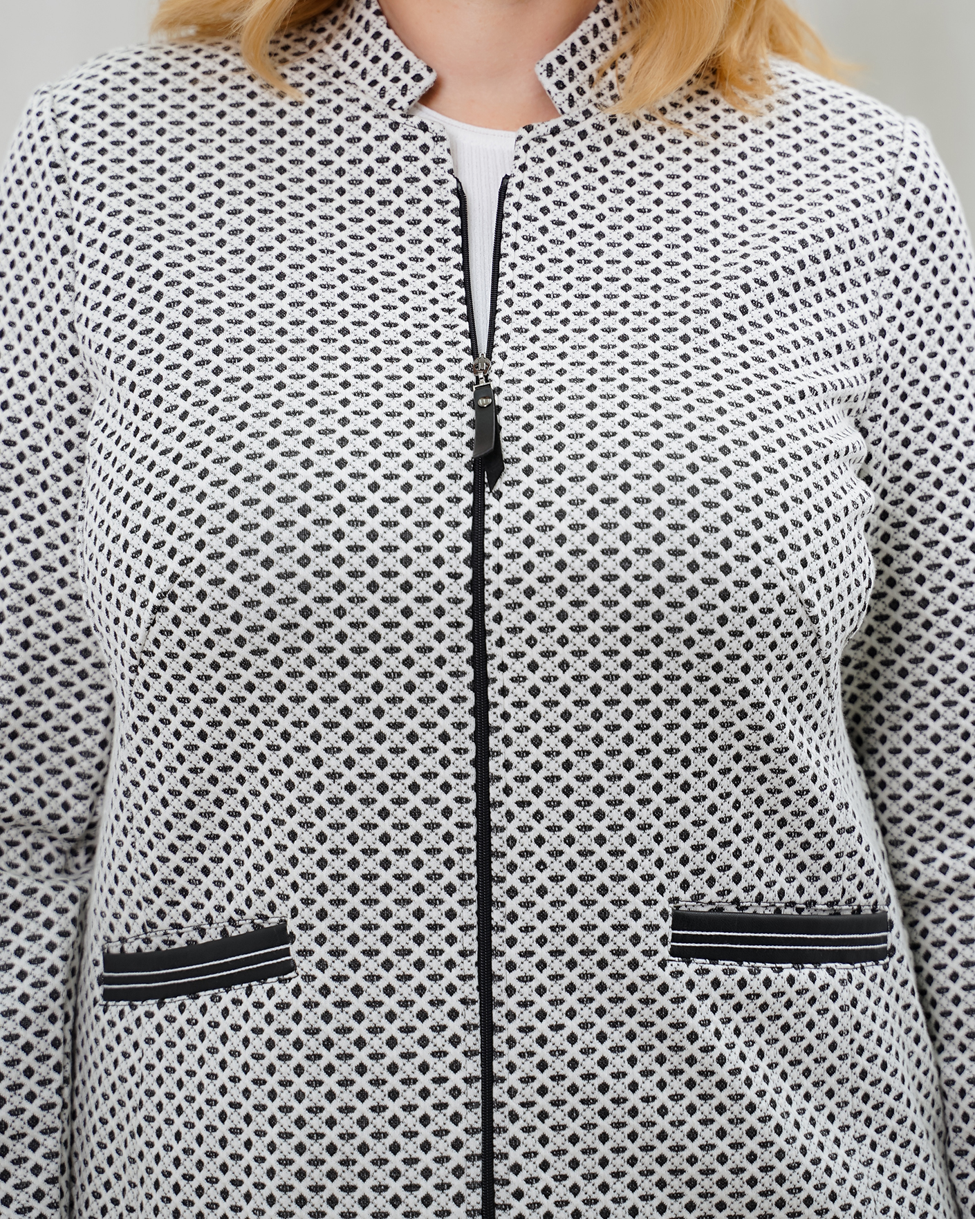 Приталенный жакет Frank Walder черно-белого цвета в мелкий рисунок. Модель с воротником-стойка, застежка на молнии, имеются врезные карманы по бокам. Жакет отлично впишется в повседневный гардероб.