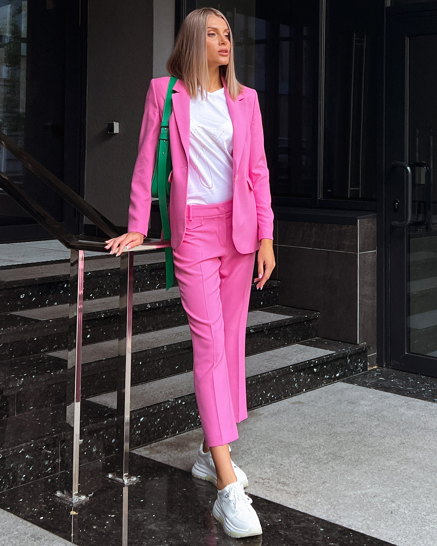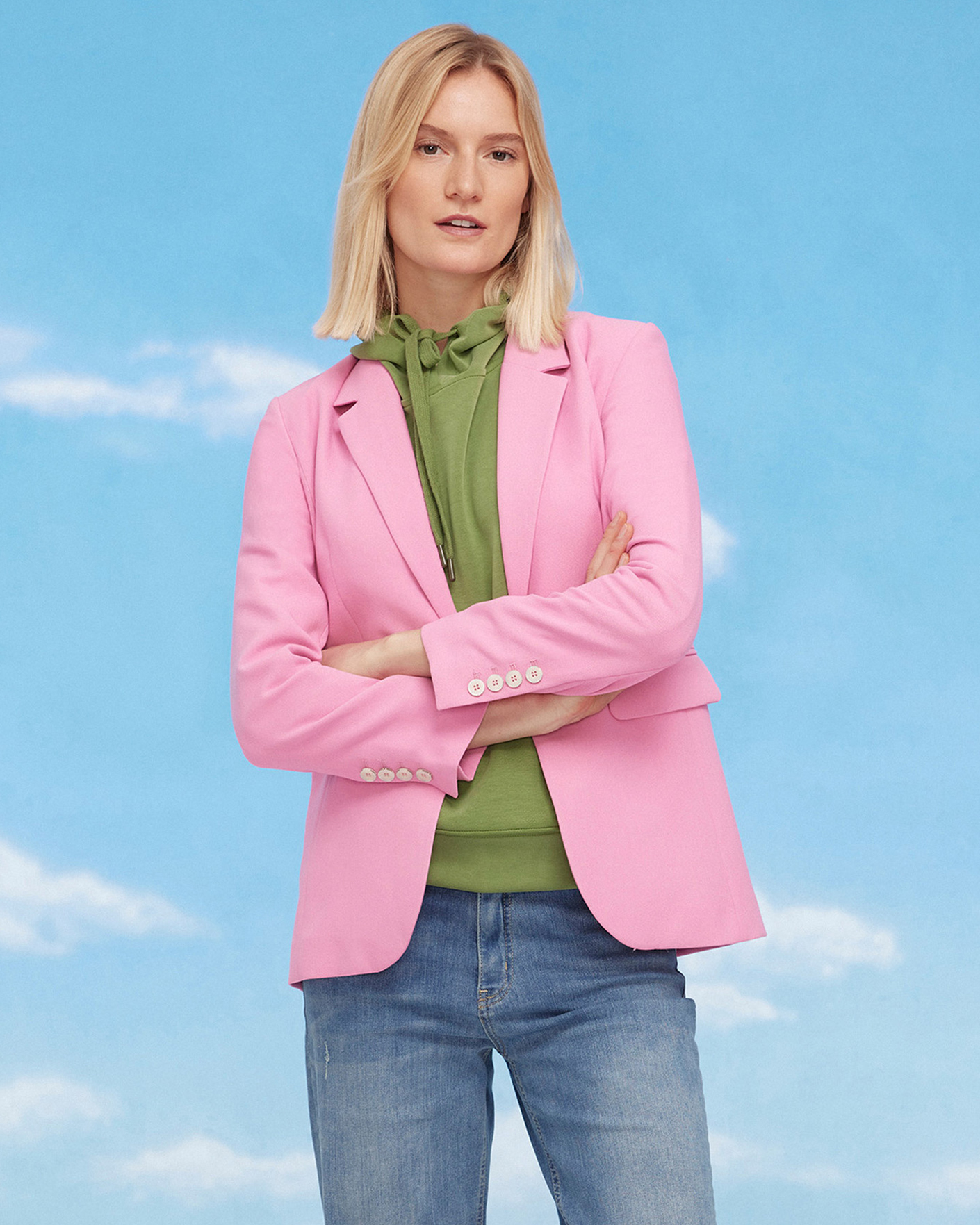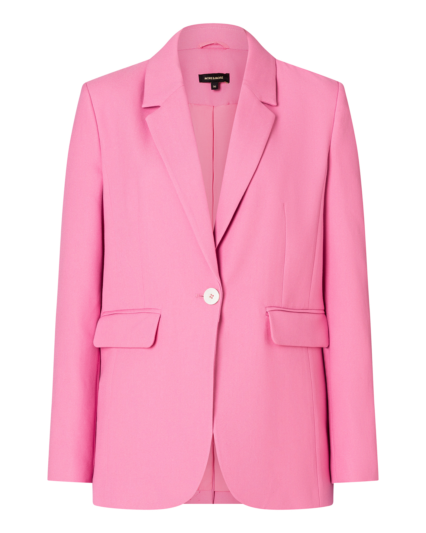 Приталенный жакет More&More розового цвета прямого кроя. Модель с лацканами, застежка на одну пуговицу, имеются врезные карманы с клапанами по бокам. Яркий жакет отлично сочетается с топом, футболкой, рубашкой, блузой, джемпером, водолазкой, юбкой и брюками.