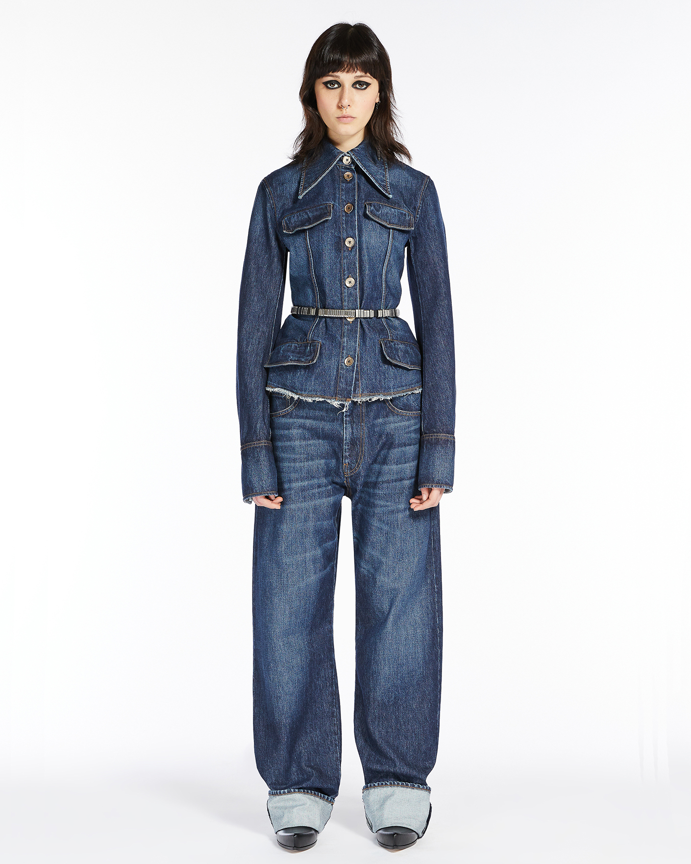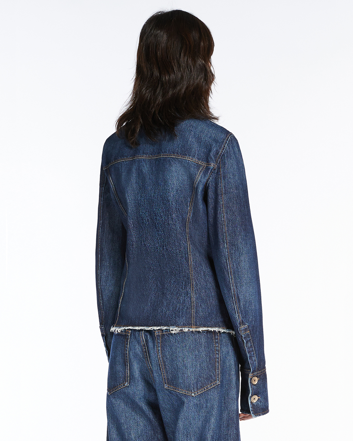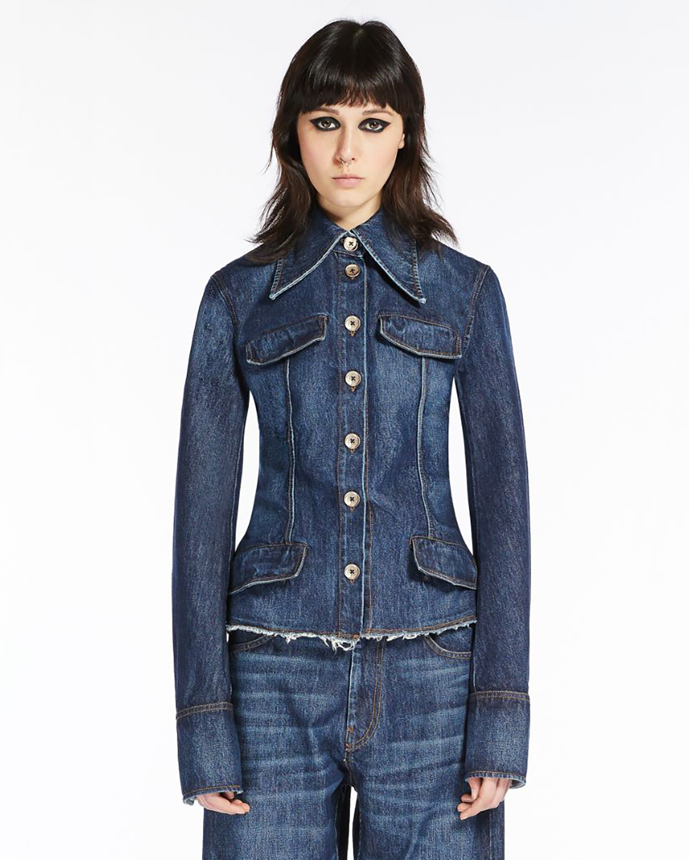 Приталенный джинсовый жакет Sportmax синего цвета с отбеленным эффектом. Модель с отложным заостенным воротником, застежка на металлические пуговицы. Имеются обманные 4 клапана, а также низ со специально необработанным краем. Джинсовый жакет отдично сочетается с повседневным гардеробом.