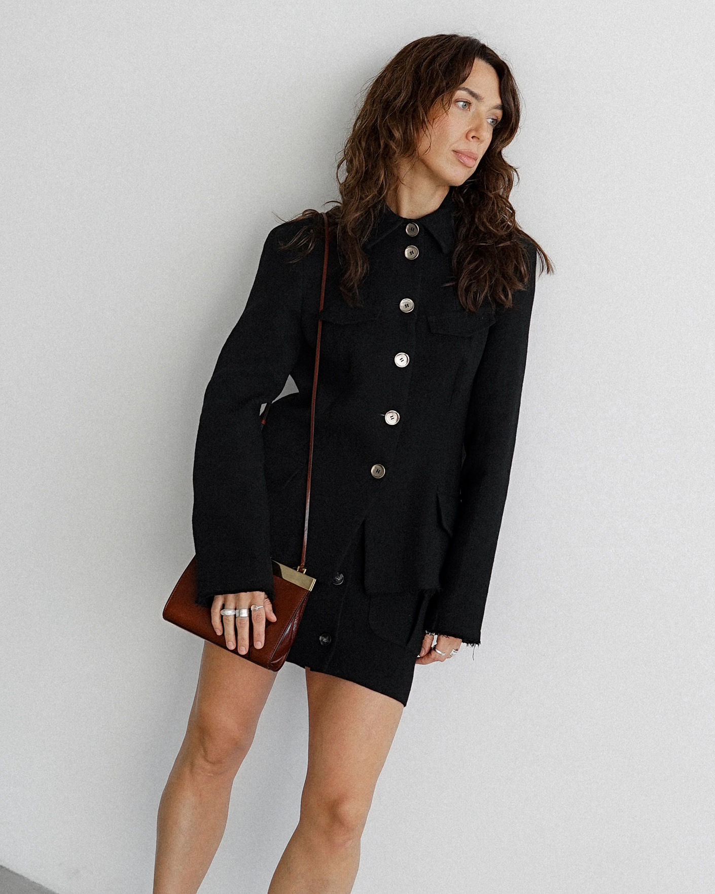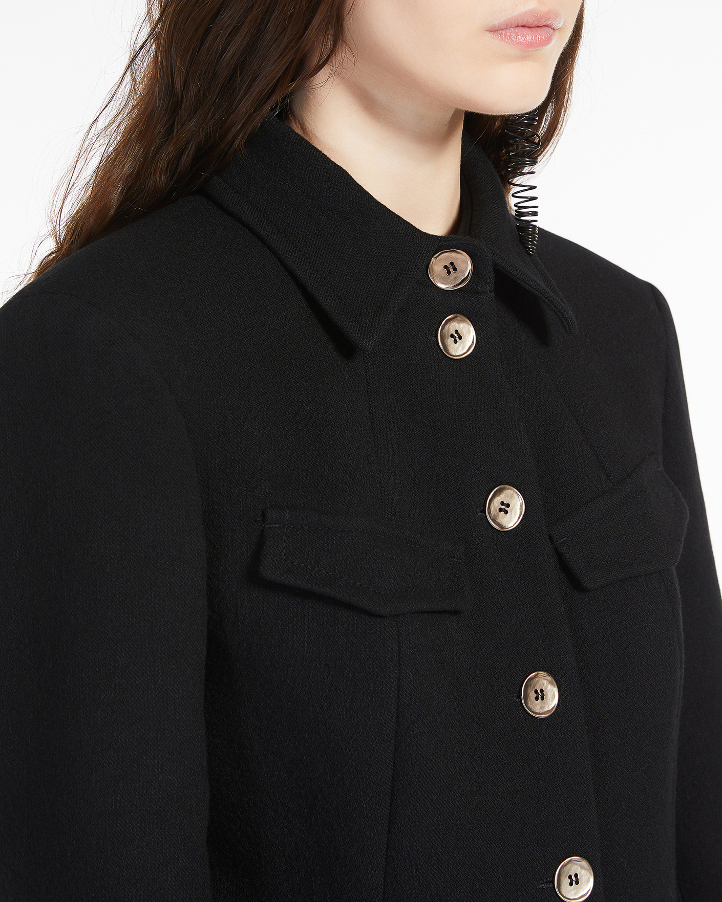 Приталенный жакет Sportmax черного цвета в мелкий строчный рисунок. Модель с отложным воротником, застежкой на крупныепуговицы. Имеются обманные четыре клапана, а манжеты и низ с аккуратно-необработанным краем. Жакет отлично впишется в ваш деловой гардероб.