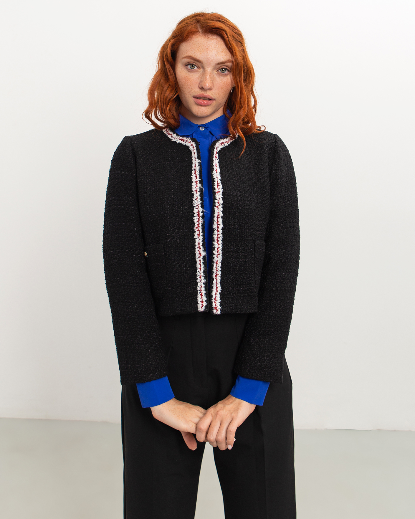 Укороченный жакет Marella черного цвета в мелкий текстурный рисунок. Модель с круглым вырезом и застежкой на потайные крючки с контрастной отделкой по краю. Имеются накладные карманы по бокам. Стильный жакет можно сочетать с футболкой, топом, рубашкой, блузой, водолазкой, юбкой и брюками.