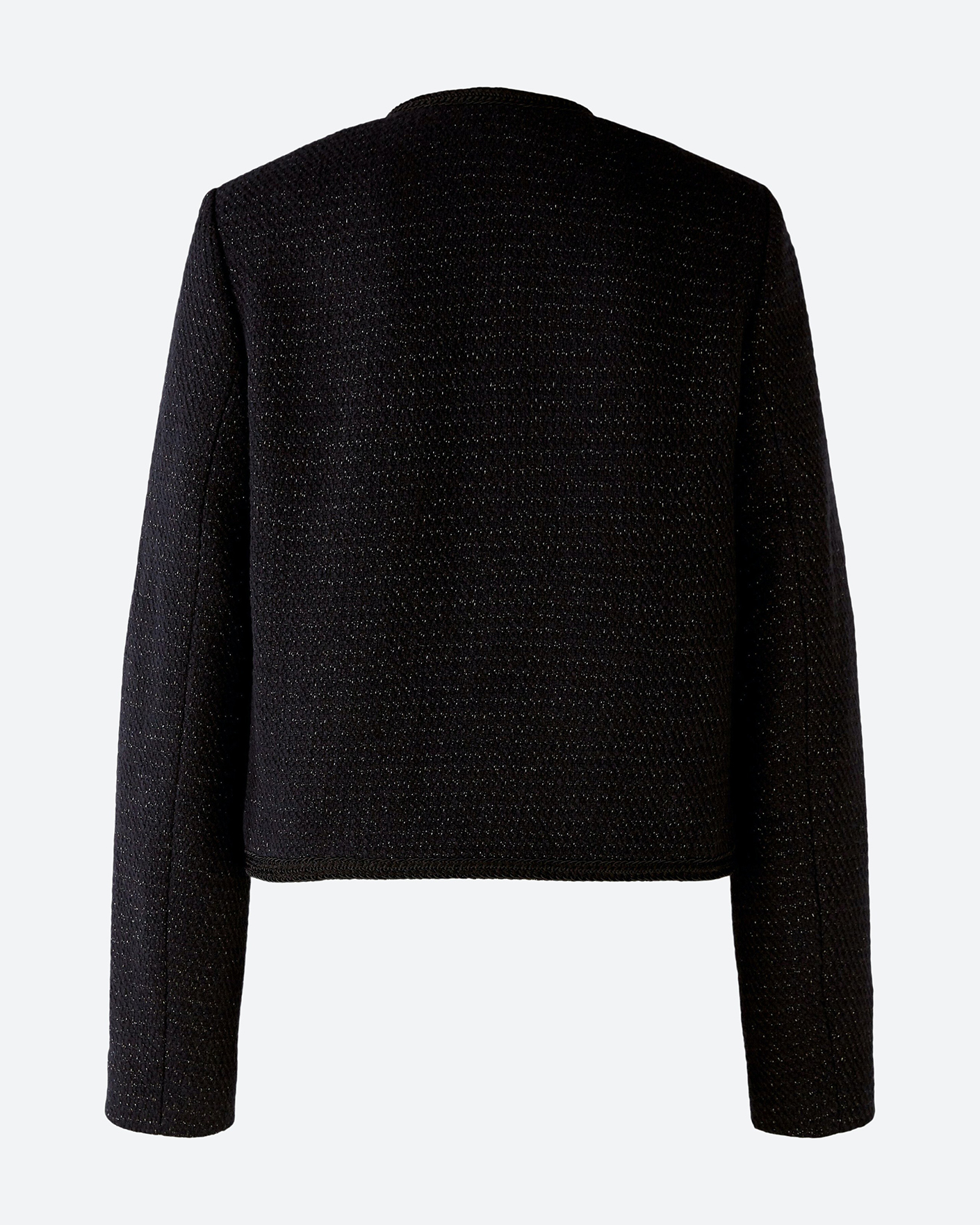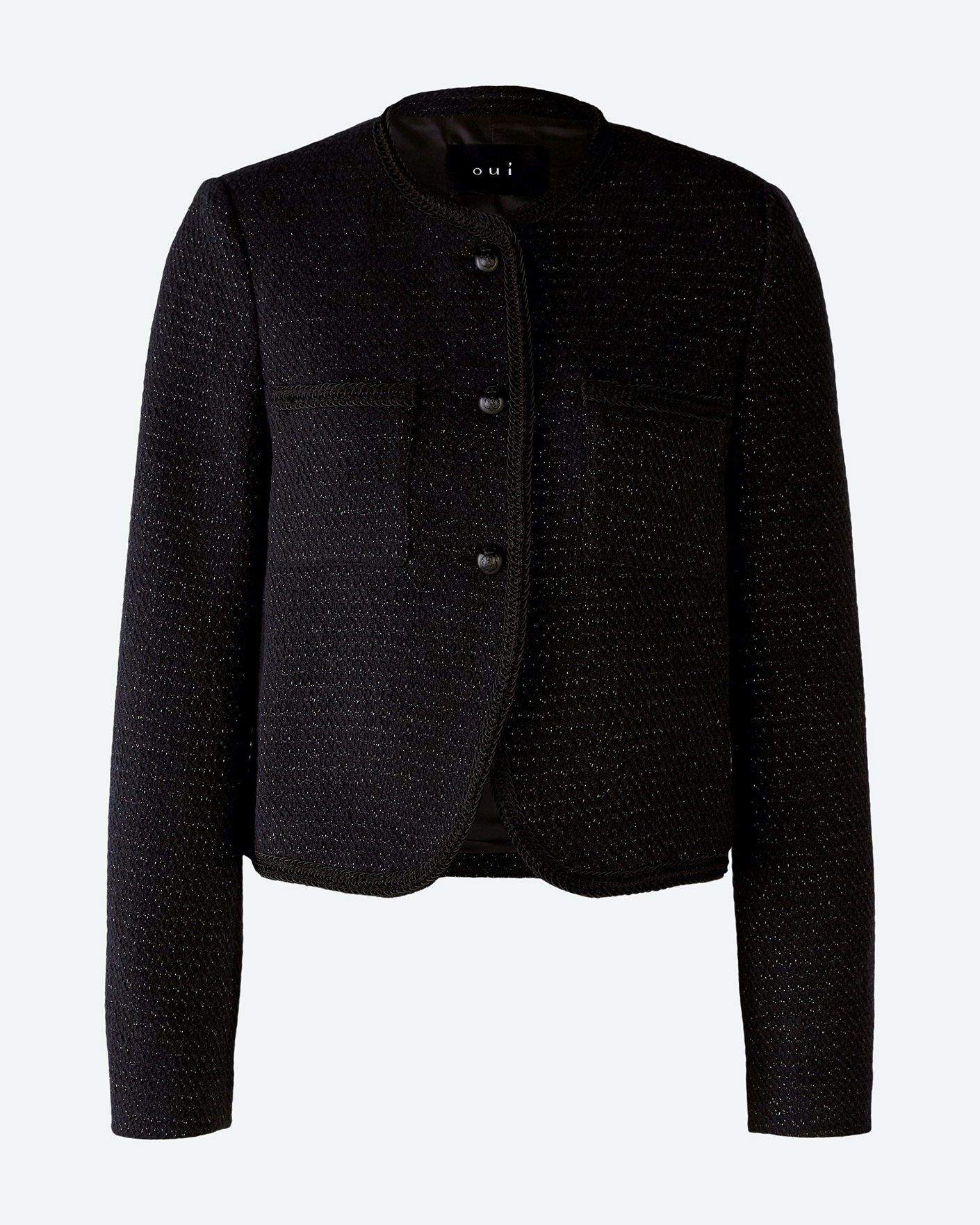 Жакет OUI черного цвета в строчный рисунок с люрексом. Укороченная модель с круглым вырезом, ассиметричным закругленным низом и застежкой на пуговицы. Имеются накладные нагрудные карманы, а также кружевной жгут по краю изделия. Стильный жакет можно сочетать с рубашкой, блузой, водолазкой, юбкой и брюками.
