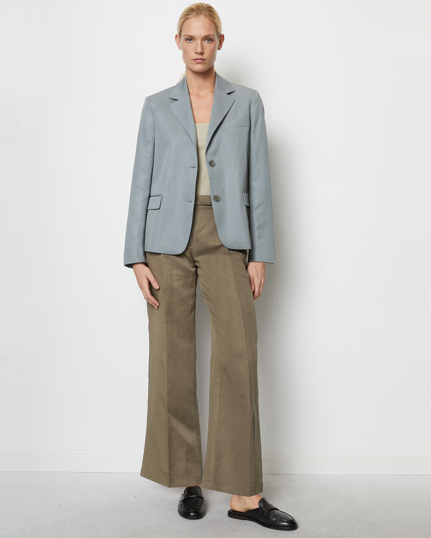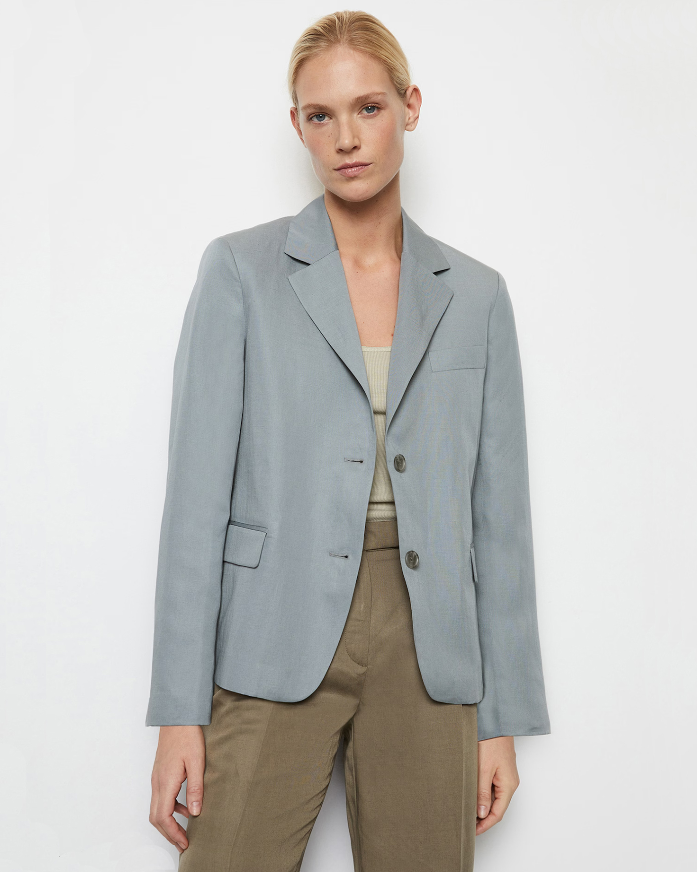 Жакет Marc O'Polo серо-голубого цвета. Модель с лацканами. Застежка на две пуговицы, имеются карманы с клапанами по бокам. Жакет - универсальная вещь на каждый день.
