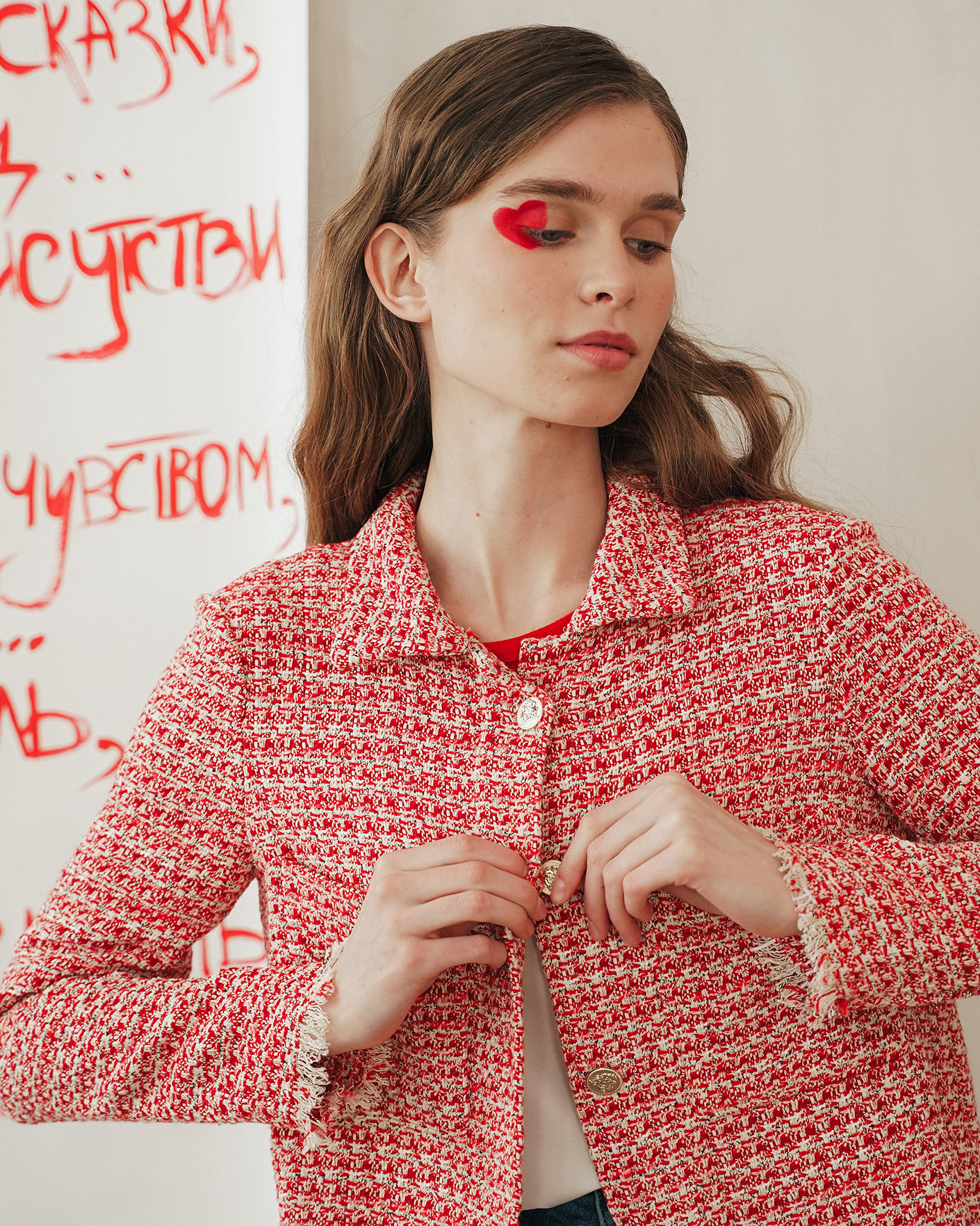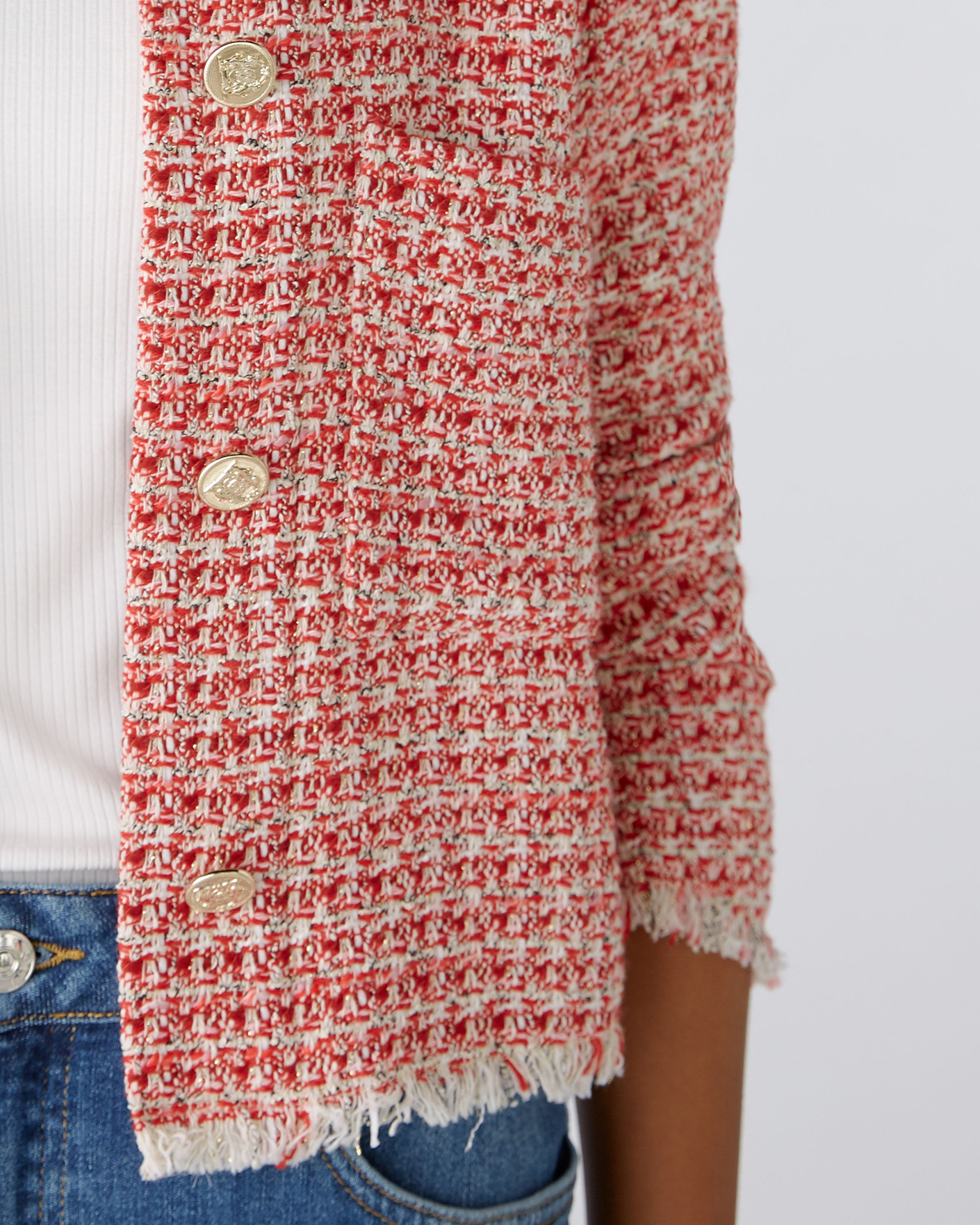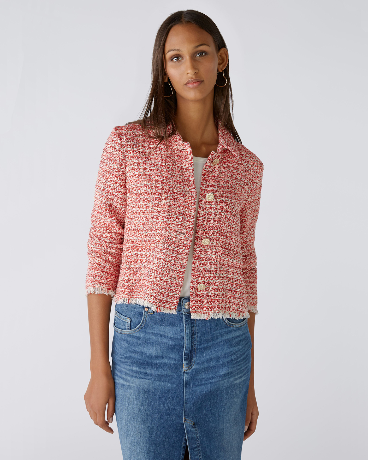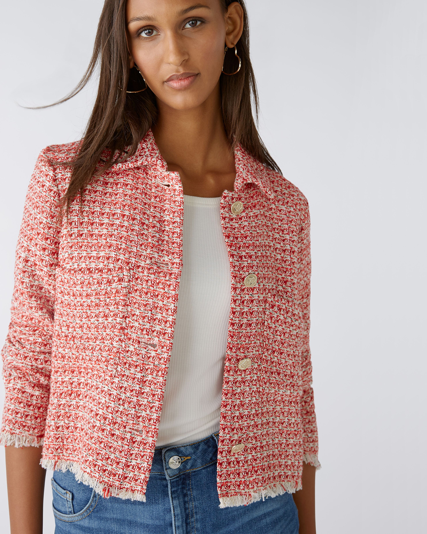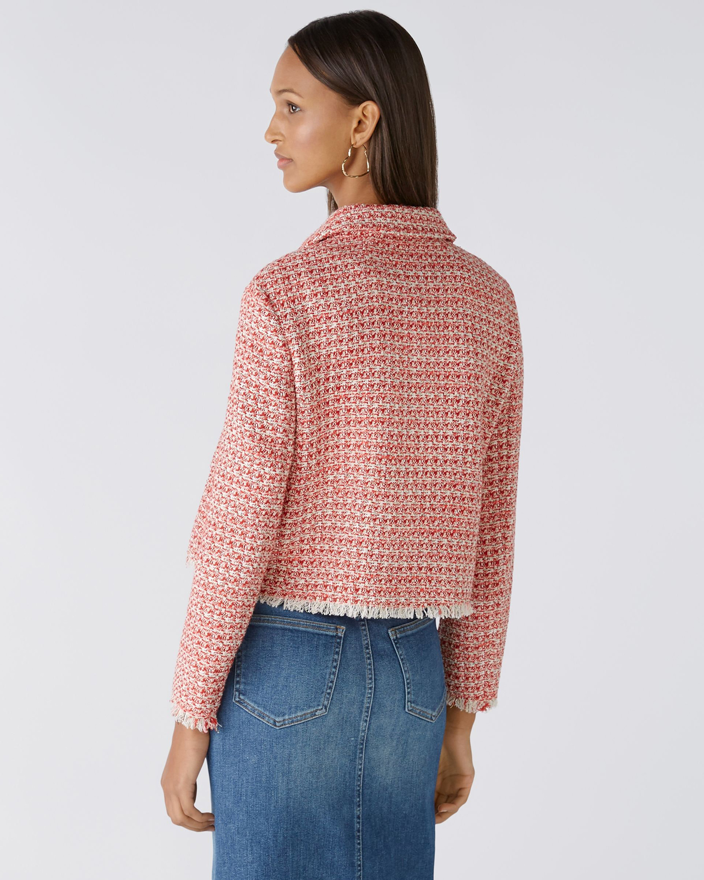 Свободный твидовый жакет OUI бело-красного цвета в строчный рисунок. Модель с отложным воротником, застежка на пуговицы, имеются накладные карманы. Также низ и манжеты декорированы небольшой бахромой. Жакет станет фаворитом вашего гардероба.