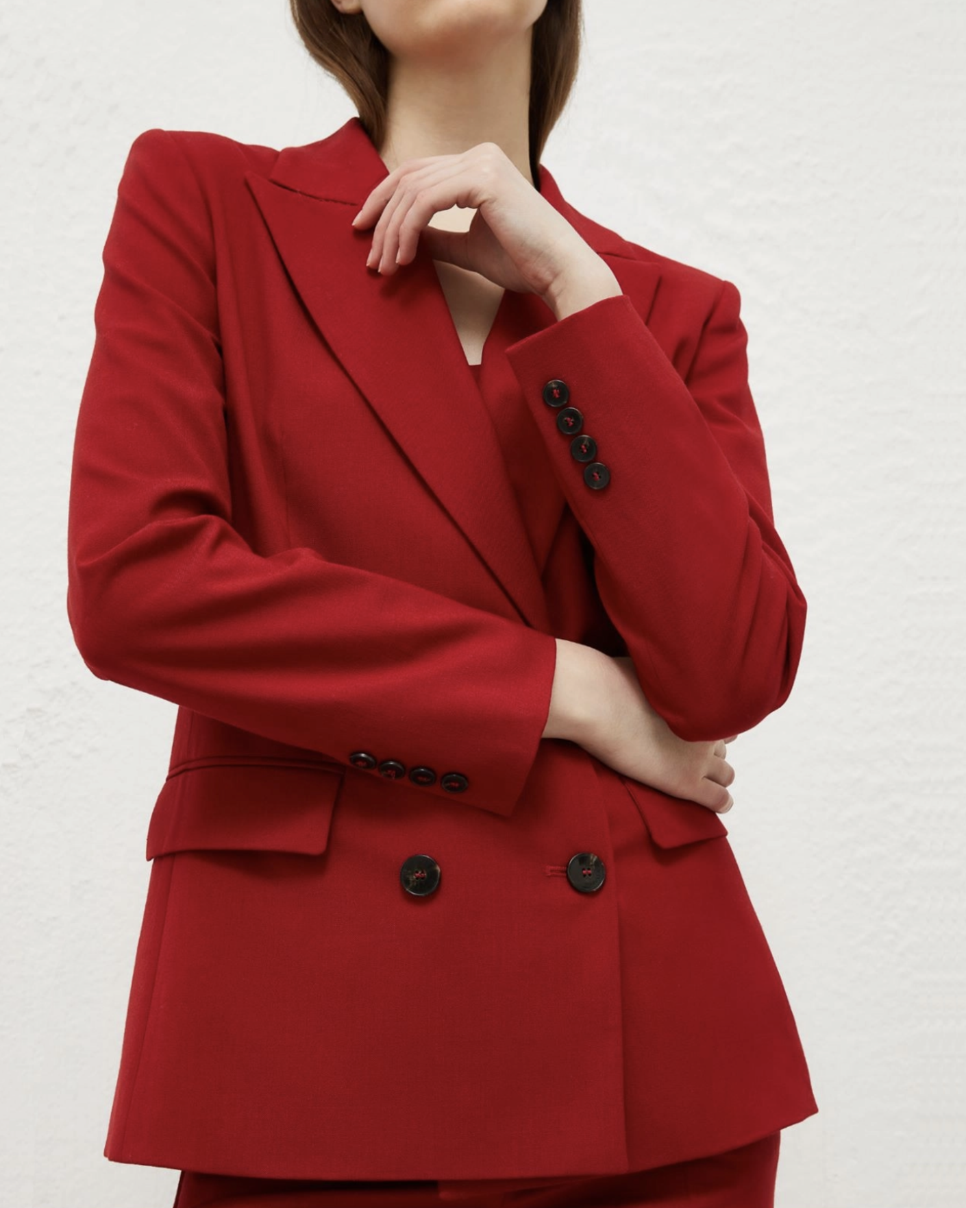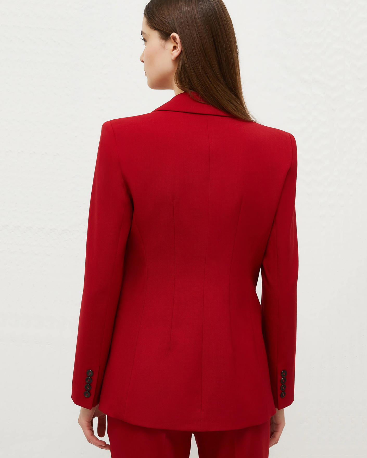 Приталенный двубортный жакет Marella красного цвета. Модель с заостренными лацканами, застежка на контрастные пугвоицы, имеются врезные карманы с клапанами по бокам. Яркий жакет станет акцентной деталью вашего образа.