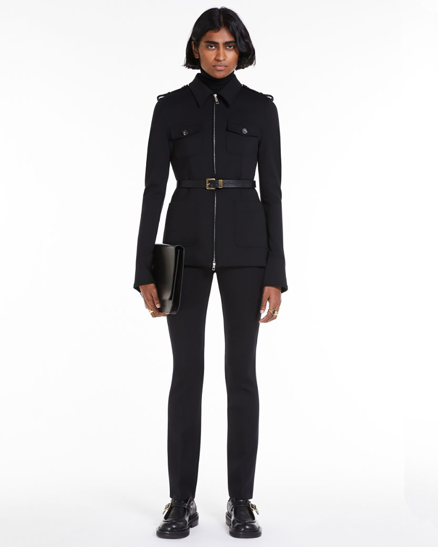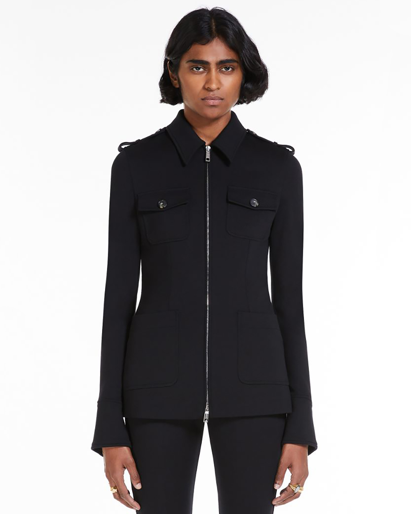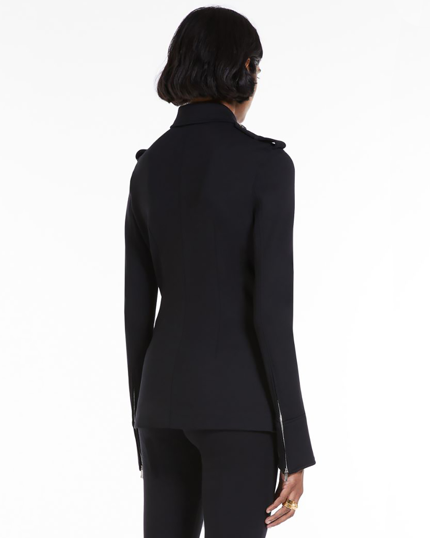 Приталенный жакет-куртка Sportmax черного цвета в строчный рисунок. Шерстяная модель с отложным воротником, застежка на молнию. Имеются накладные карманы по бокам и нагрудные с клапанами на пуговице. Также имеются декоративные шлейки-погоны. Стильный жакет-куртка отлично впишется в ваш гардероб.
