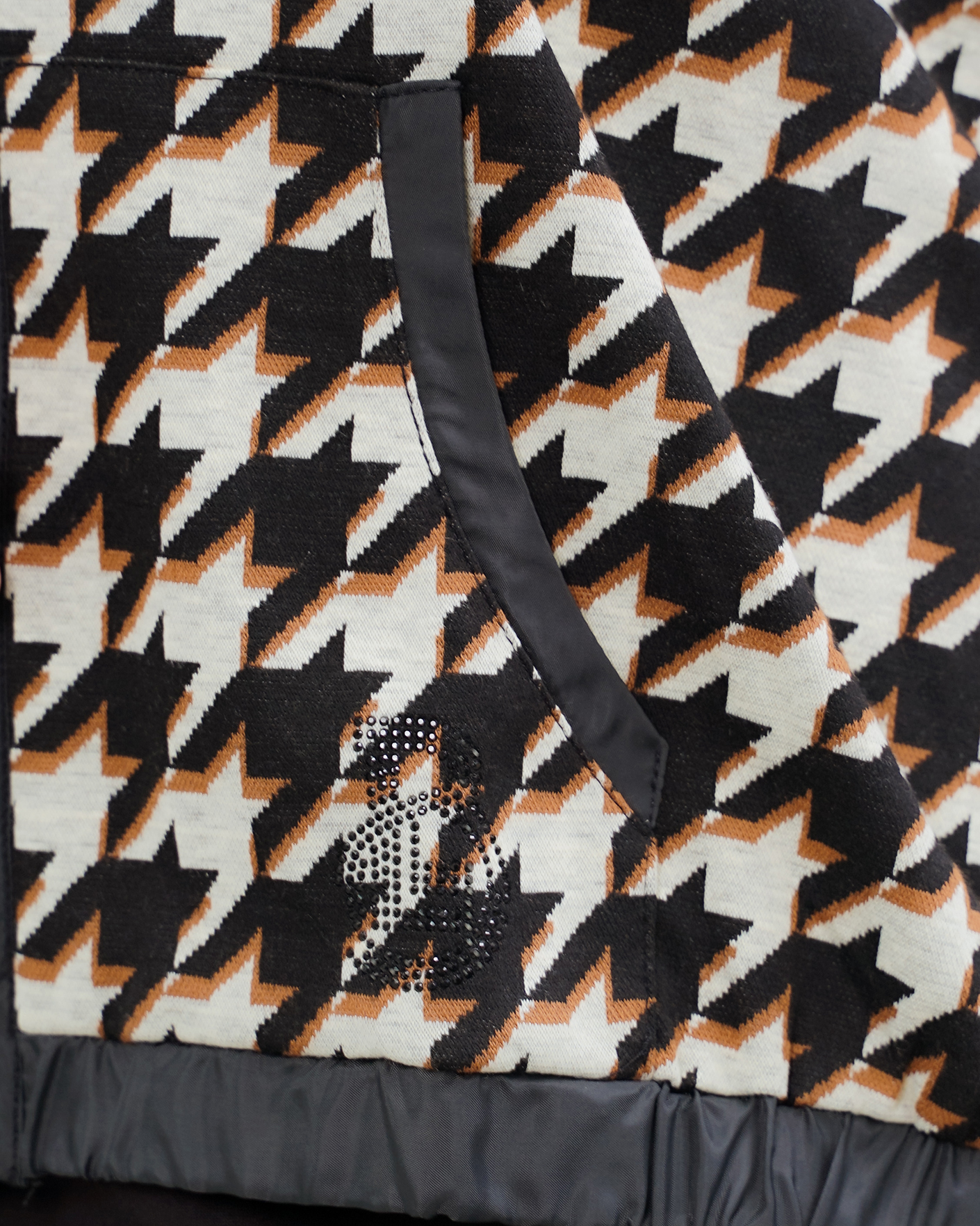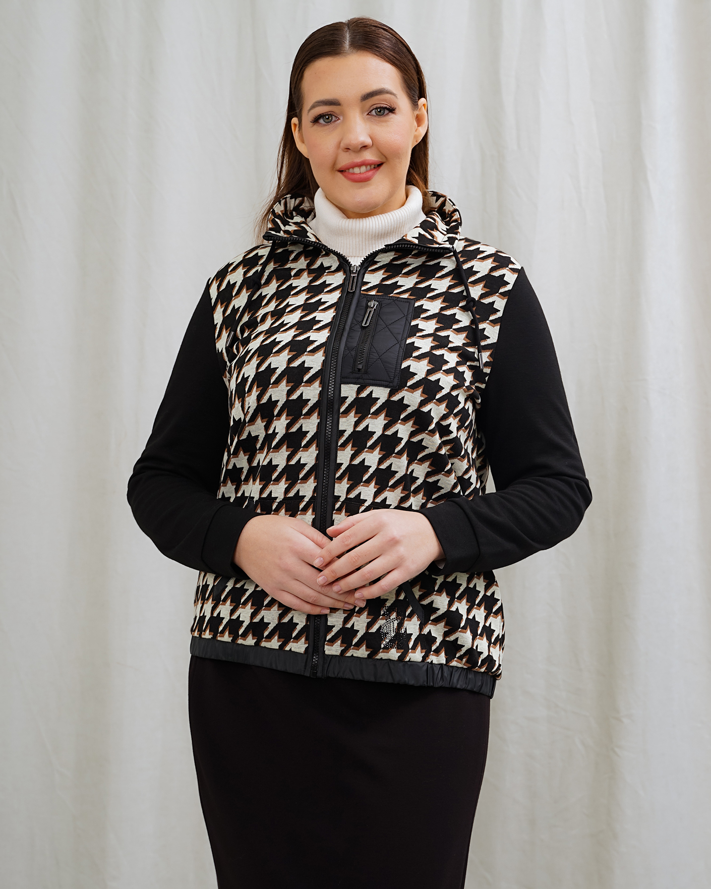 Свободный жакет Barbara Lebek черно-коричневого цвета в крупный рисунок гусиные лапки. Модель с воротником-стойка, застежка на молнию, имеется нагрудный стеганый карман. Стильный жакет отлично впишется в повседневный гардероб.
