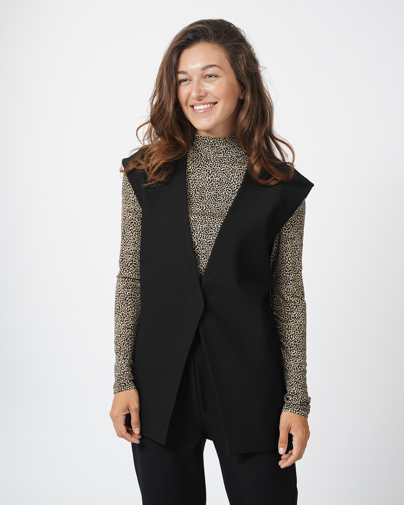 Жилет черного цвета в тонкую диагональную полосу в тон. V-образный вырез визуально удлиняет линию шеи. Ассиметричный крой с застежкой на кнопку.