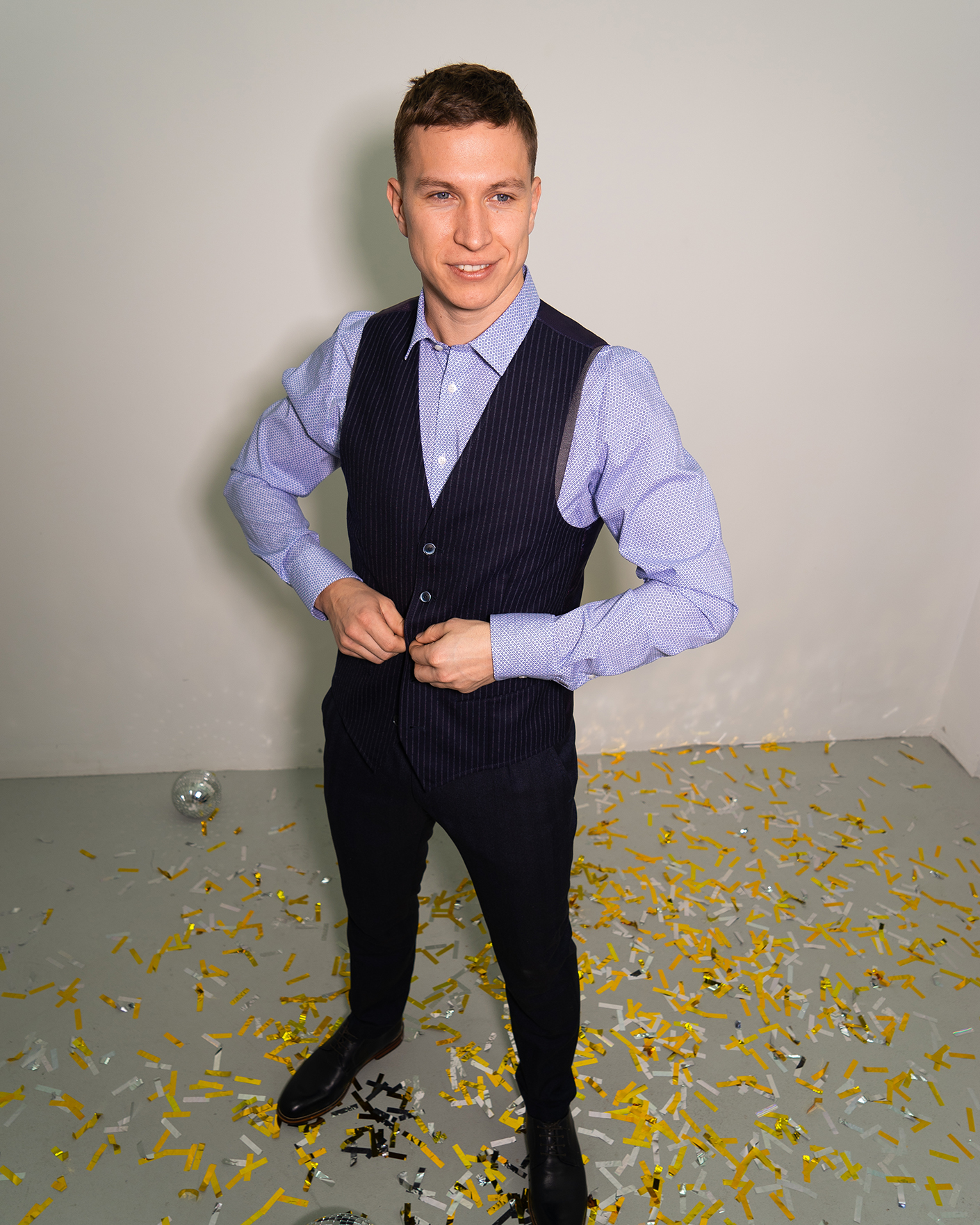 Жилет Digel фиолетово-синего цвета в тонвую вертикальную полосу. Шерстяная модель с V-образным вырезом, застежкой на пуговицы, а также ассиметричным краем. Жилет можно сочетать с тонкой водолазкой, рубашкой, пиджаком и брюками.