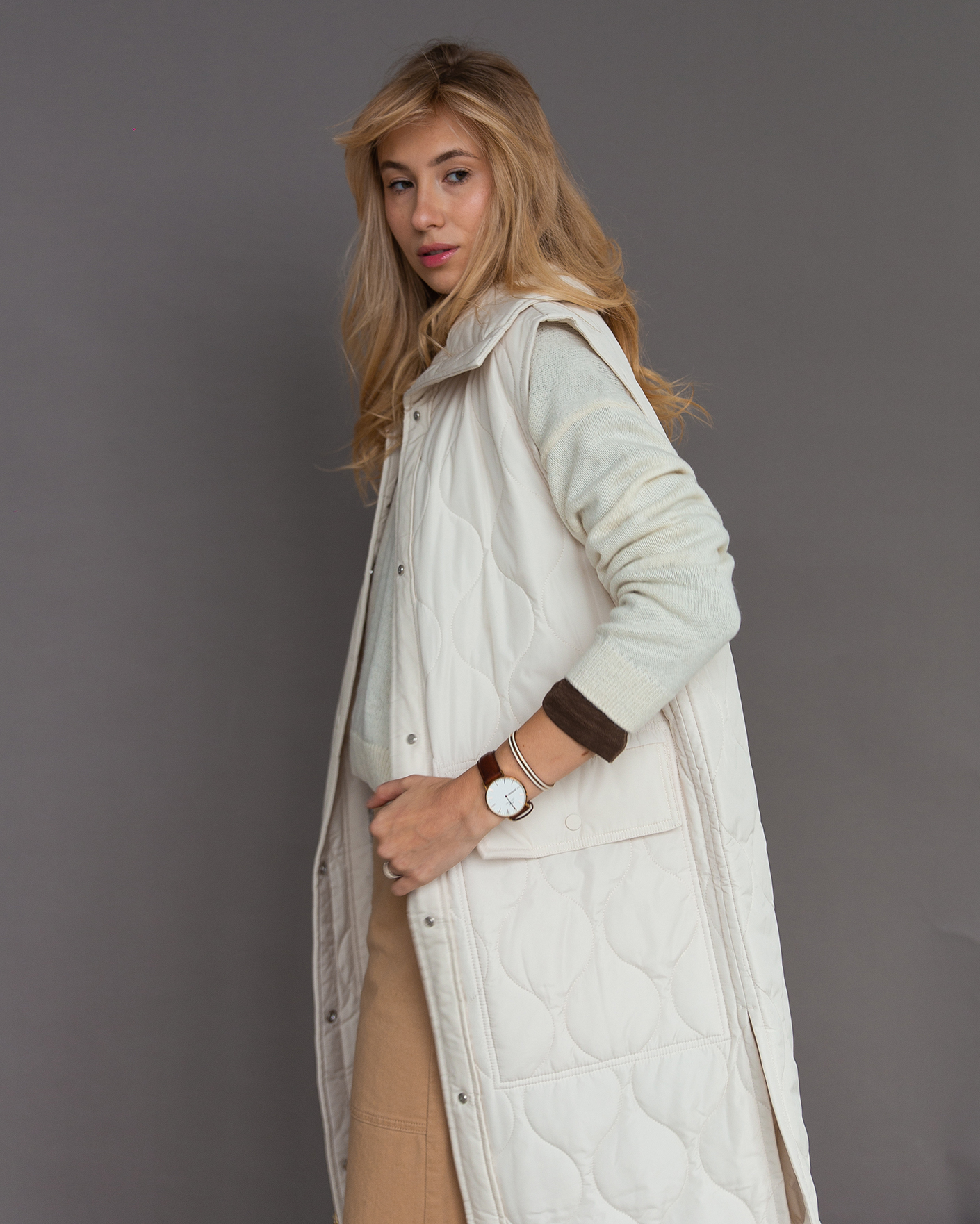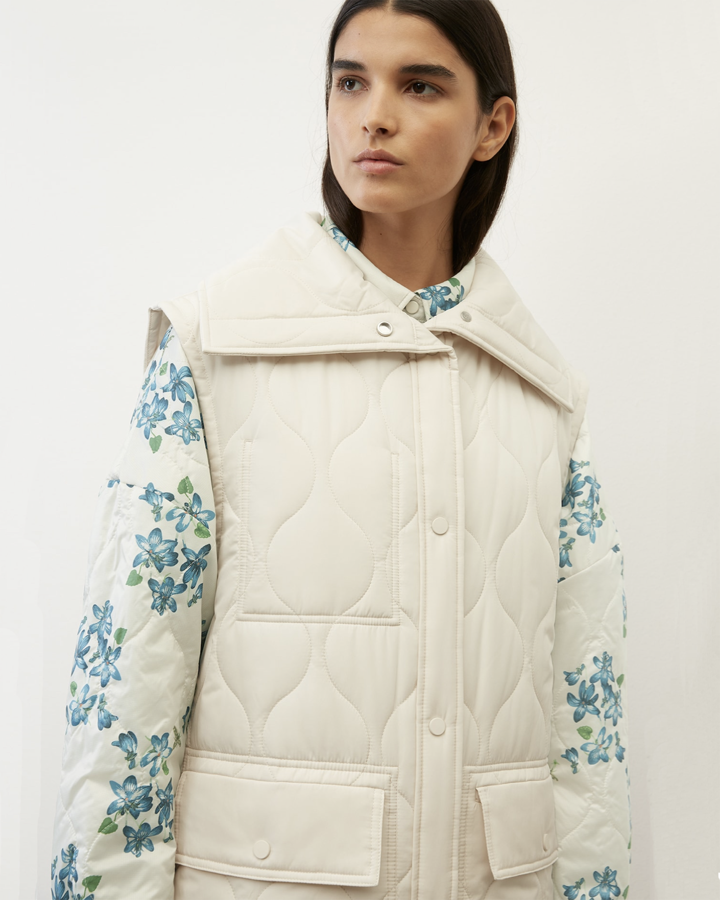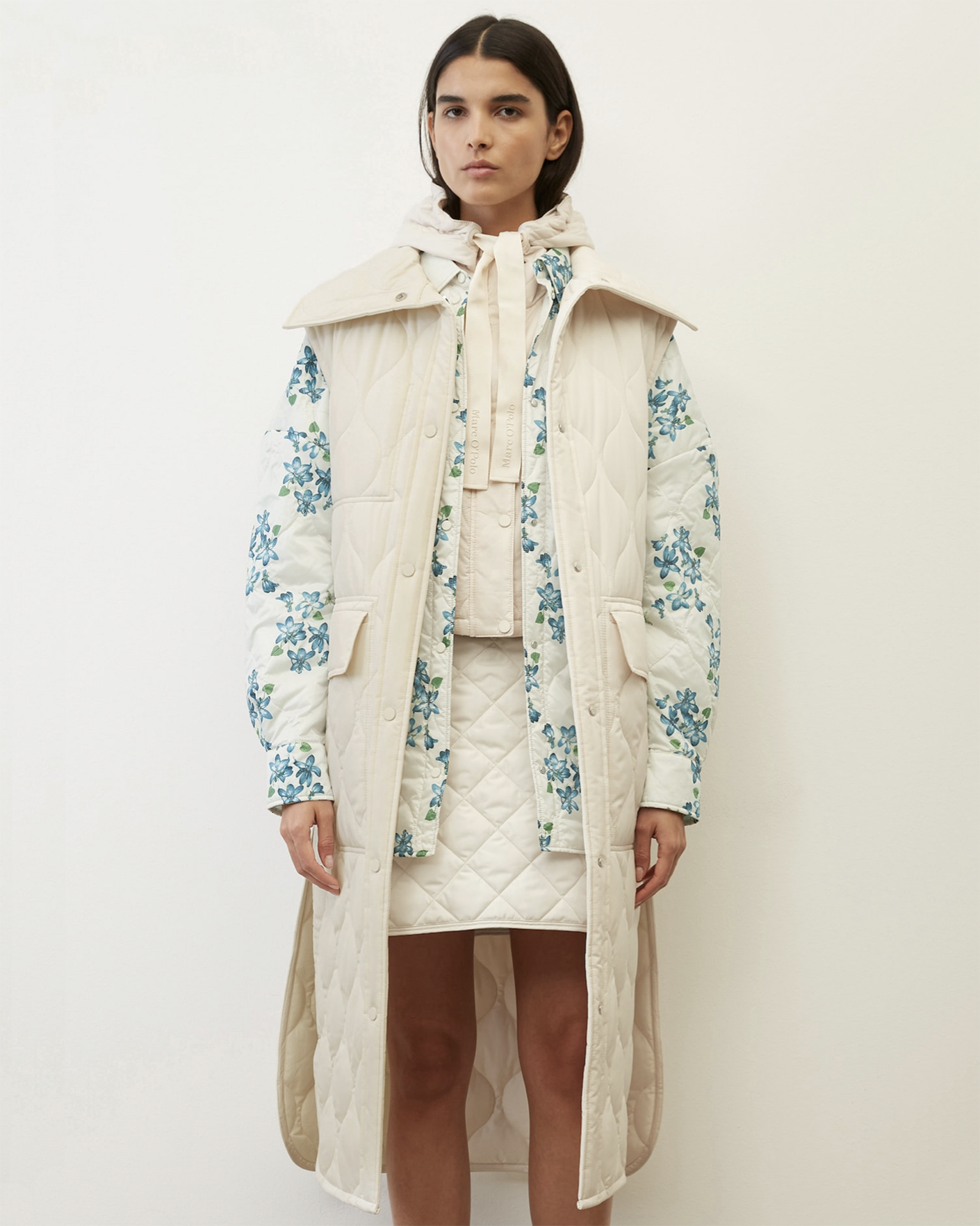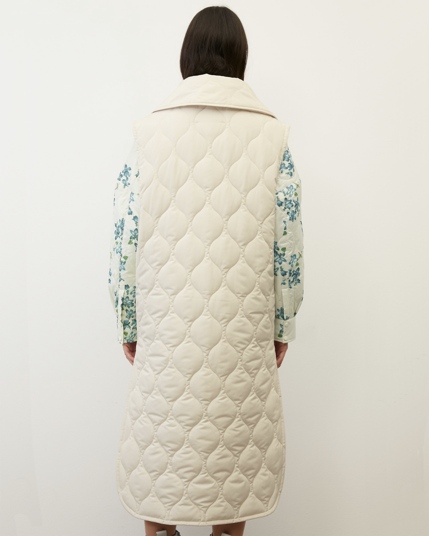Утепленный жилет Marc O'Polo белого цвета в геометрическую стежку. Модель с удлиненным воротником-стойка, застежка на кнопки в тон. Имеются накладные карманы с клапанами по бокам, длина ниже колена с боковыми разрезами. Стильный жилет отлично сочетается с повседневным гардеробом.