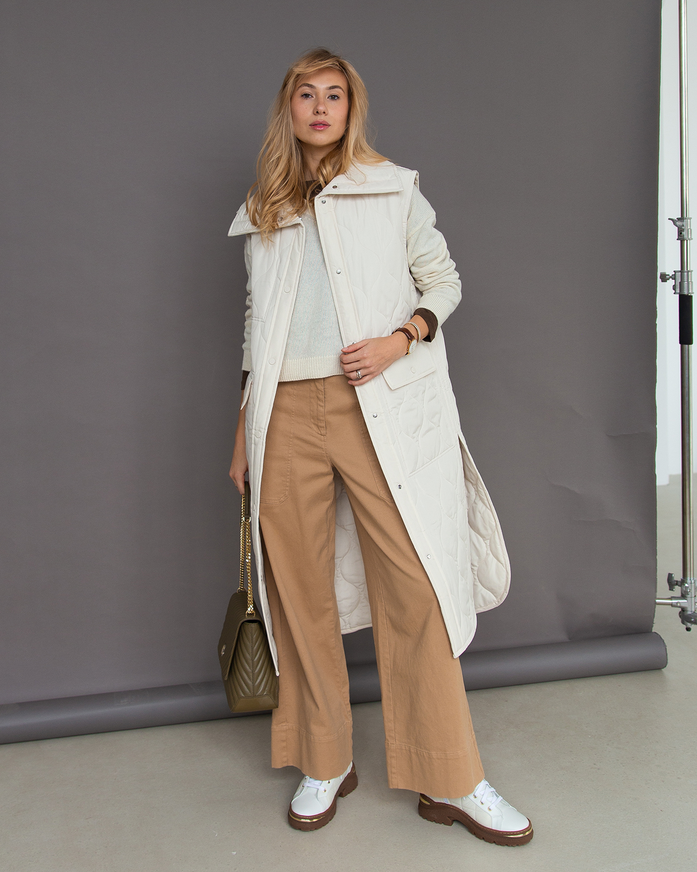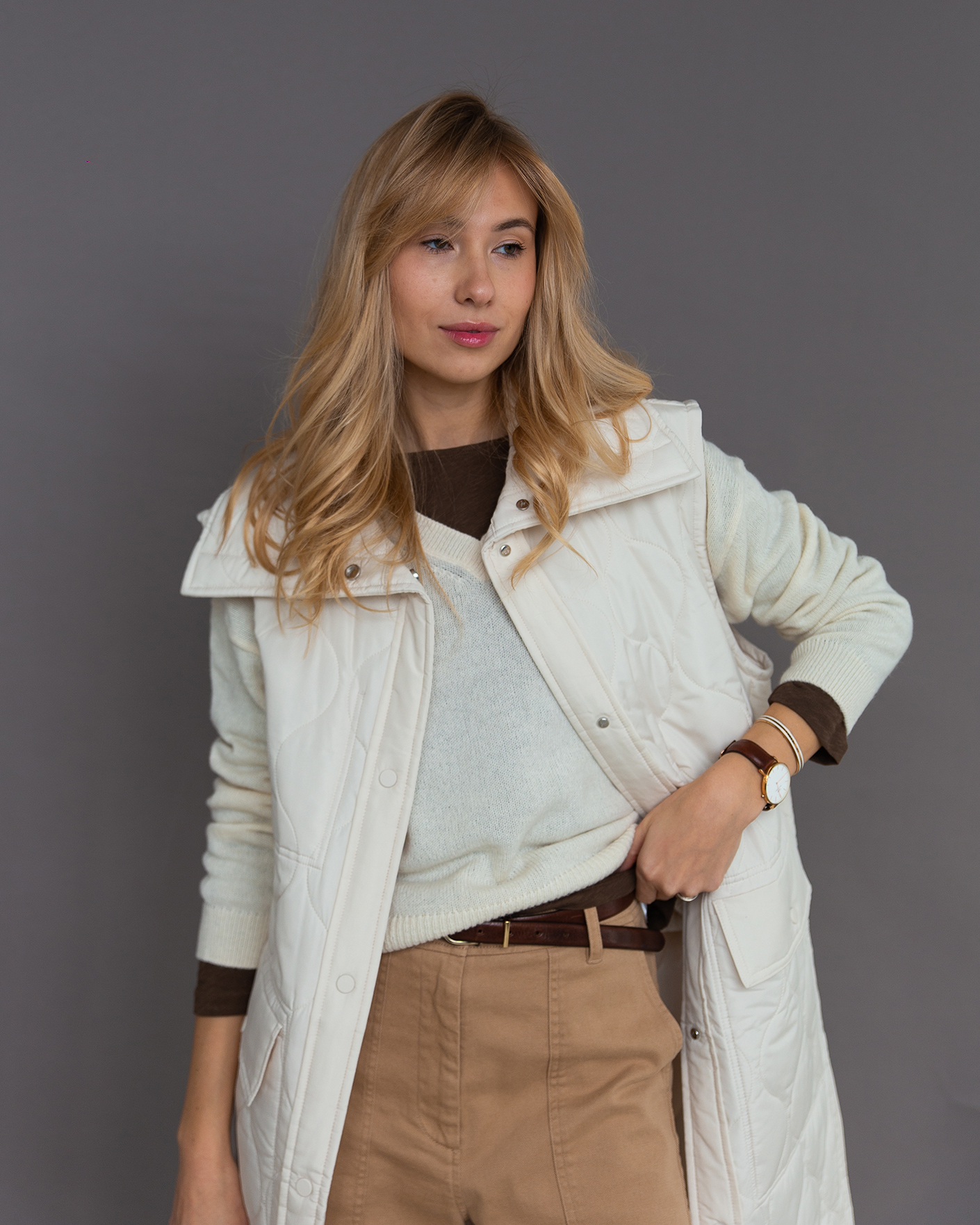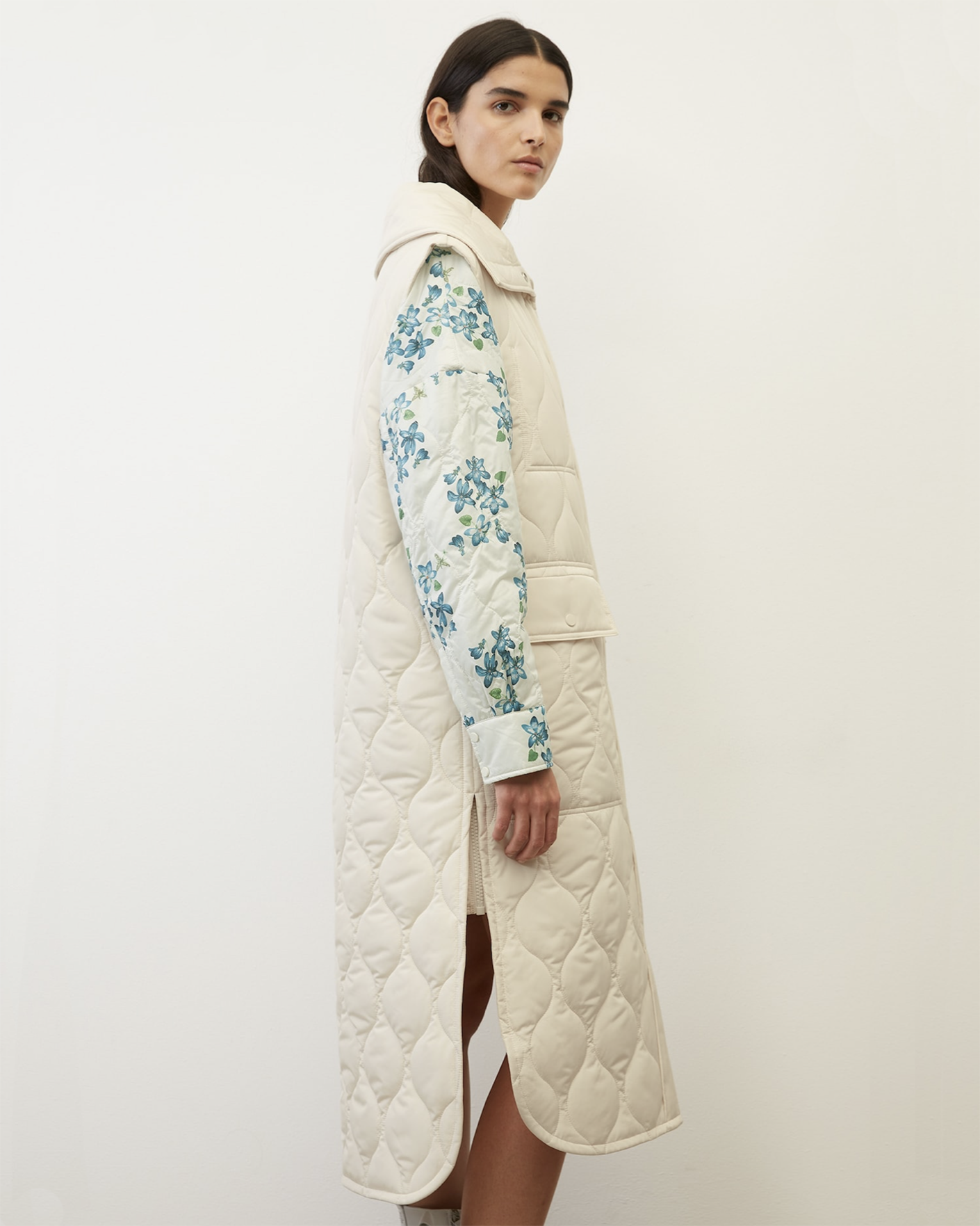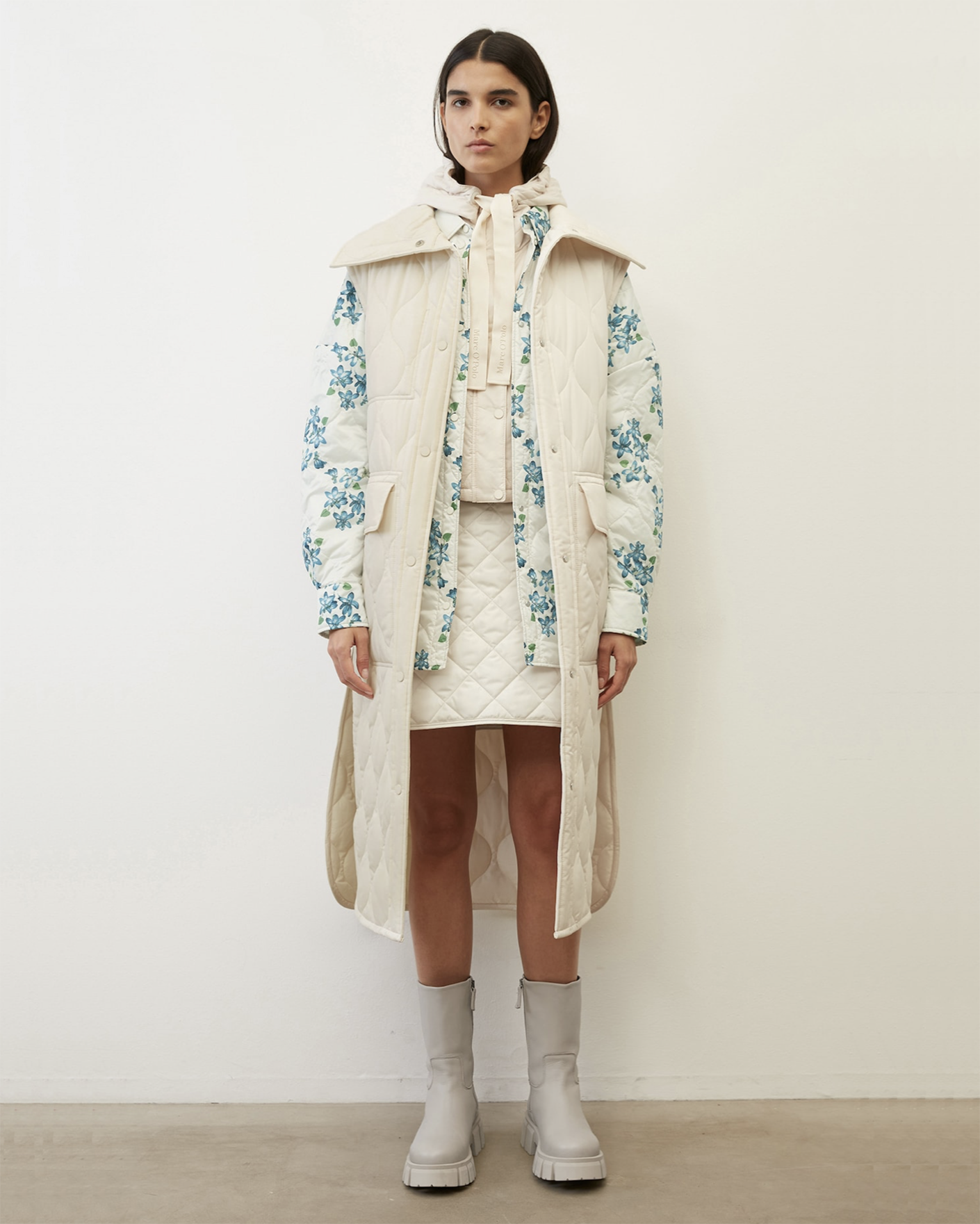 Утепленный жилет Marc O'Polo белого цвета в геометрическую стежку. Модель с удлиненным воротником-стойка, застежка на кнопки в тон. Имеются накладные карманы с клапанами по бокам, длина ниже колена с боковыми разрезами. Стильный жилет отлично сочетается с повседневным гардеробом.