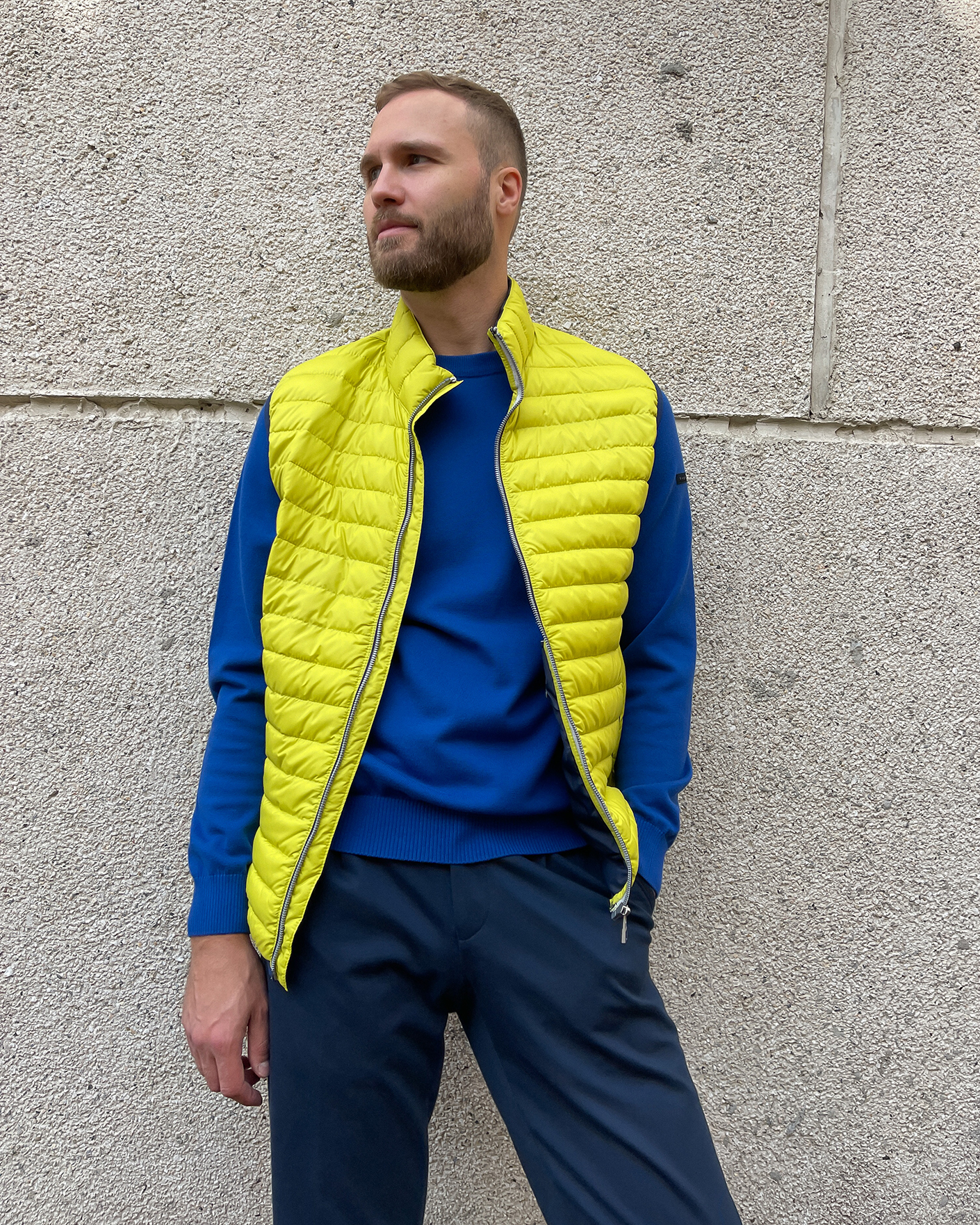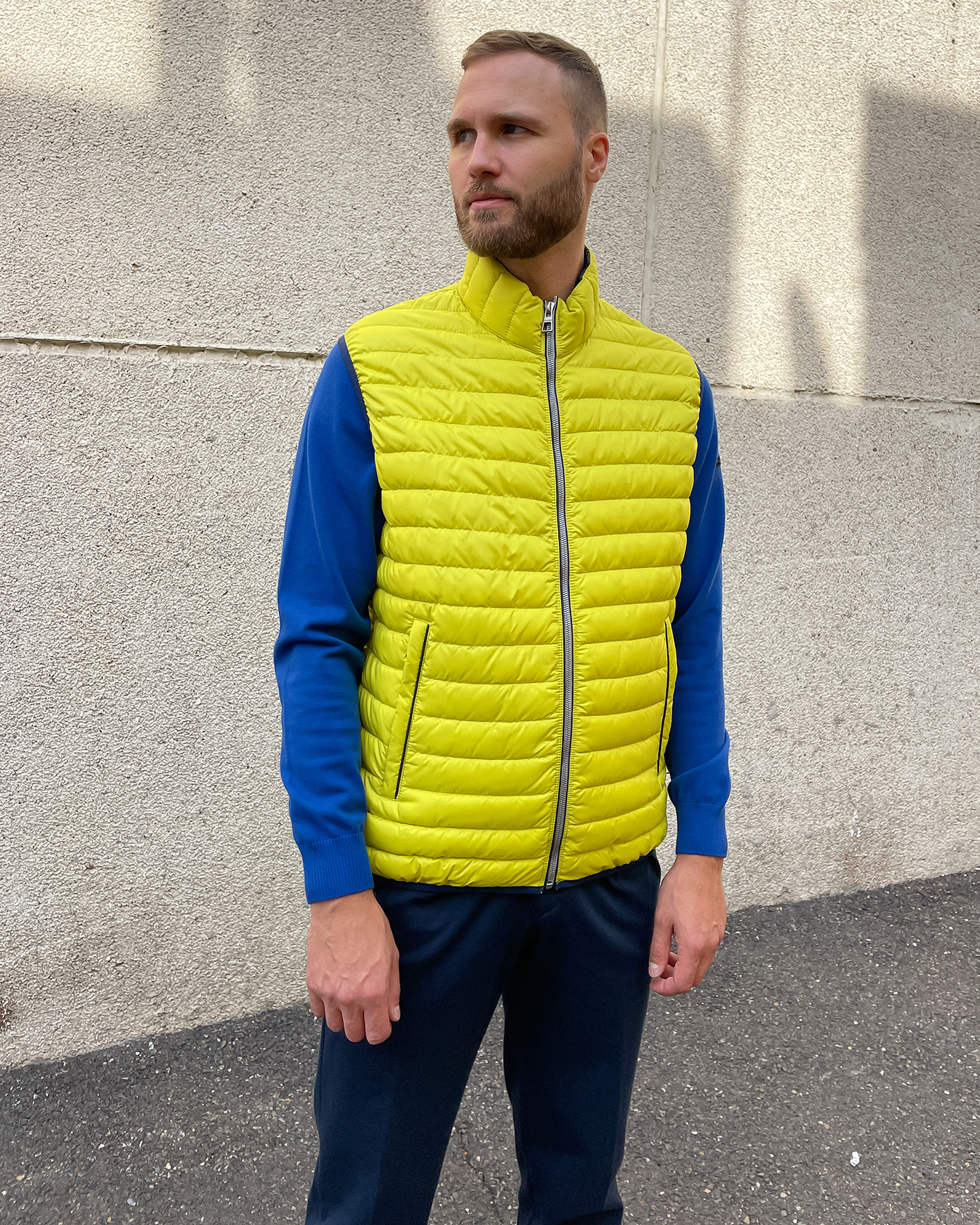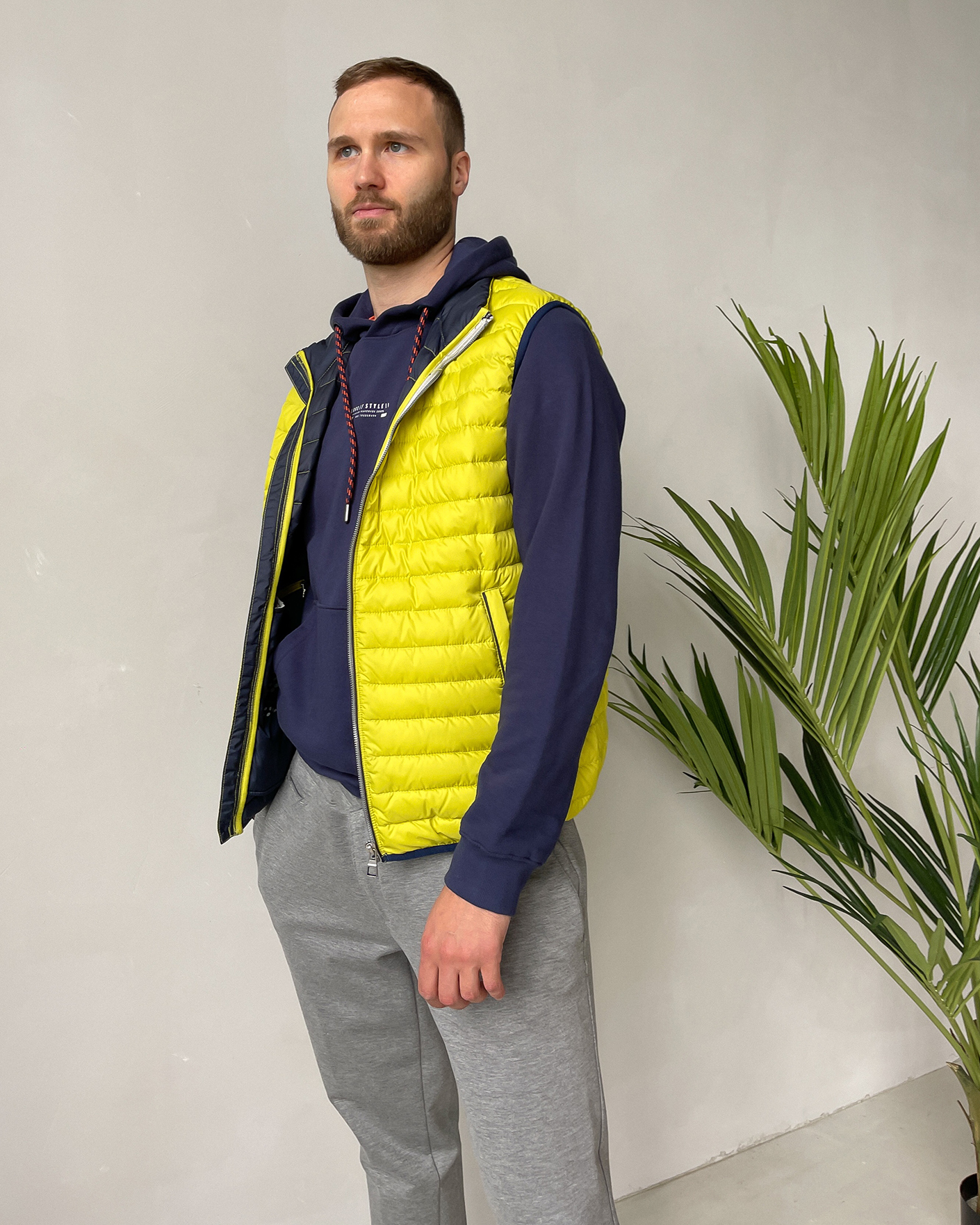 Утепленный жилет Bugatti цвета киви в горизонтальную стежку. Модель с воротником-стойка, застежкой на контрастную молнию, также имеются боковые карманы на молнии. Стильный и яркий жилет станет отличным дополнением к вашему образу для прогулок.