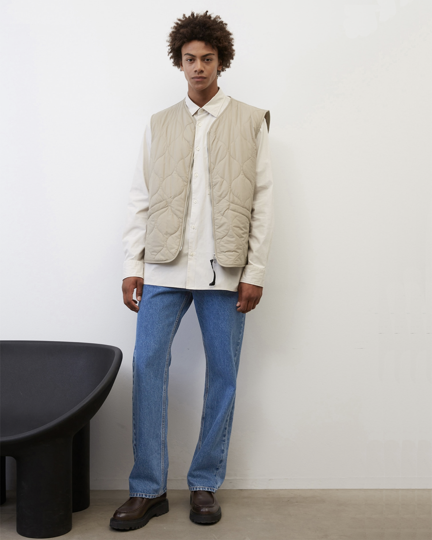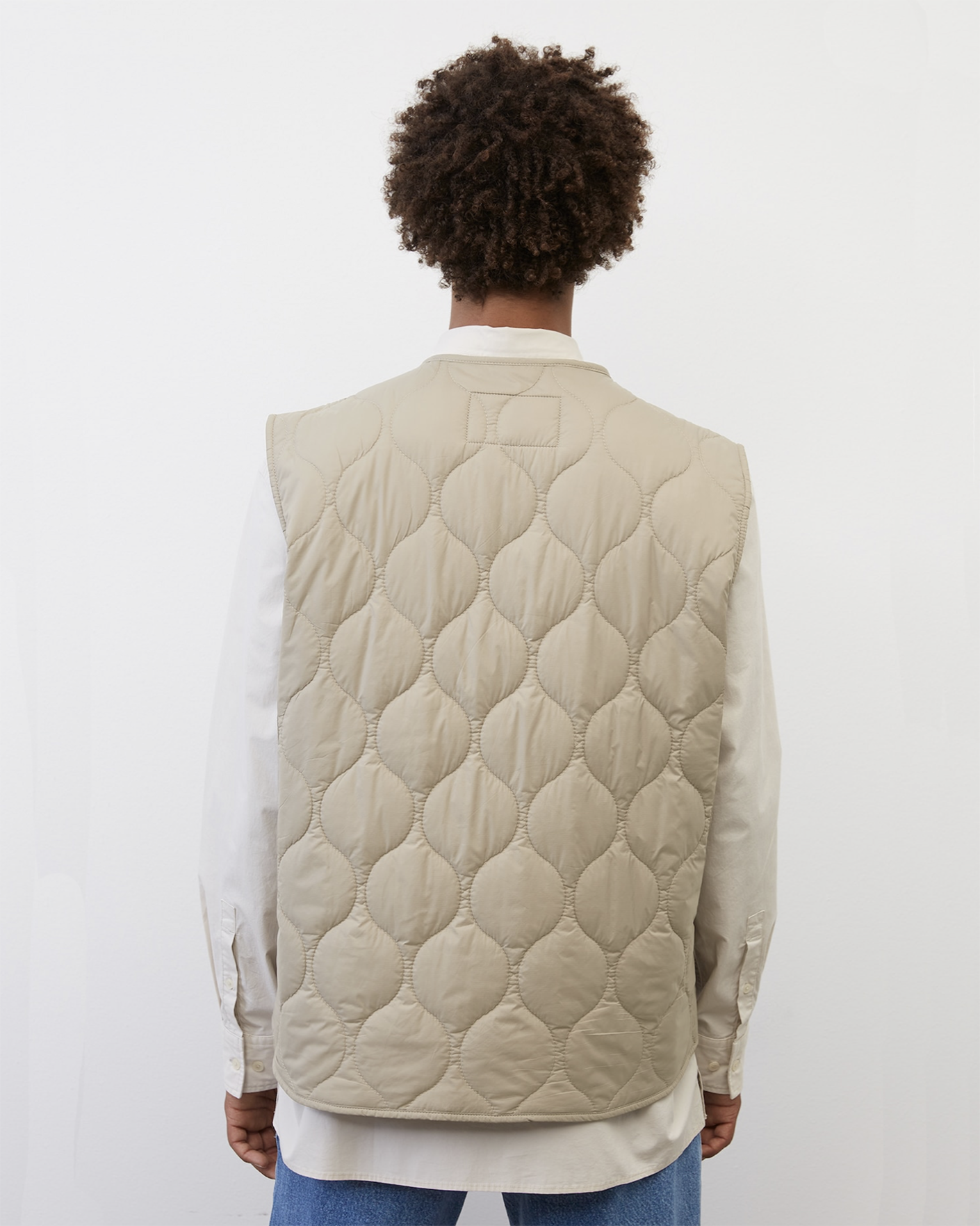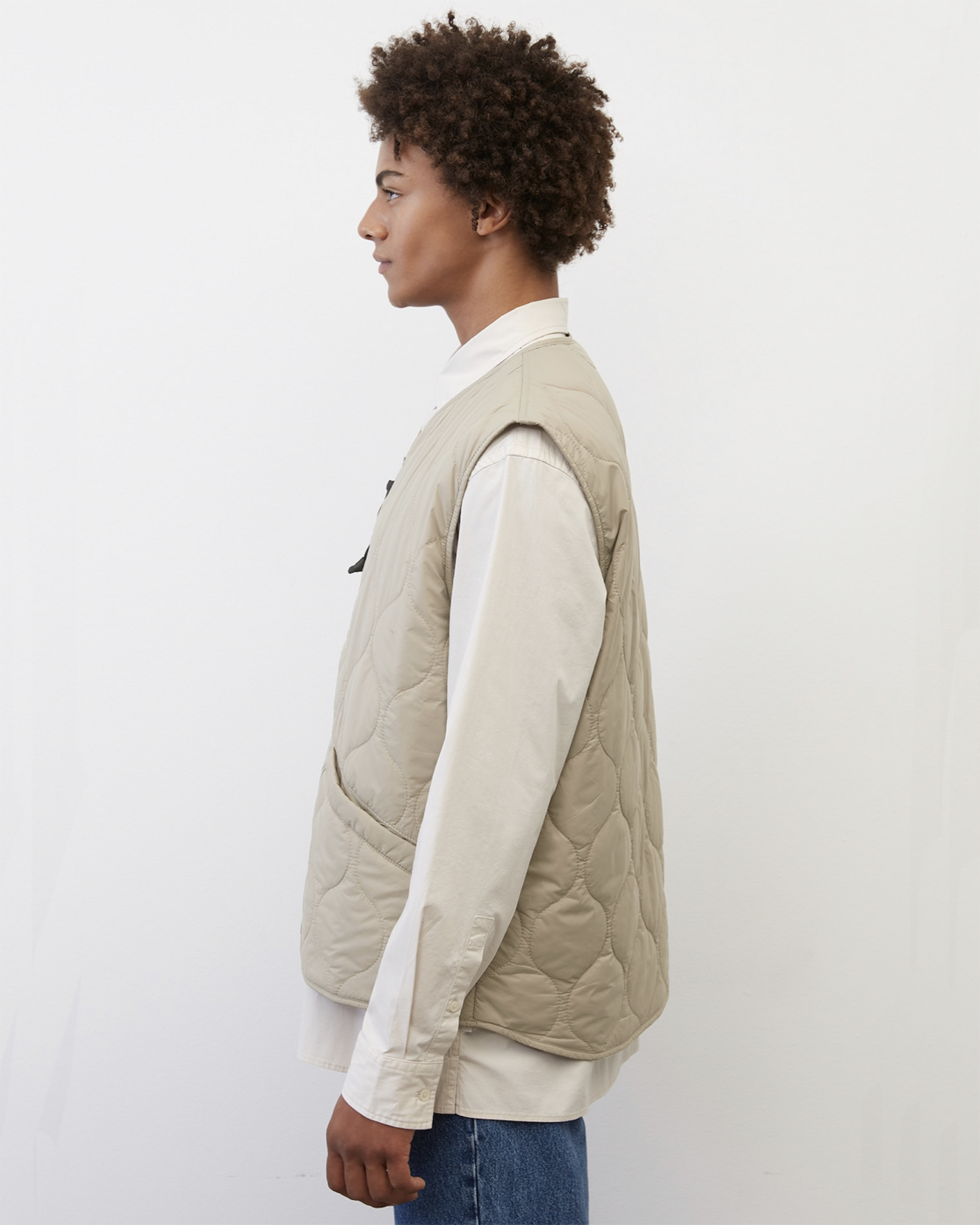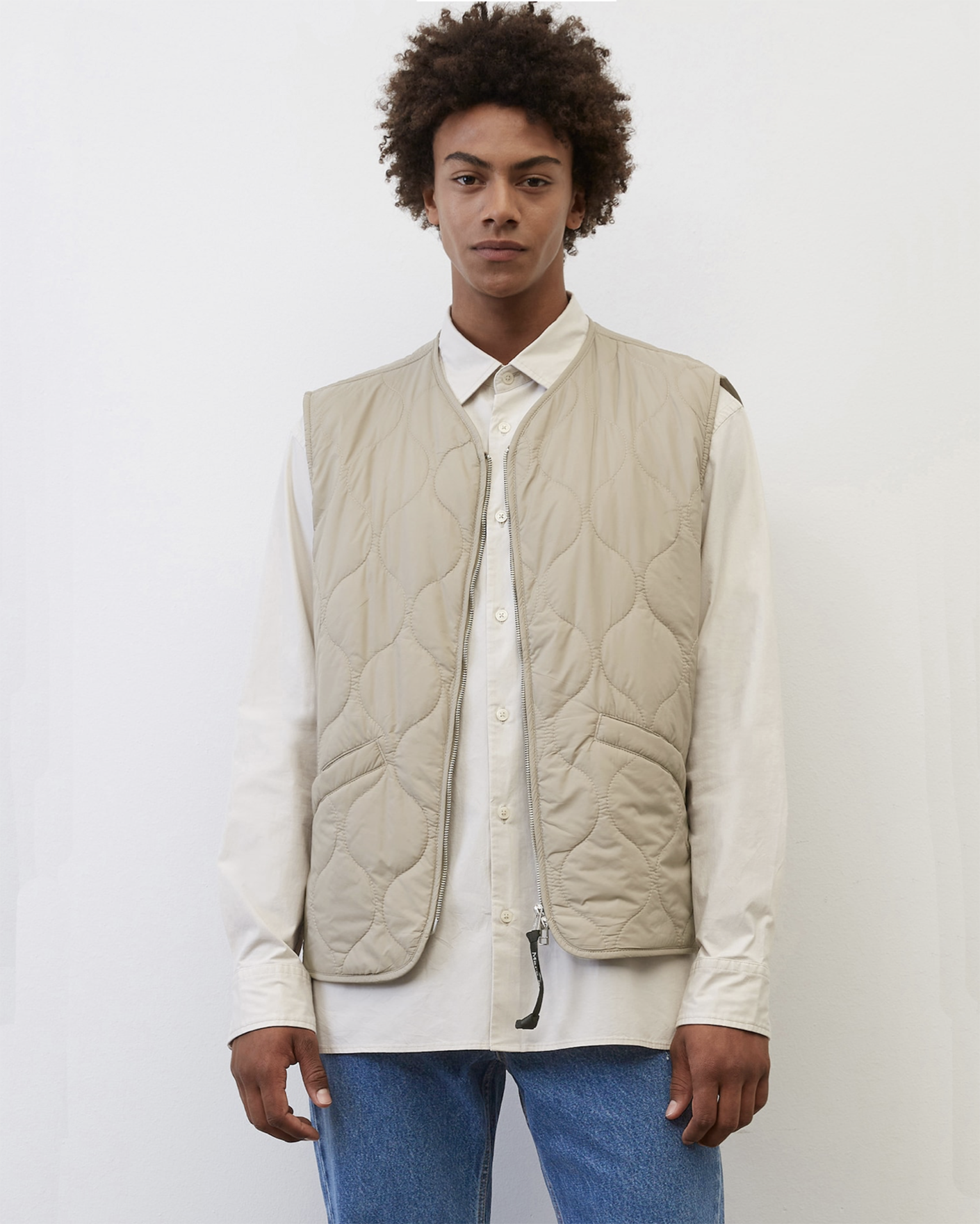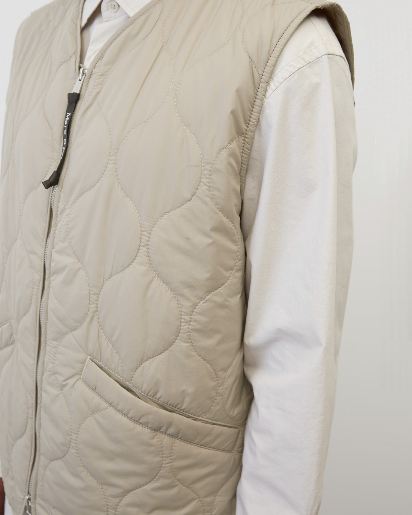 Утепленный жилет Marc O'Polo оливково-бежевого цвета в геометрическую стежку. Модель с небольшим V-образным вырезом и застежкой на молнию. Имеются врезные карманы по бокам. Жилет можно сочетать с джемпером, толстовкой, свитшотом, брюками и джинсами.