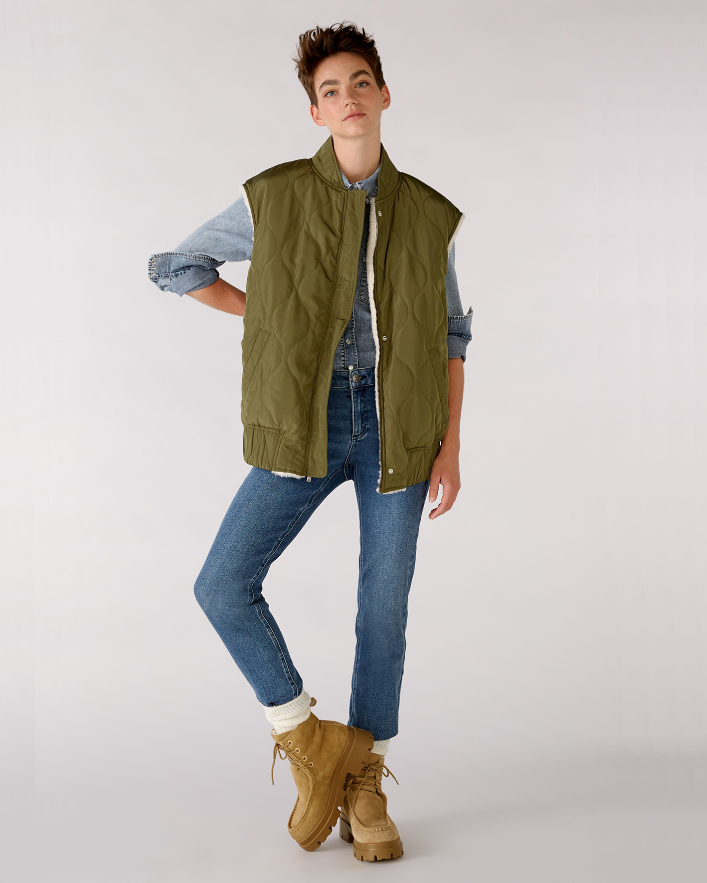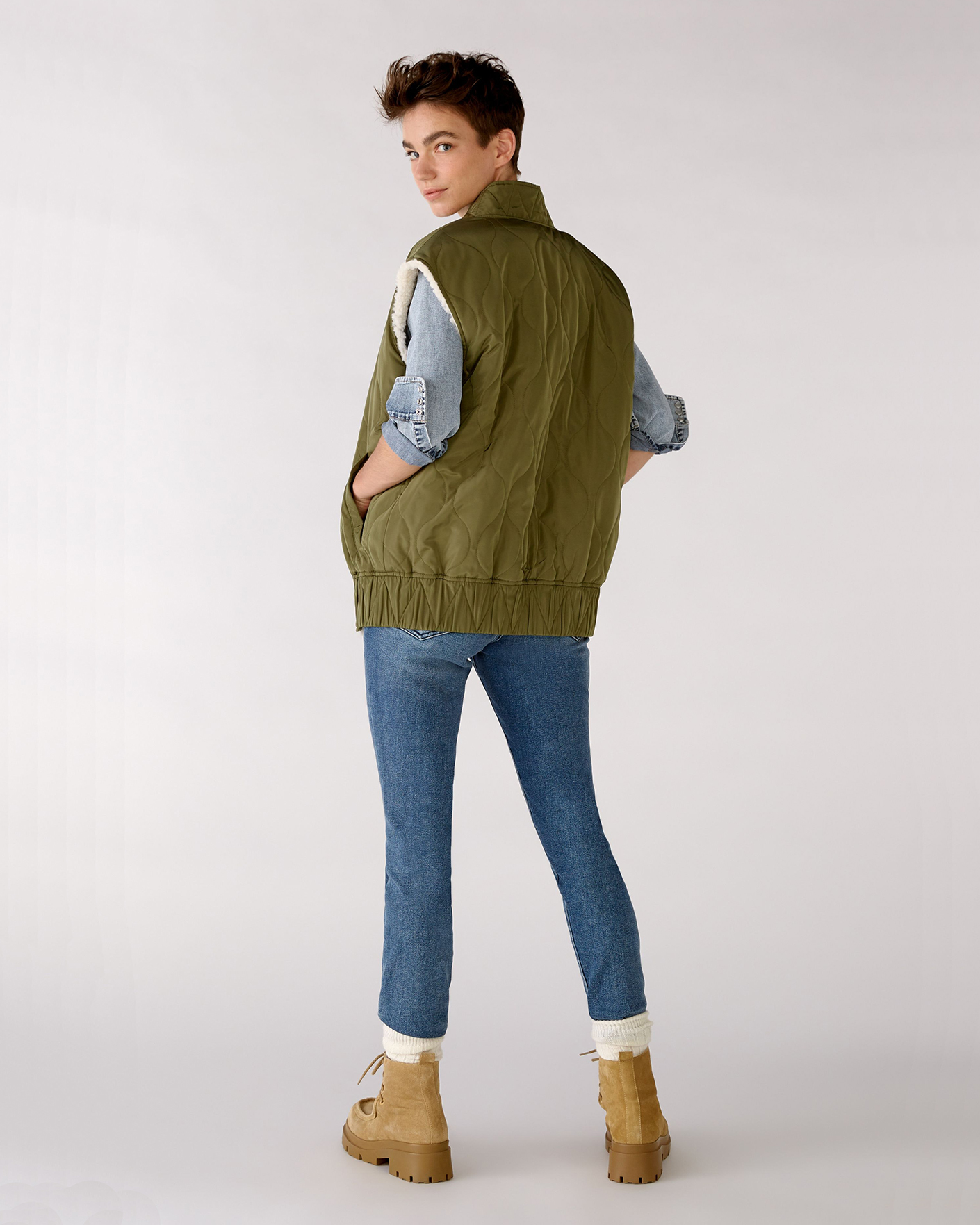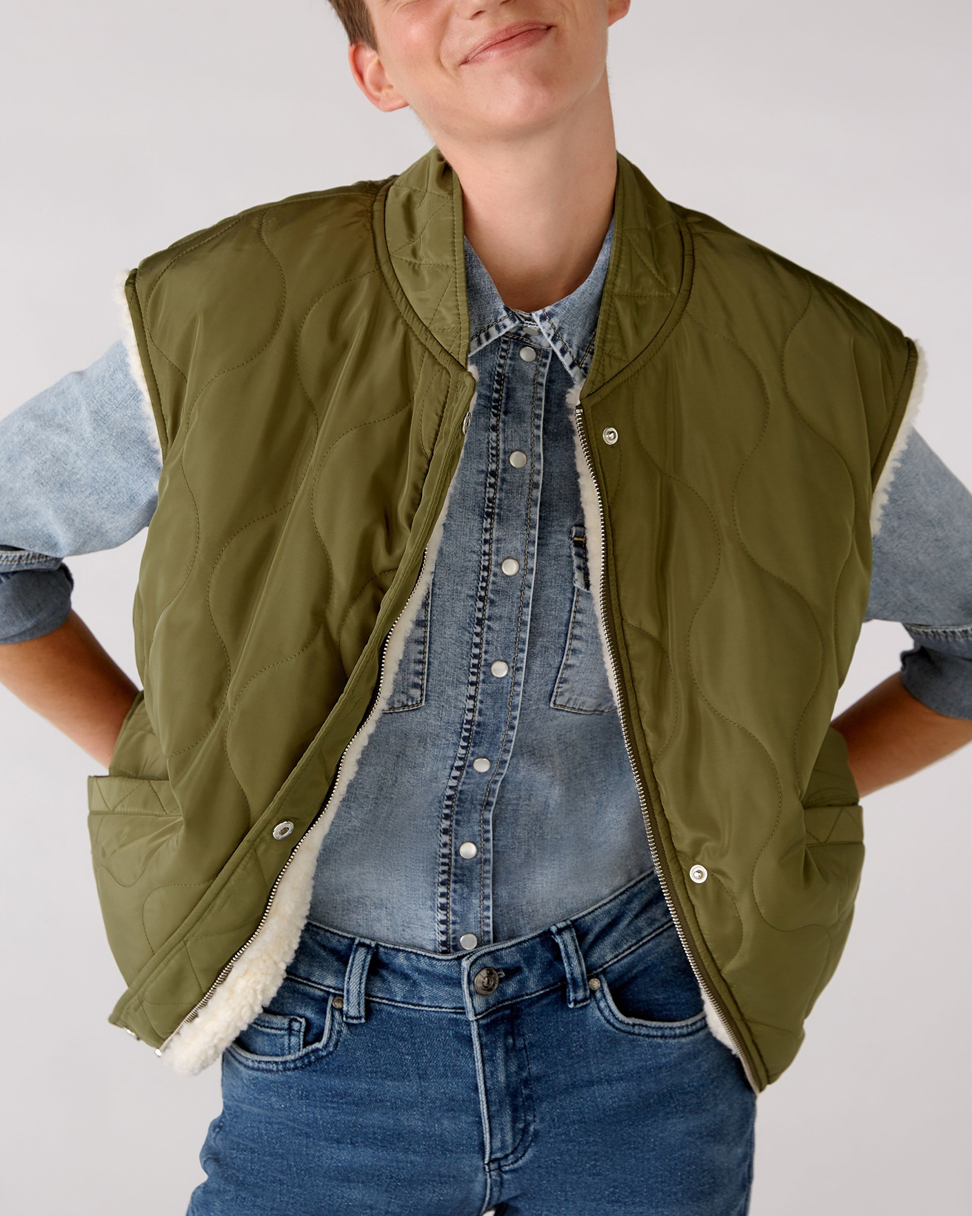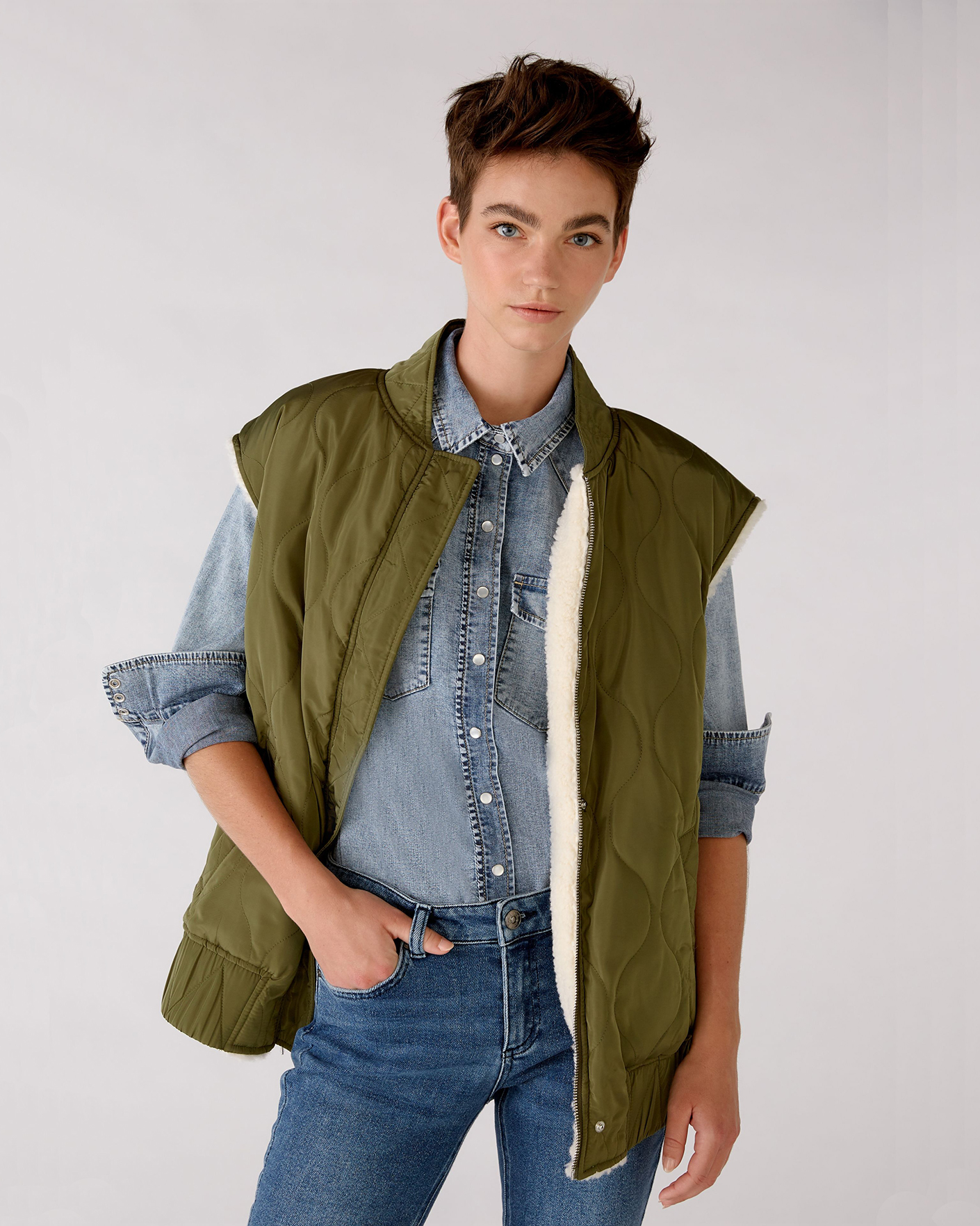 Утепленный жилет OUI цвета хаки и белого. Модель можно носить с двух сторон: стеганой или меховой наружу. Удлиненный ворот, застежка на молнию и планку на кнопки. Имеются карманы по бокам и широкая резинке в складку по низу. Стильный жилет станет фаворитом вашего гардероба и подстроится под настроение дня.