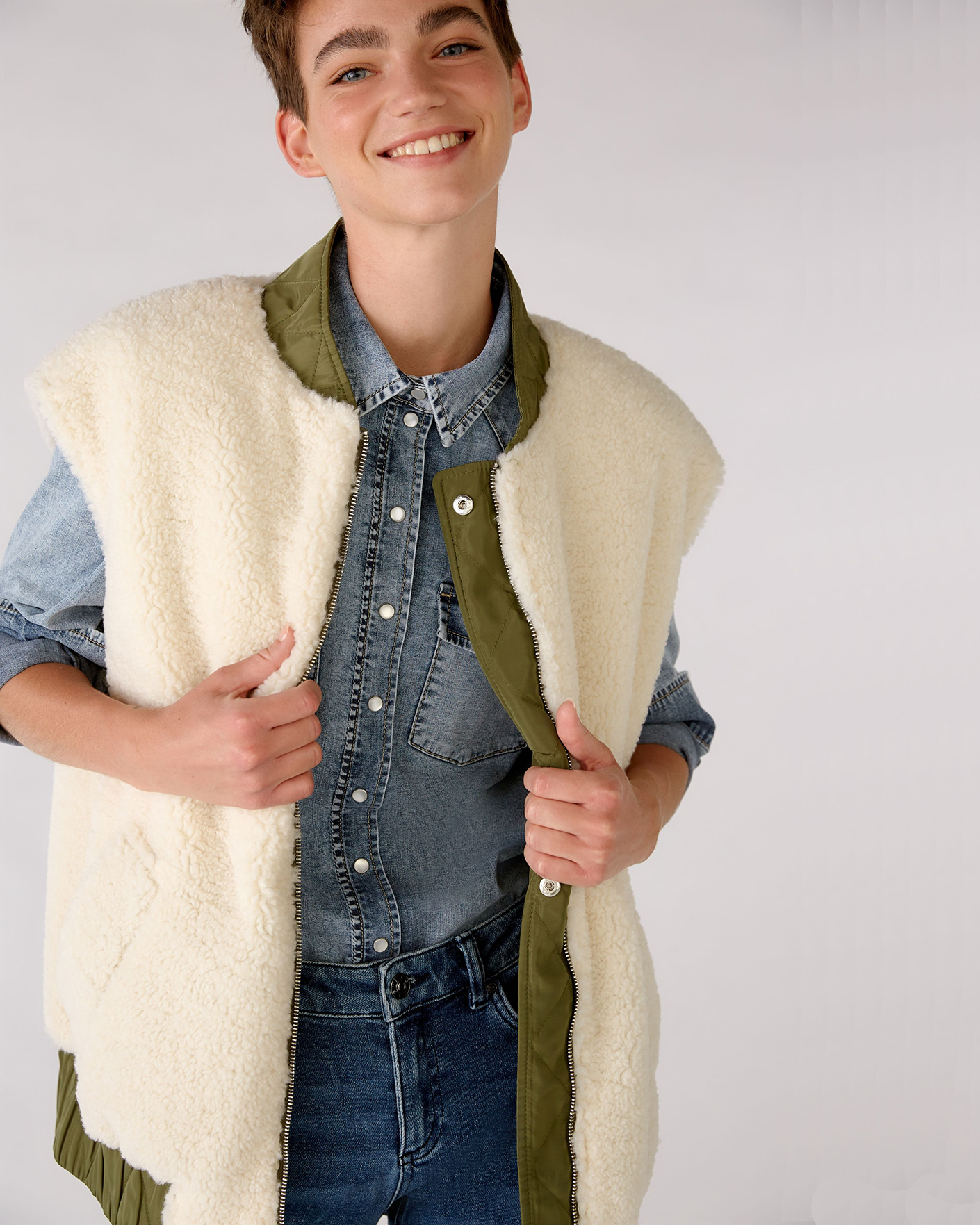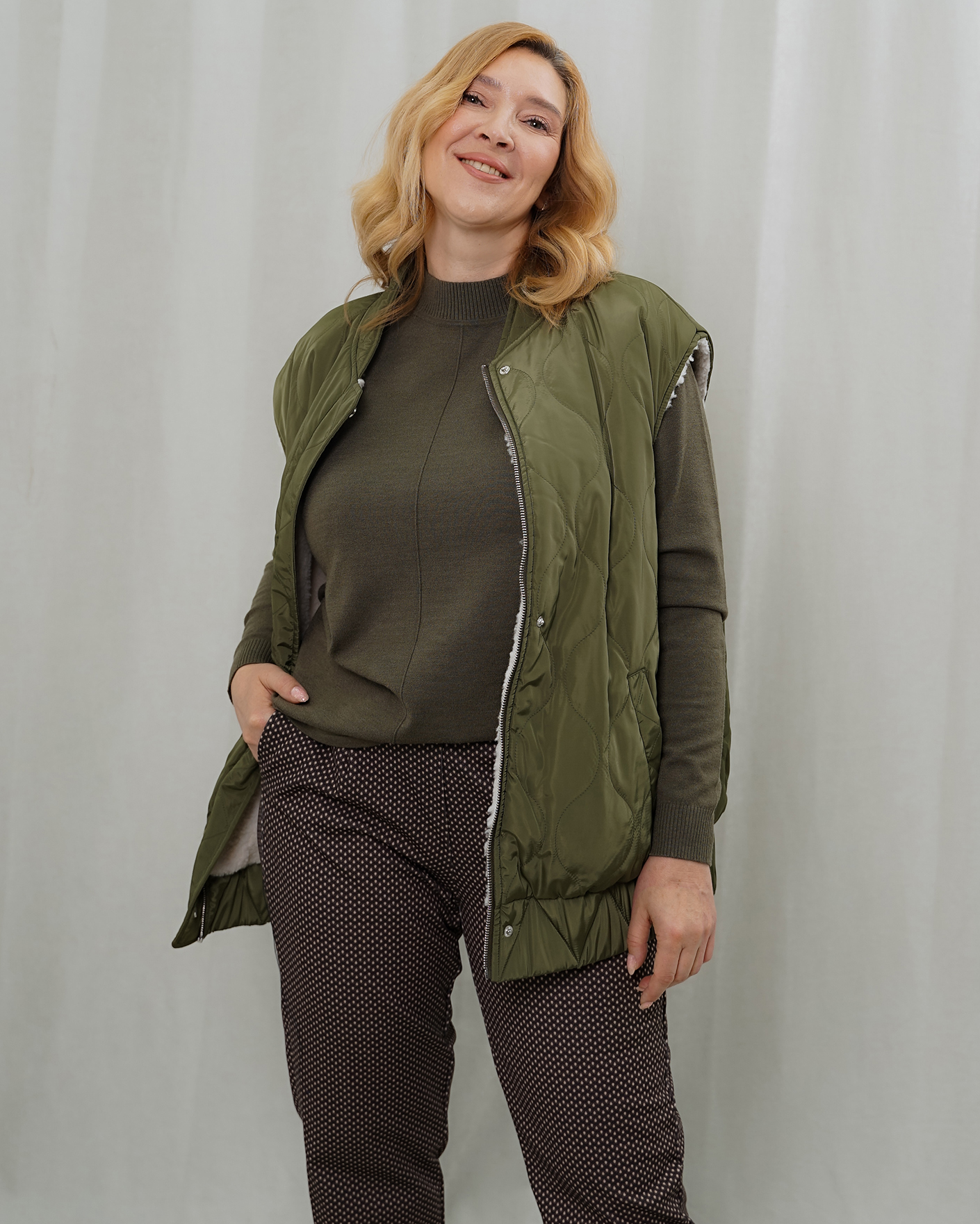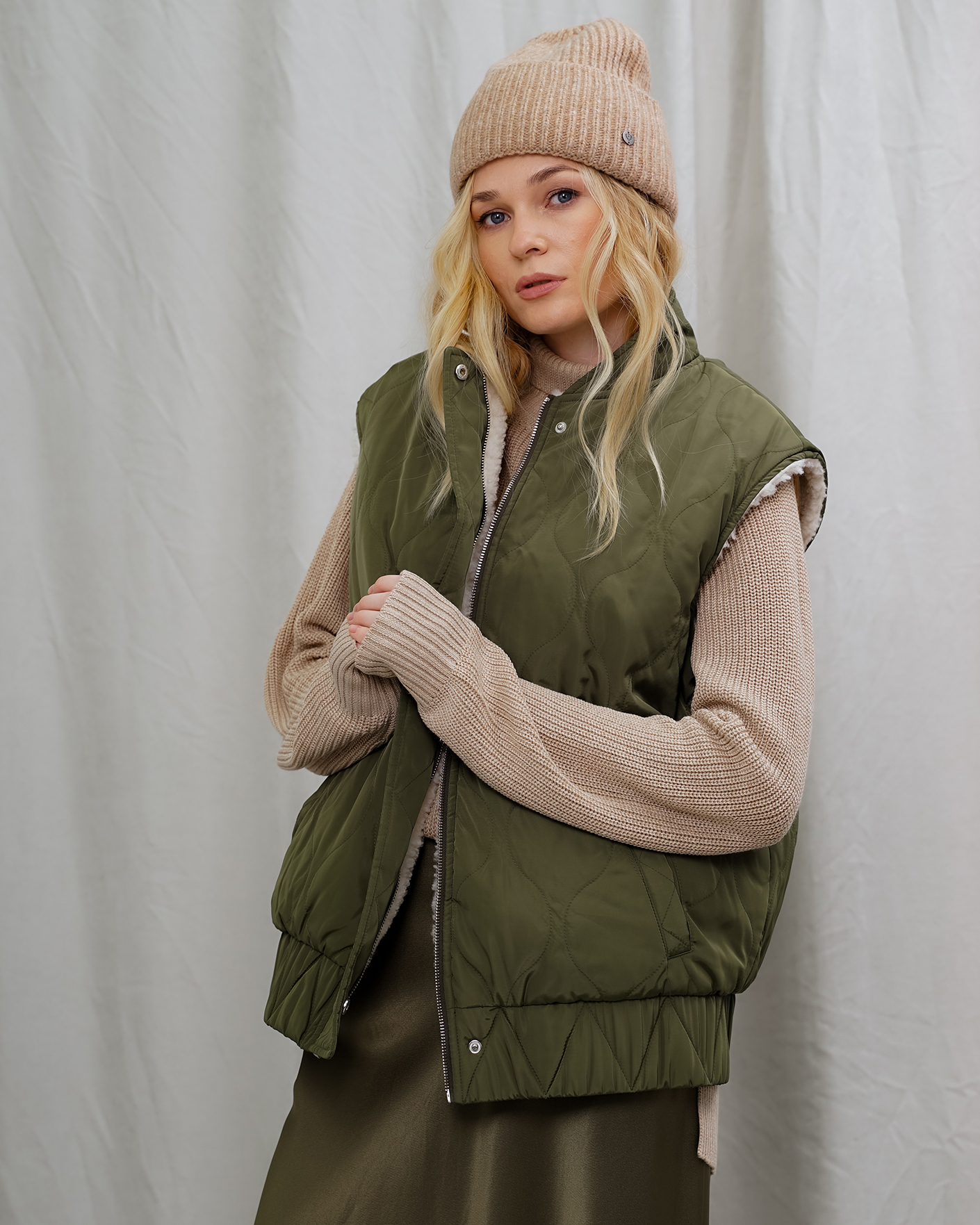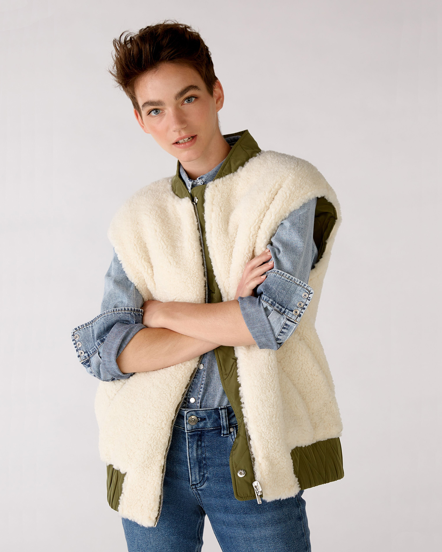 Утепленный жилет OUI цвета хаки и белого. Модель можно носить с двух сторон: стеганой или меховой наружу. Удлиненный ворот, застежка на молнию и планку на кнопки. Имеются карманы по бокам и широкая резинке в складку по низу. Стильный жилет станет фаворитом вашего гардероба и подстроится под настроение дня.