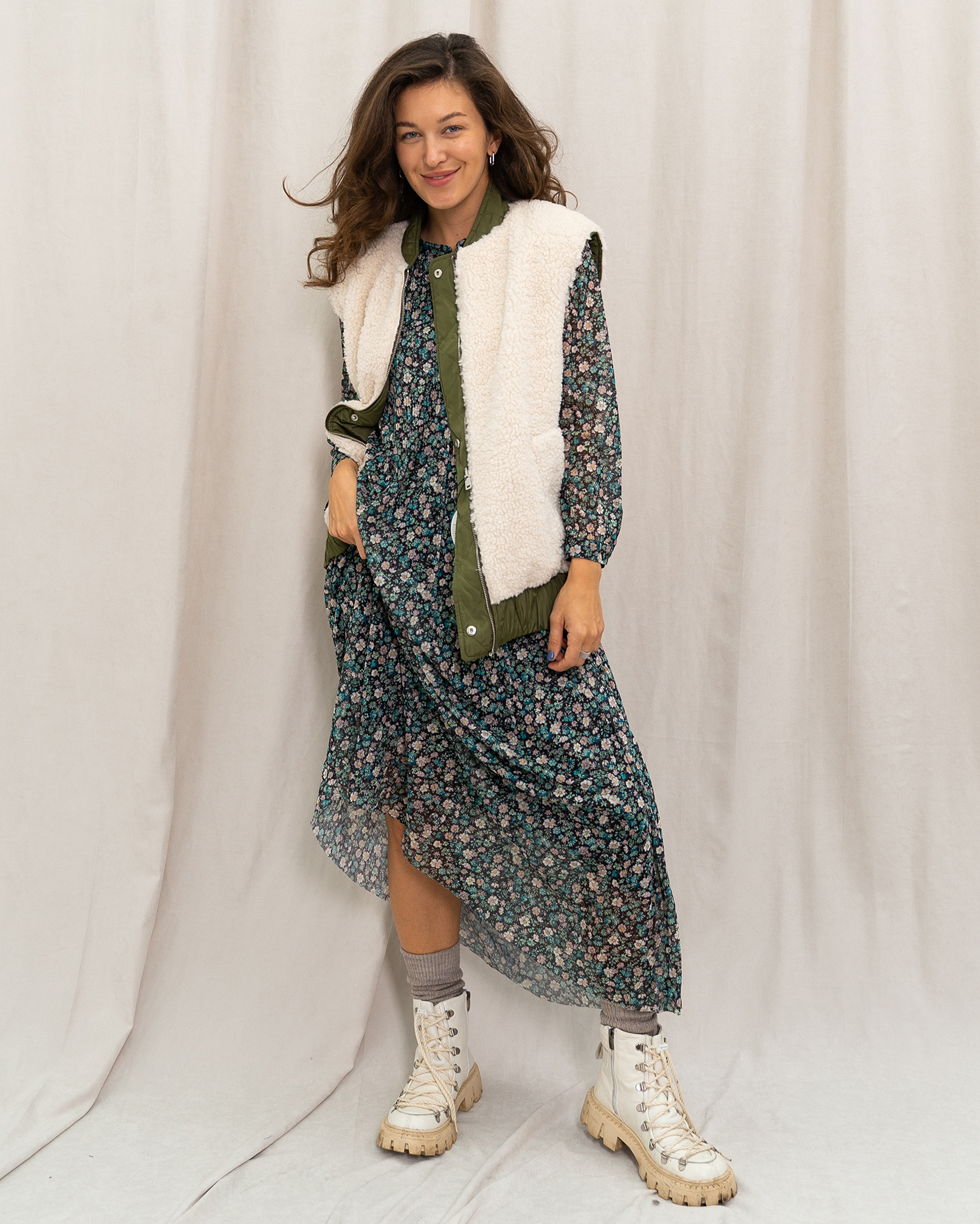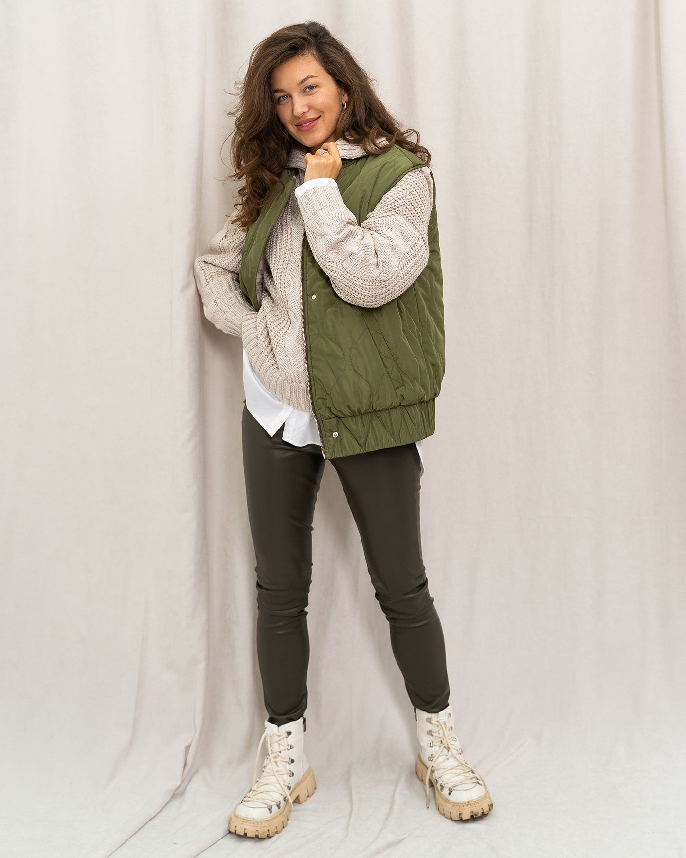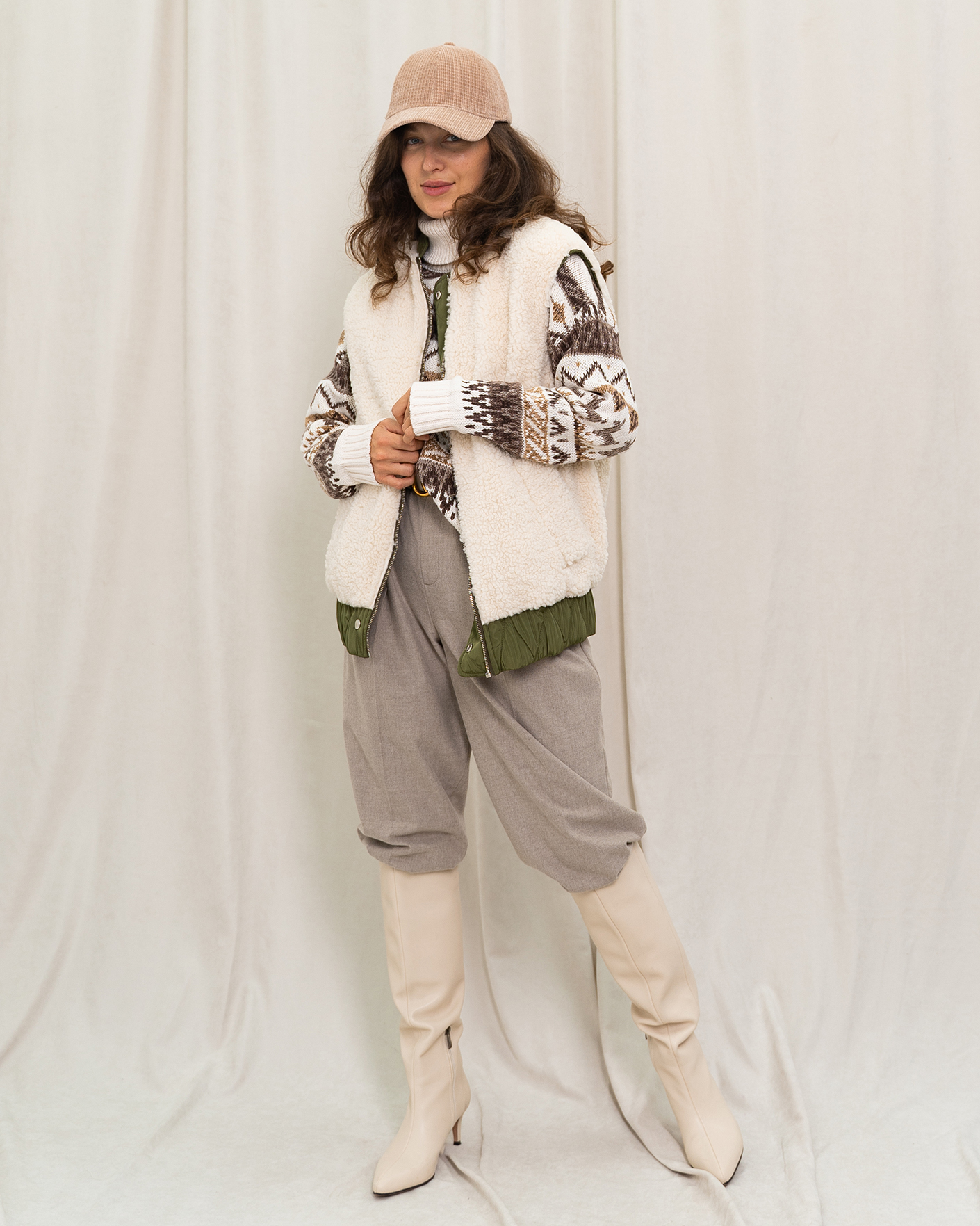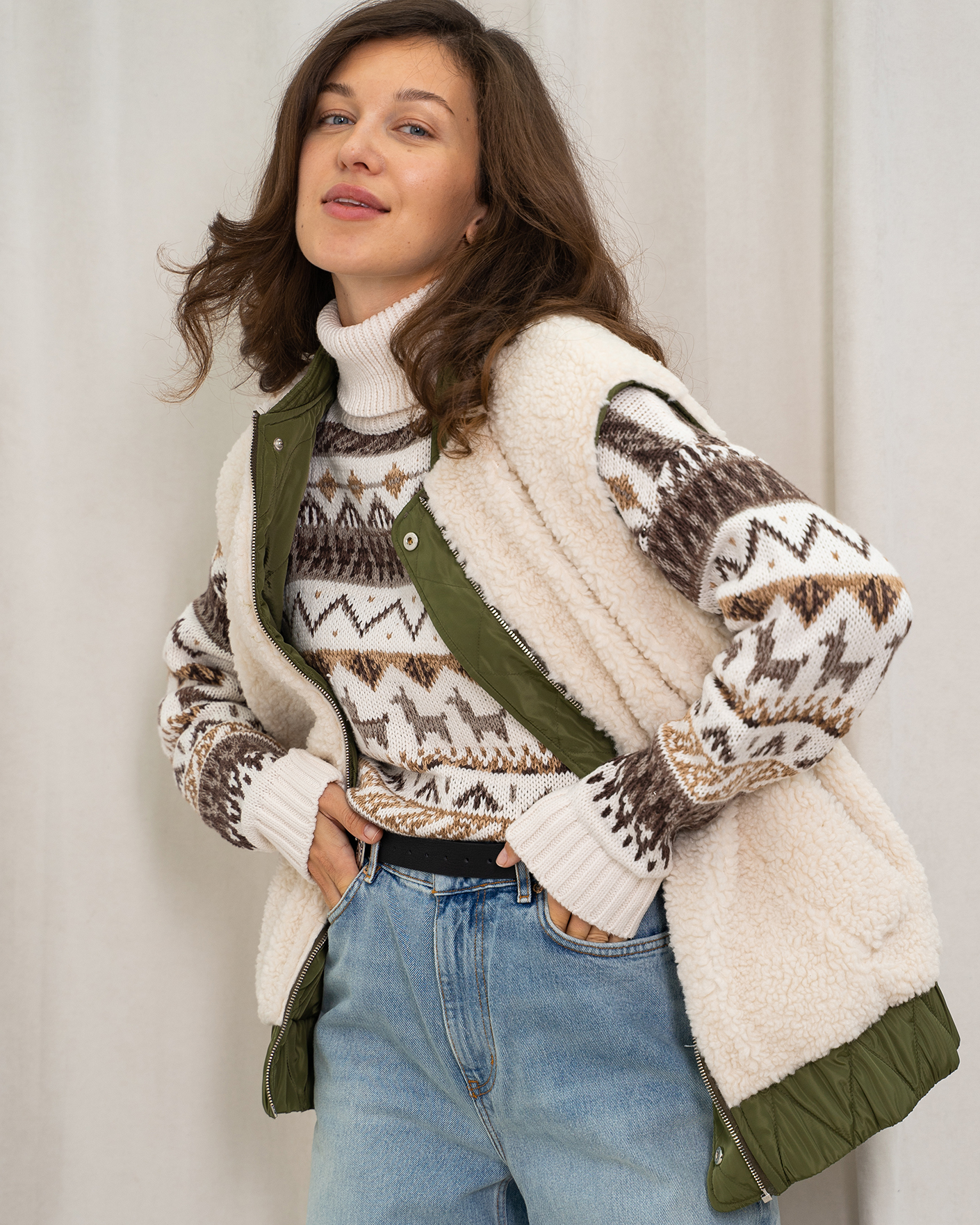 Утепленный жилет OUI цвета хаки и белого. Модель можно носить с двух сторон: стеганой или меховой наружу. Удлиненный ворот, застежка на молнию и планку на кнопки. Имеются карманы по бокам и широкая резинке в складку по низу. Стильный жилет станет фаворитом вашего гардероба и подстроится под настроение дня.
