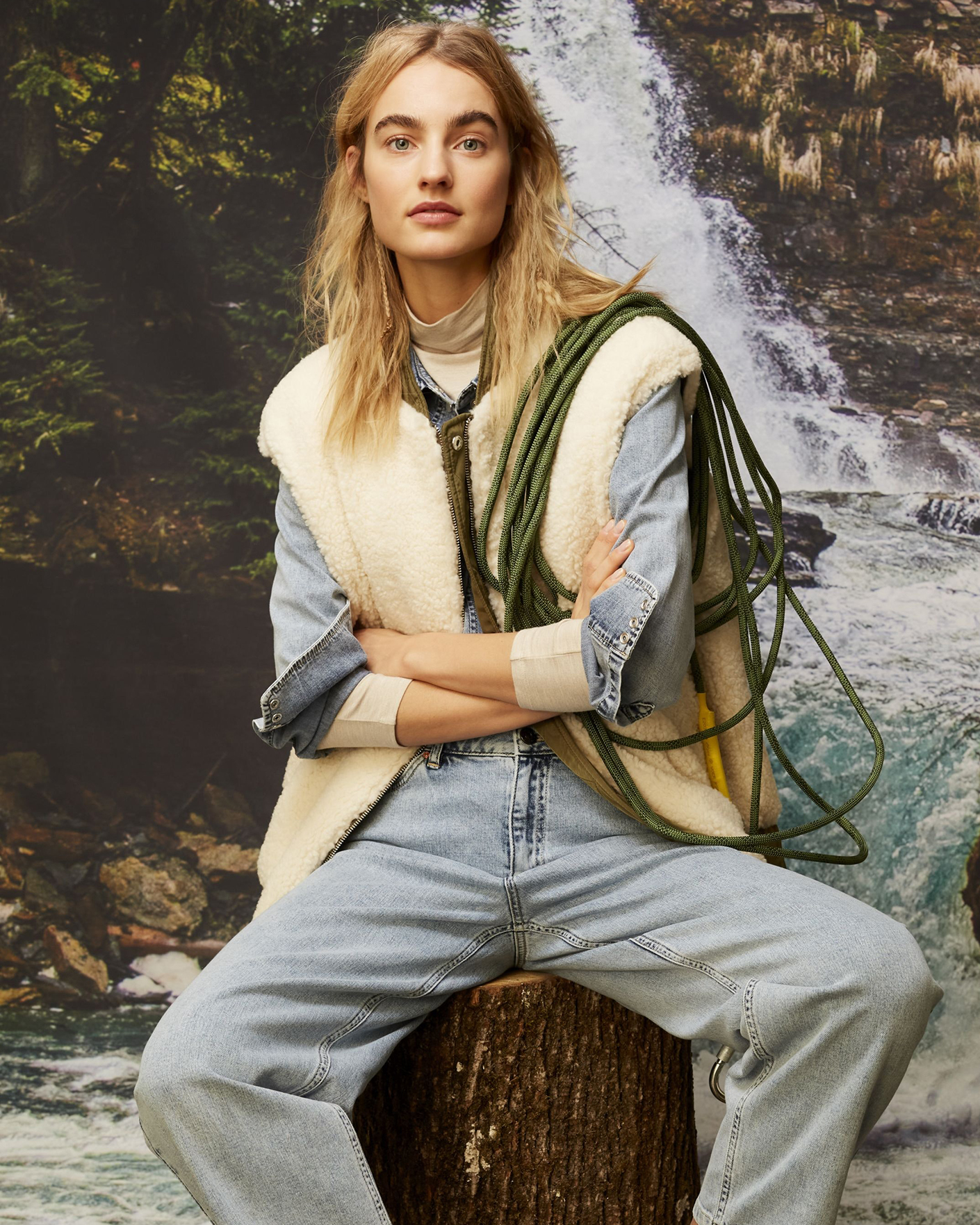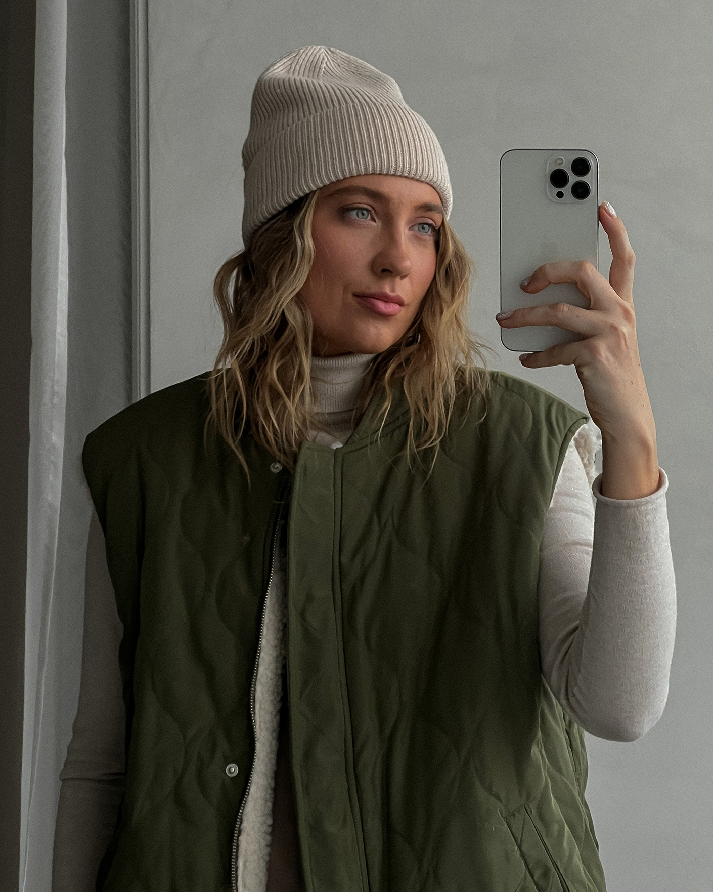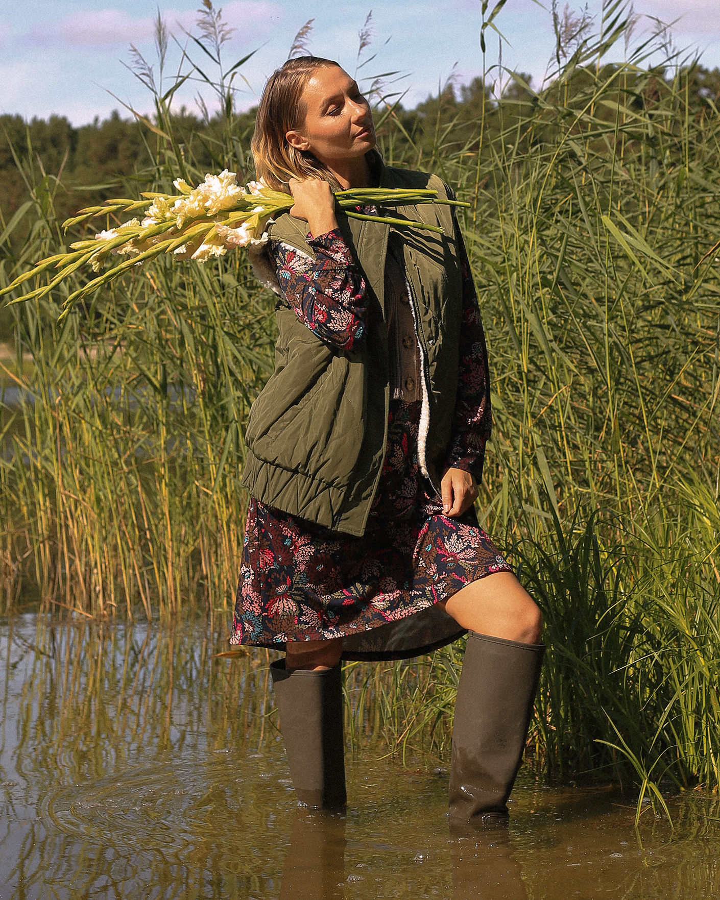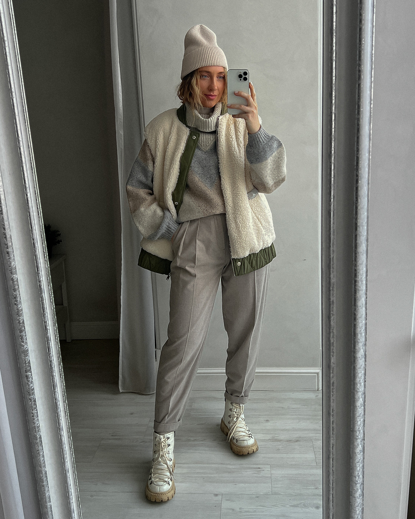 Утепленный жилет OUI цвета хаки и белого. Модель можно носить с двух сторон: стеганой или меховой наружу. Удлиненный ворот, застежка на молнию и планку на кнопки. Имеются карманы по бокам и широкая резинке в складку по низу. Стильный жилет станет фаворитом вашего гардероба и подстроится под настроение дня.