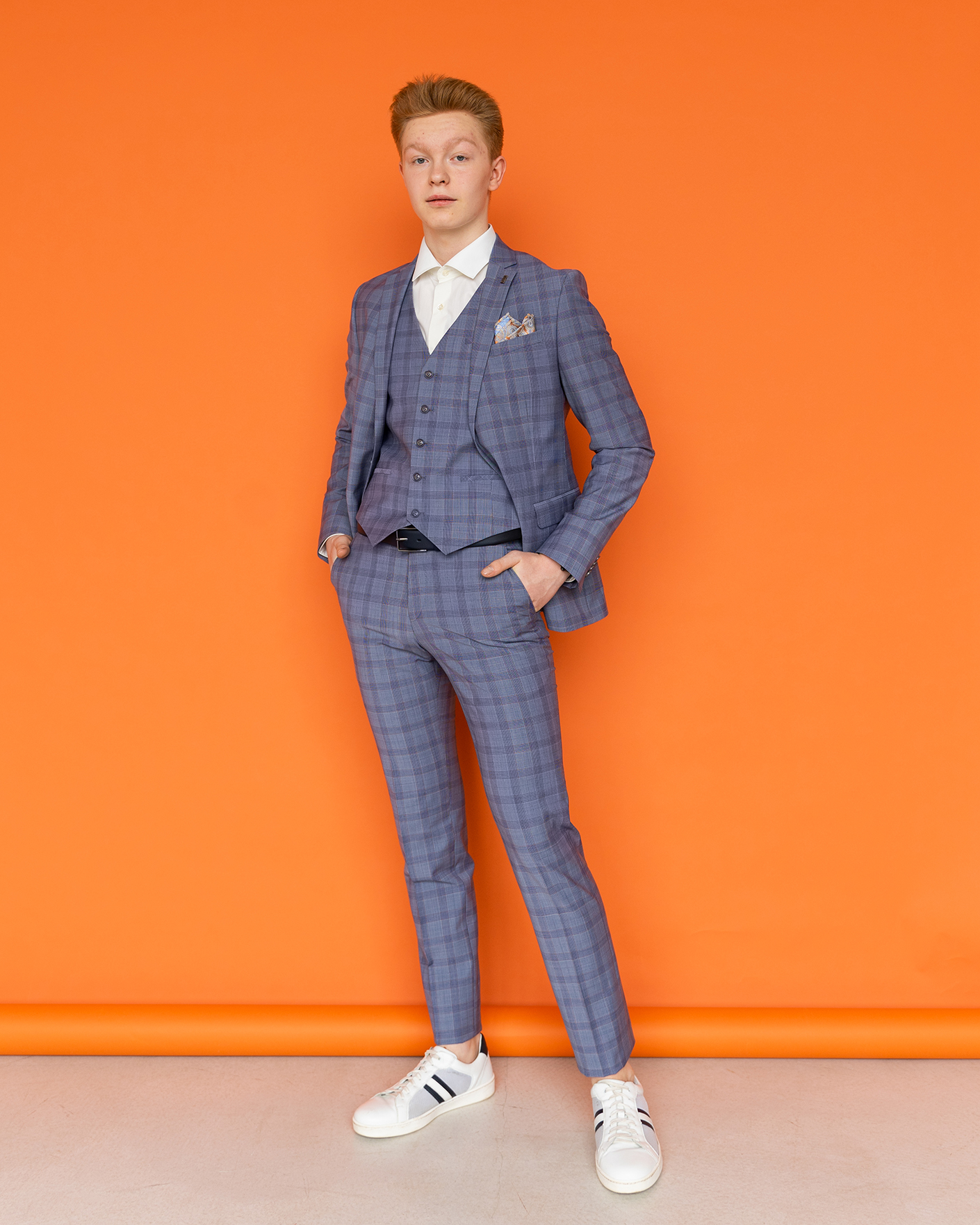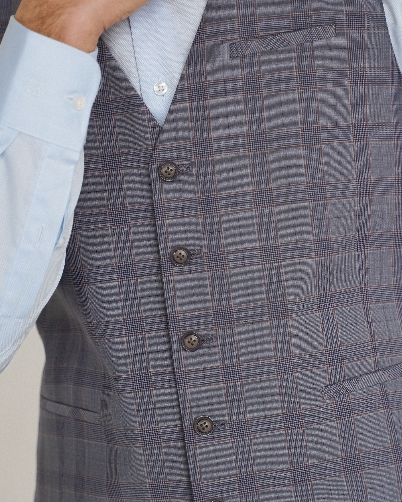 Классический жилет Lexmer серо-голубого цвета в мультиклетку. Модель с V-вырезом, заостренным краем. Имеются врезные карманы по бокам. Жилет станет идеальным дополнением к праздничному образу.