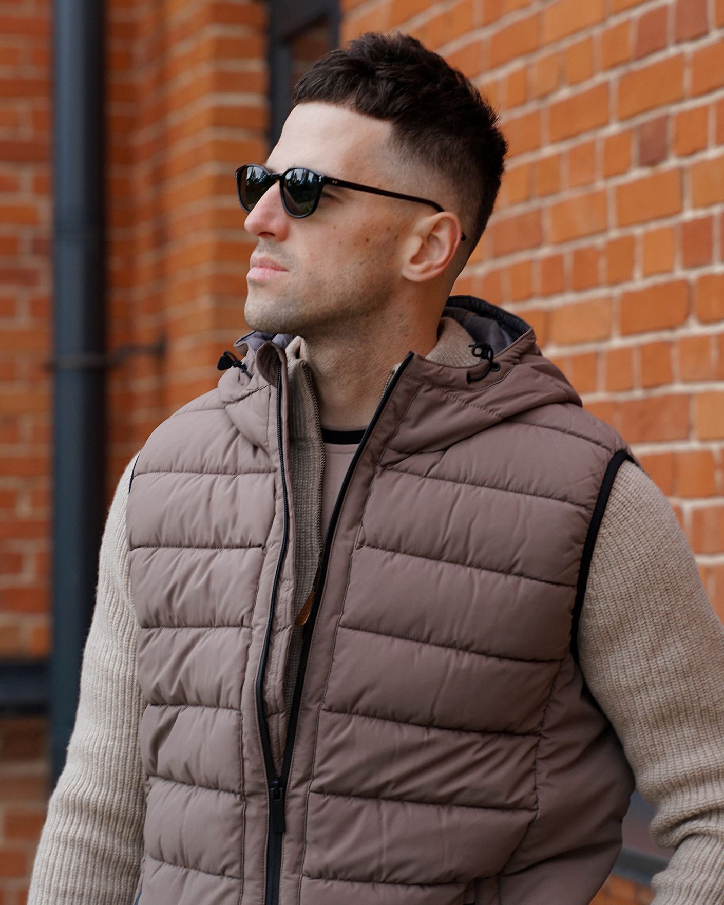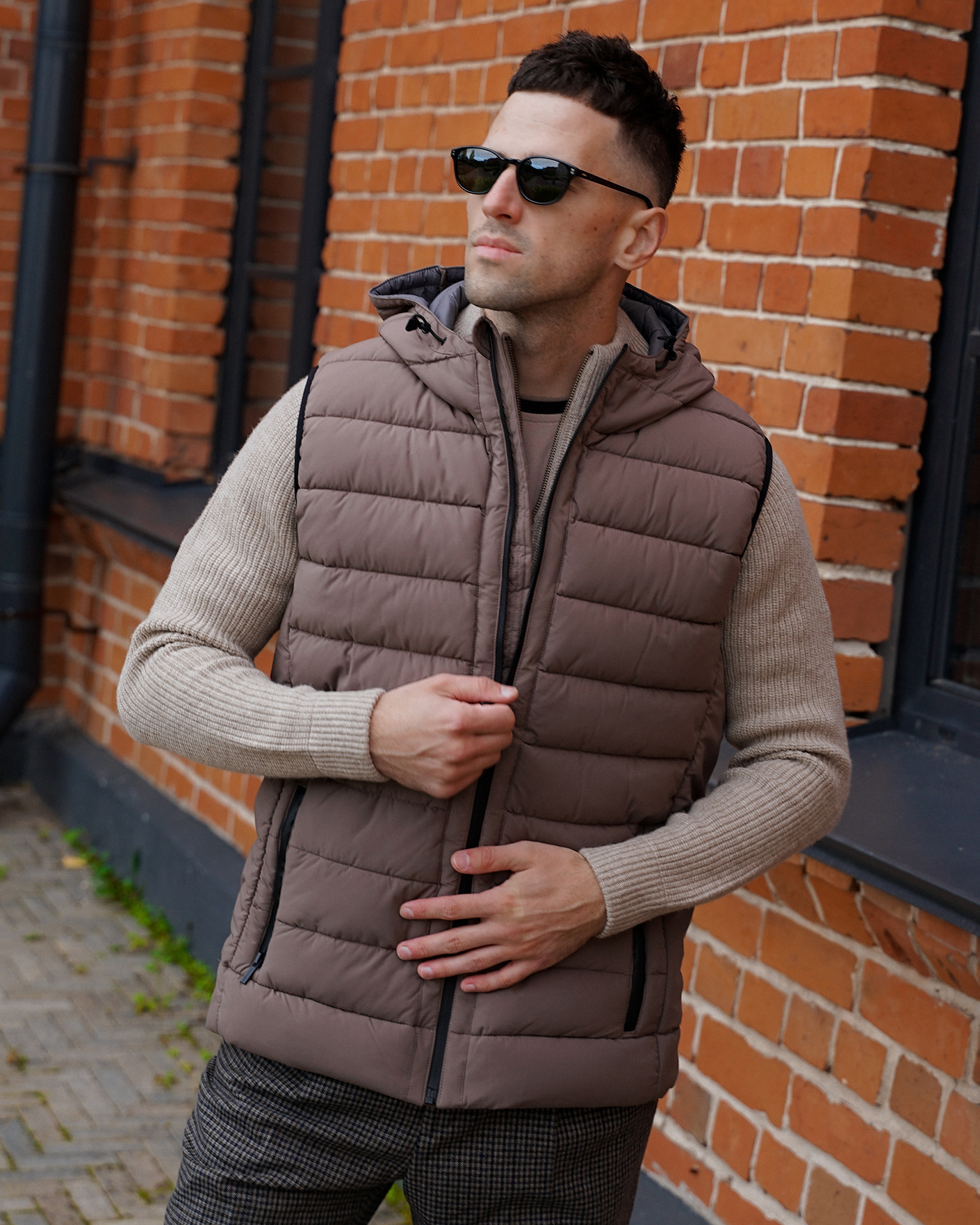 Утепленный жилет Commander серо-бежевого цвета в горизонтальную стежку. Модель с воротником-стойка, с регулируемым капюшоном, застежка и боковые карманы на молнии. Жилет - универсальная вещь на каждый день.