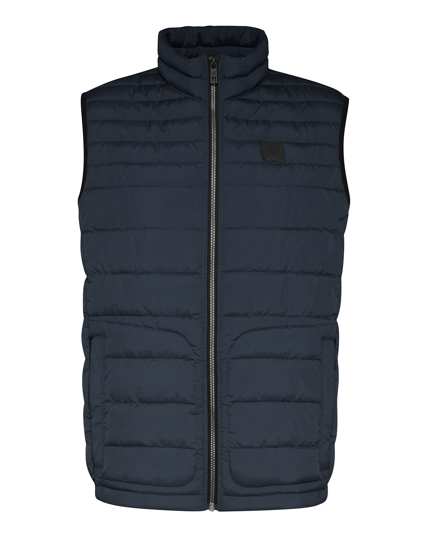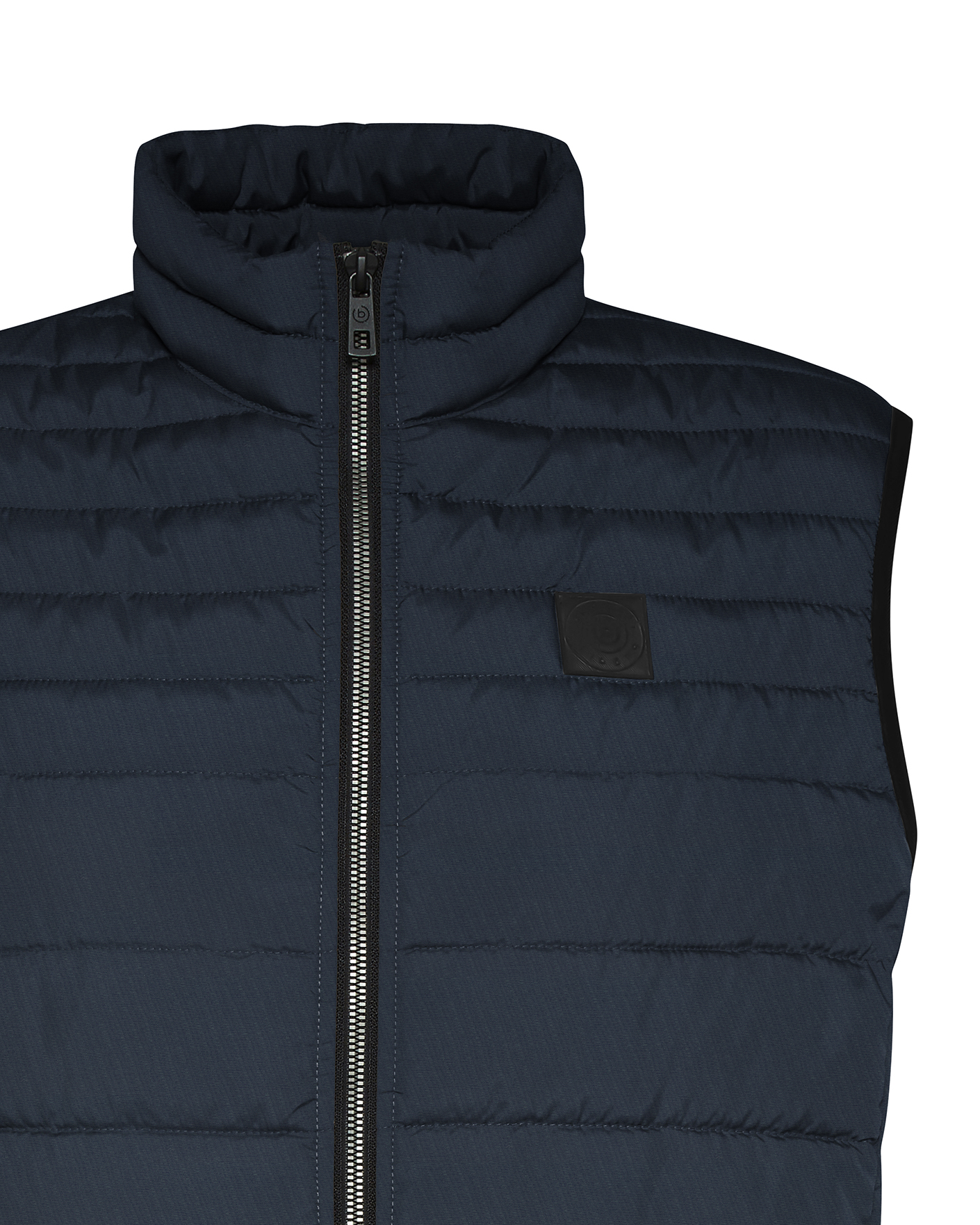 Утепленный жилет Bugatti синего цвета в горизонтальную стежку. Модель с воротником-стойка, застежка и боковые карманы на молнии в тон. Жилет отлично впишется в ваш гардероб в прохладную погоду.
