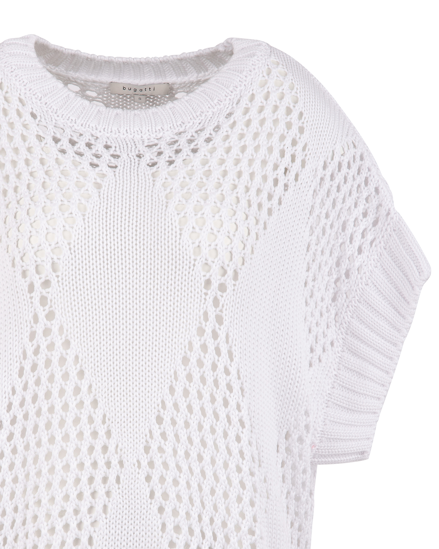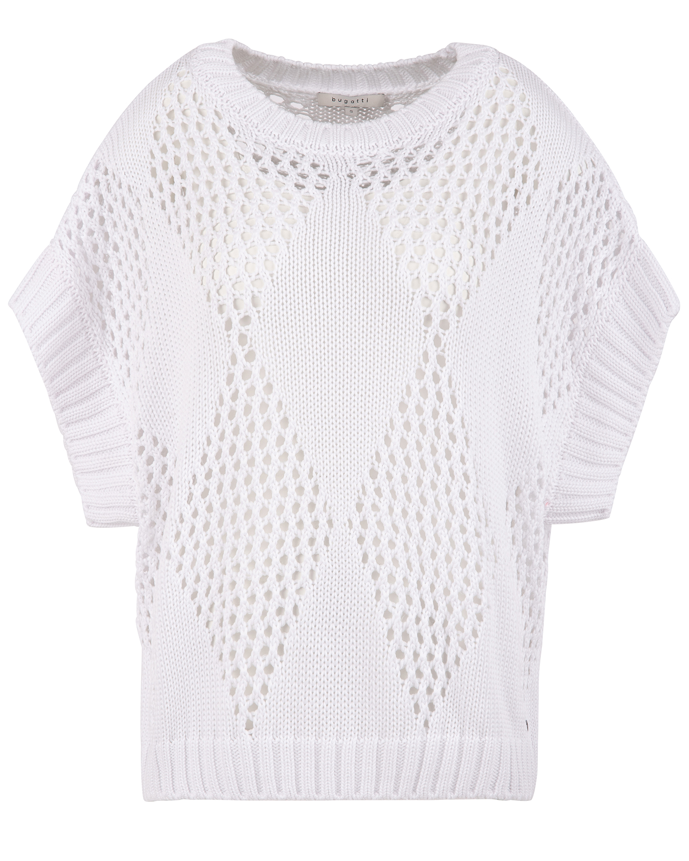 Свободный жилет Bugatti белого цвета в ажурный крупный рисунок. Модель с круглым вырезом, спущенной линией плеча и низом на тонкой вывязаной резинке. Жилет отлично впишется в ваш гардероб.