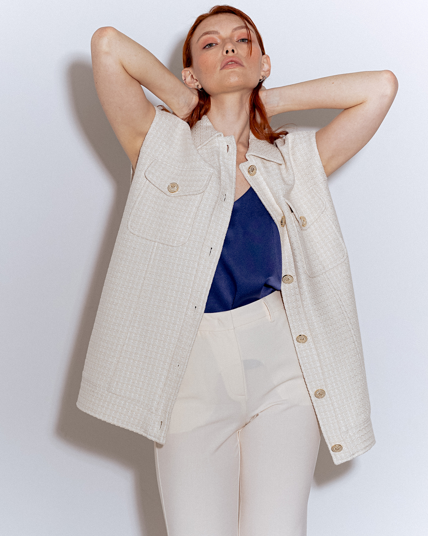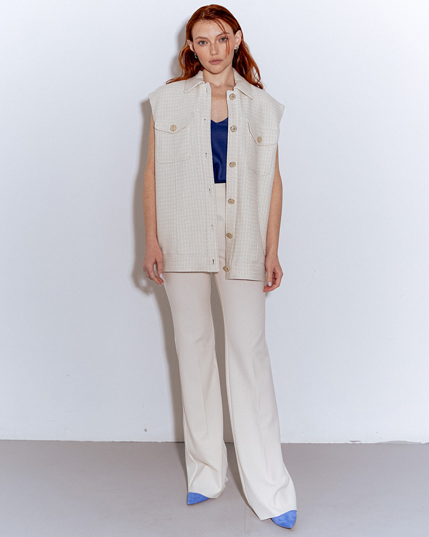 Твидовый жилет Marella светло-бежевог оцвета в текстурный рисунок. Удлиненная модель с отложным воротником и застежкой на крупные пуговицы в золотом цвете. Имеются накладные нагрудные карманы с клапанами на пуговице. Жилет можно сочетать с топом, футболкой, рубашкой, блузой, джемпером, водолазкой, юбкой и брюками.