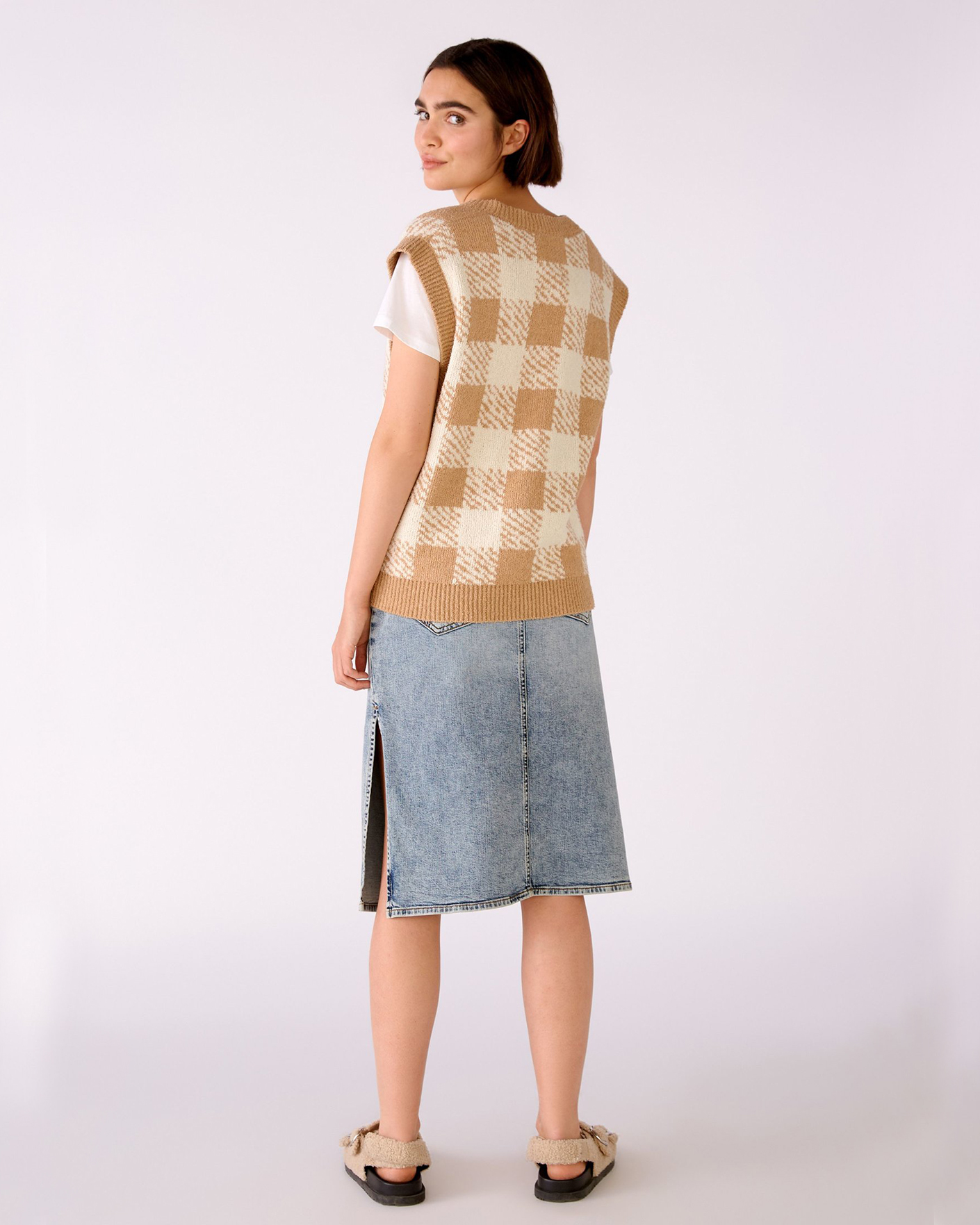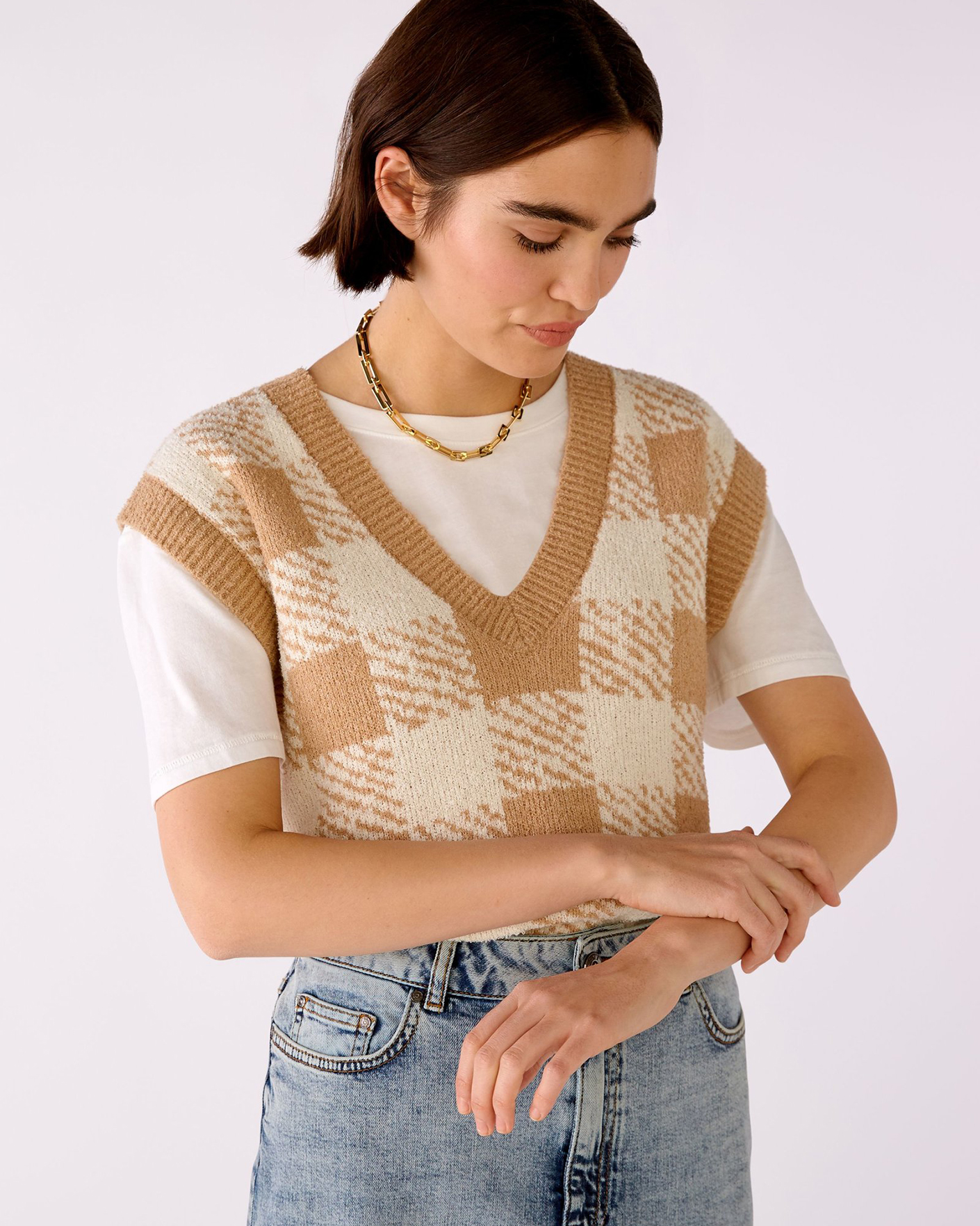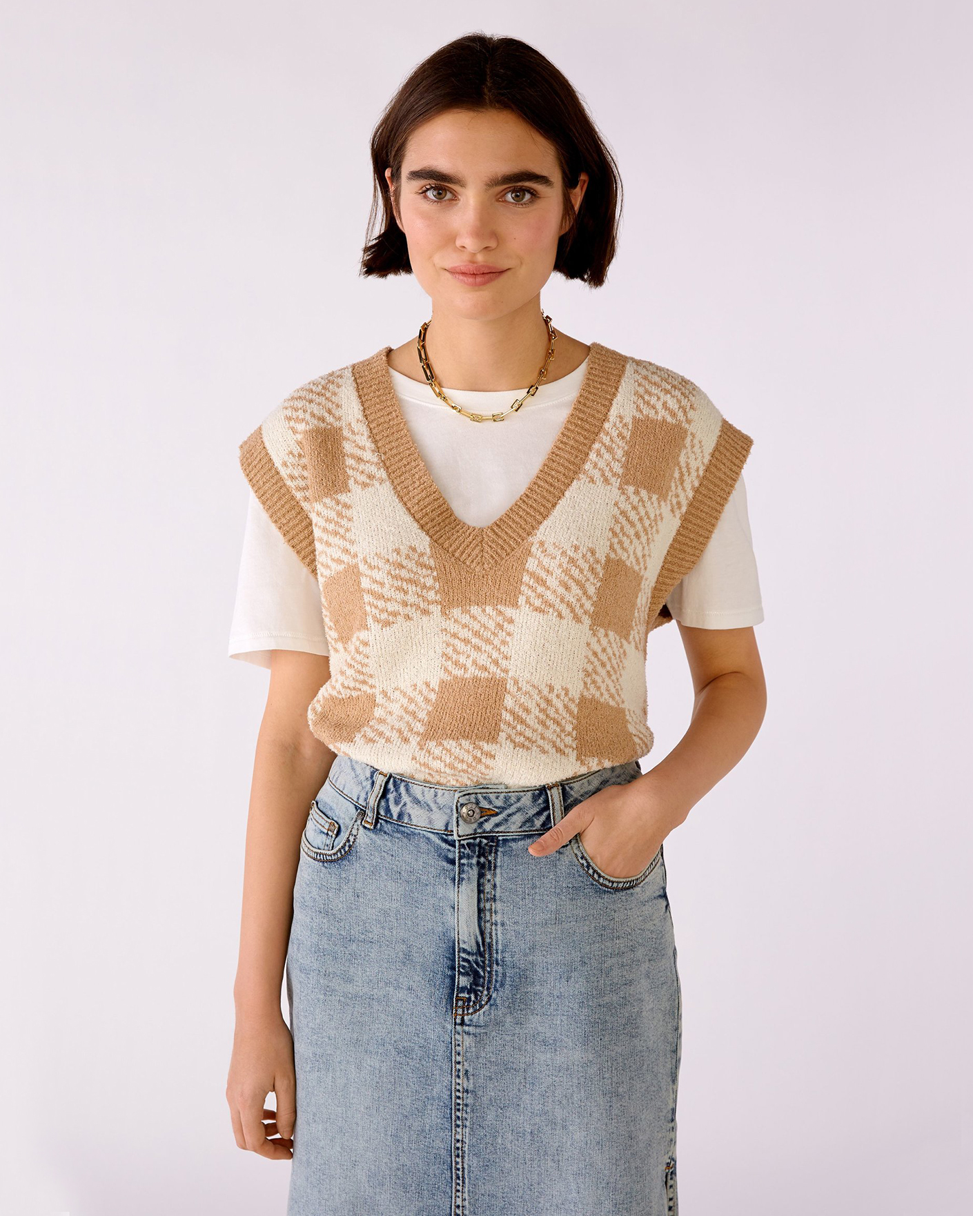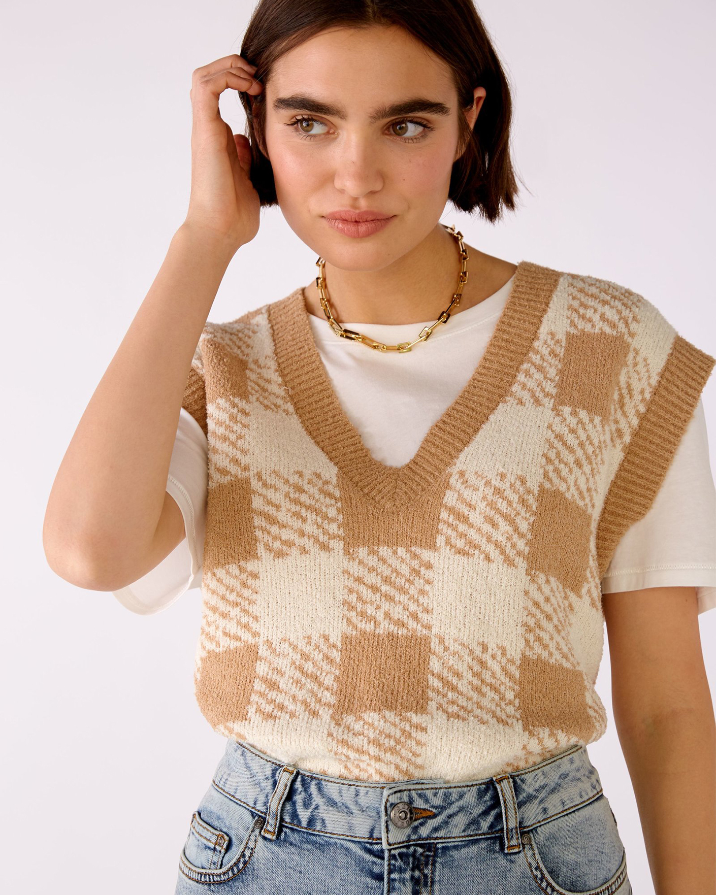 Свободный жилет OUI бело-бежевого цвета в крупную клетку. Текстурная модель с V-образным вырезом, спущенной линией плеча и низом на широкой тонкой резинке. Жилет можно сочетать с футболкой, тонкой водолазкой, рубашкой, блузой, платьем, юбкой и брюками.