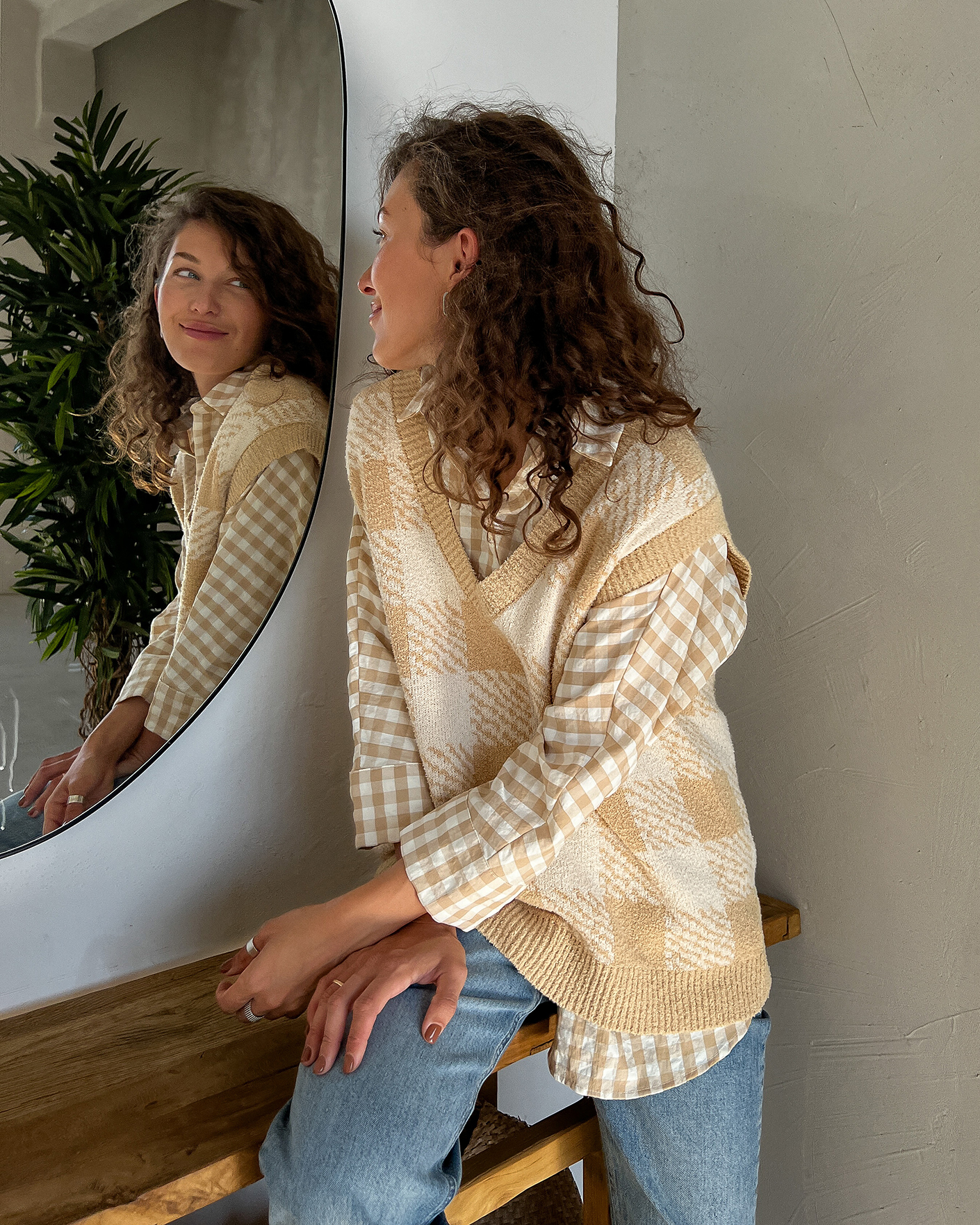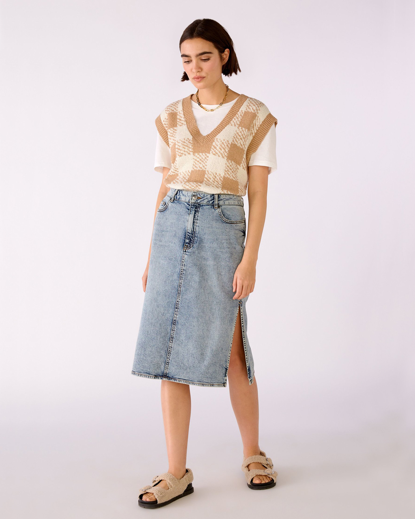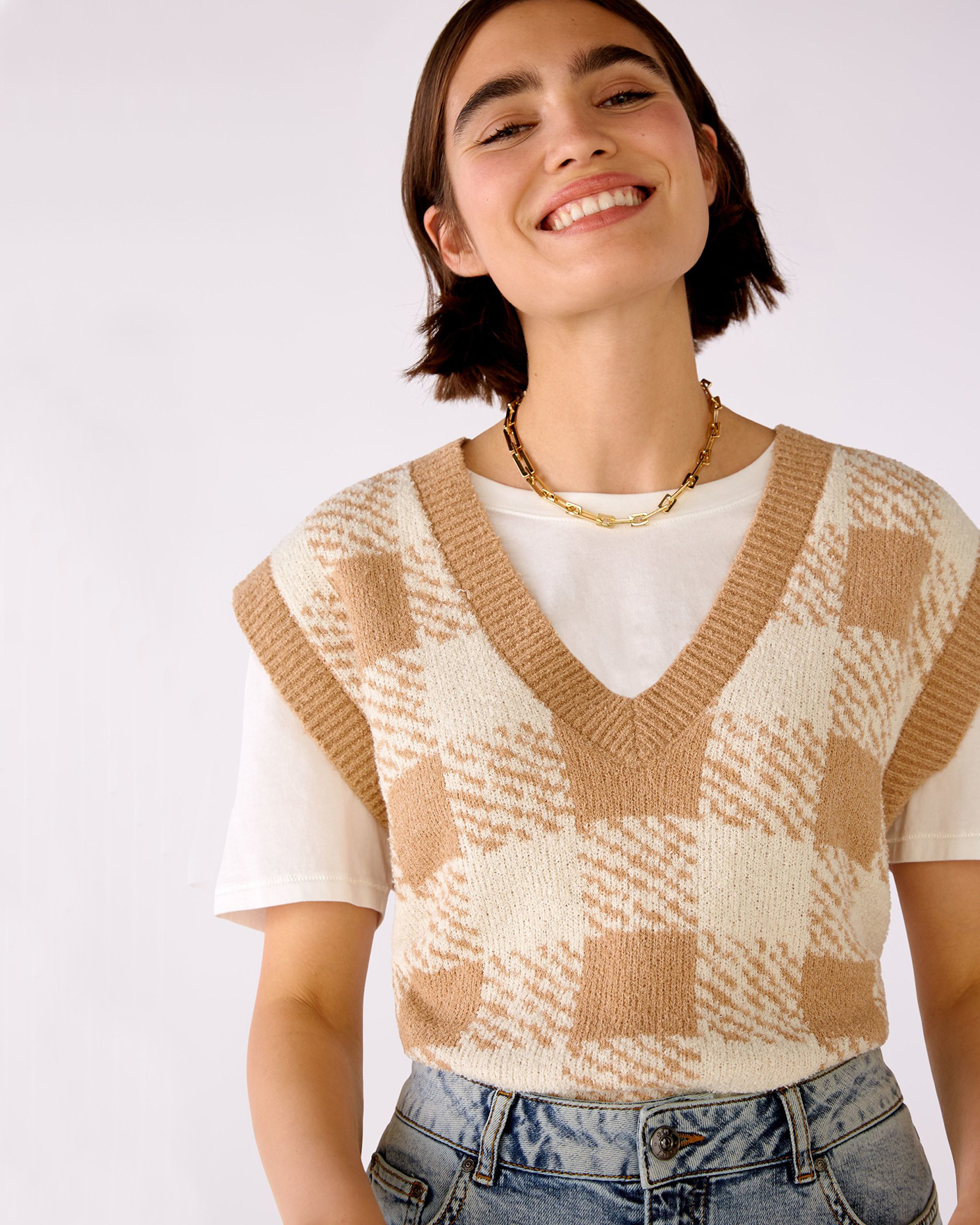Свободный жилет OUI бело-бежевого цвета в крупную клетку. Текстурная модель с V-образным вырезом, спущенной линией плеча и низом на широкой тонкой резинке. Жилет можно сочетать с футболкой, тонкой водолазкой, рубашкой, блузой, платьем, юбкой и брюками.